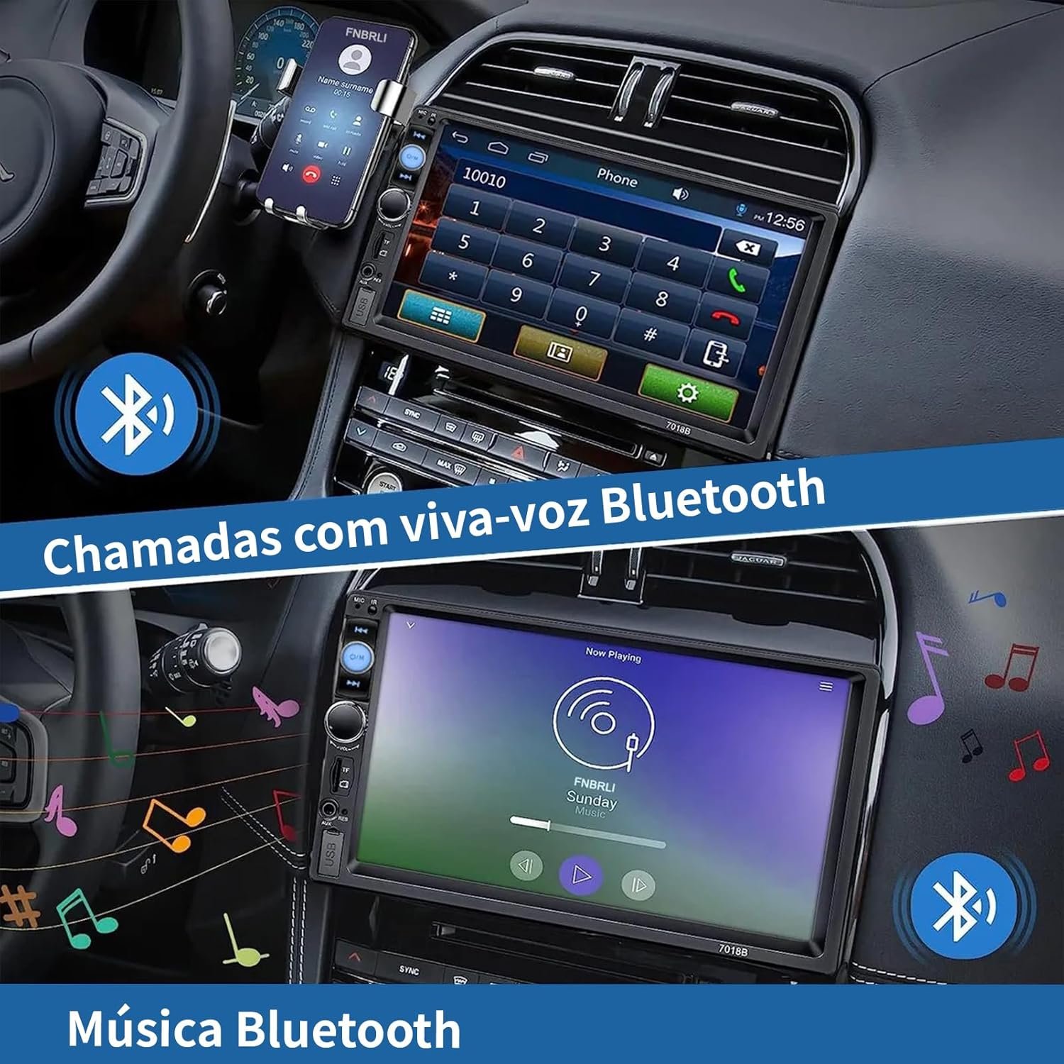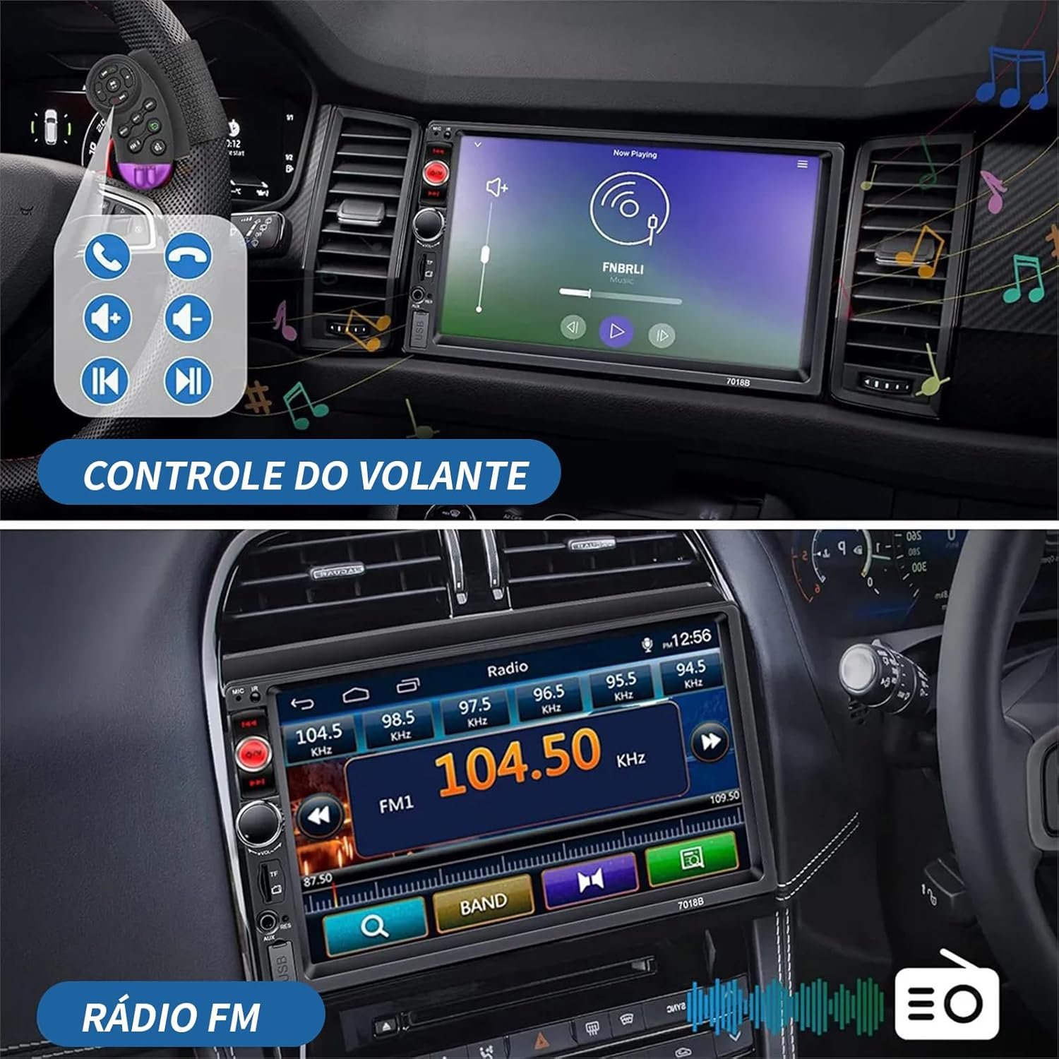 1DIN Estéreo para Carro, Central Multimidia Automotivo 7 Polegadas, Mirror Link, Bluetooth, Controle no Volante, Câmera Traseira Inclusa – Compatível com iPhone e Android
