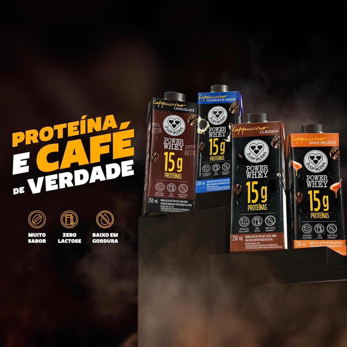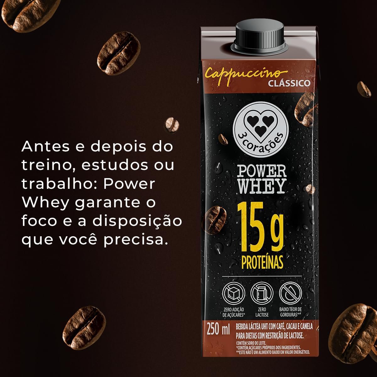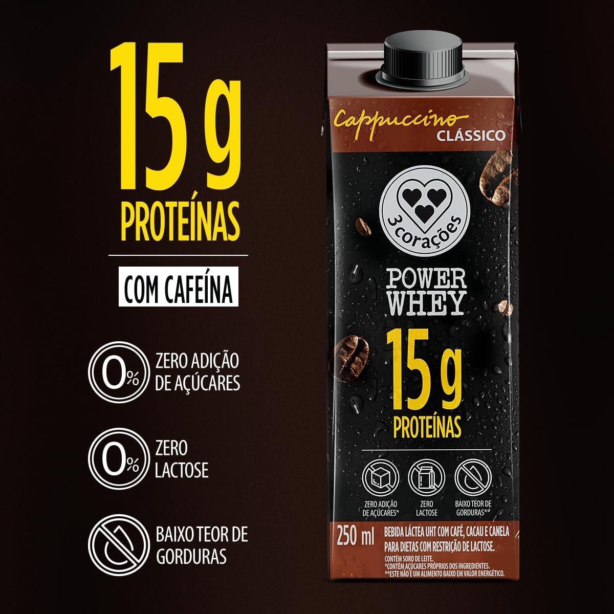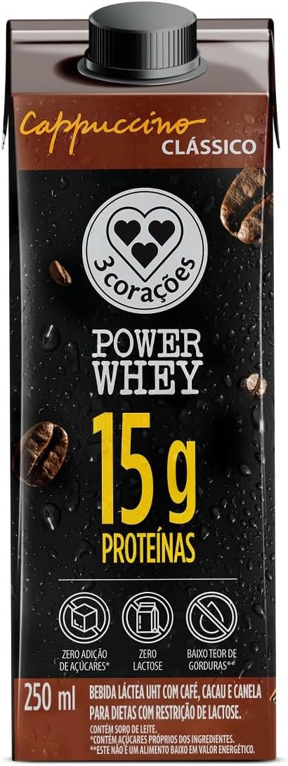 3 Corações Bebida Láctea Cappuccino Power Whey Clássico 15g de Proteína com Cafeína 250ml – 12 unidades