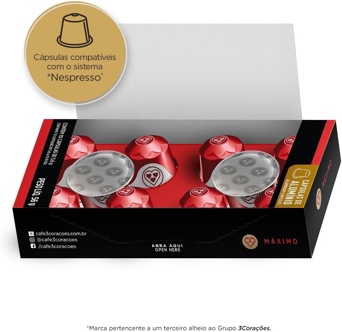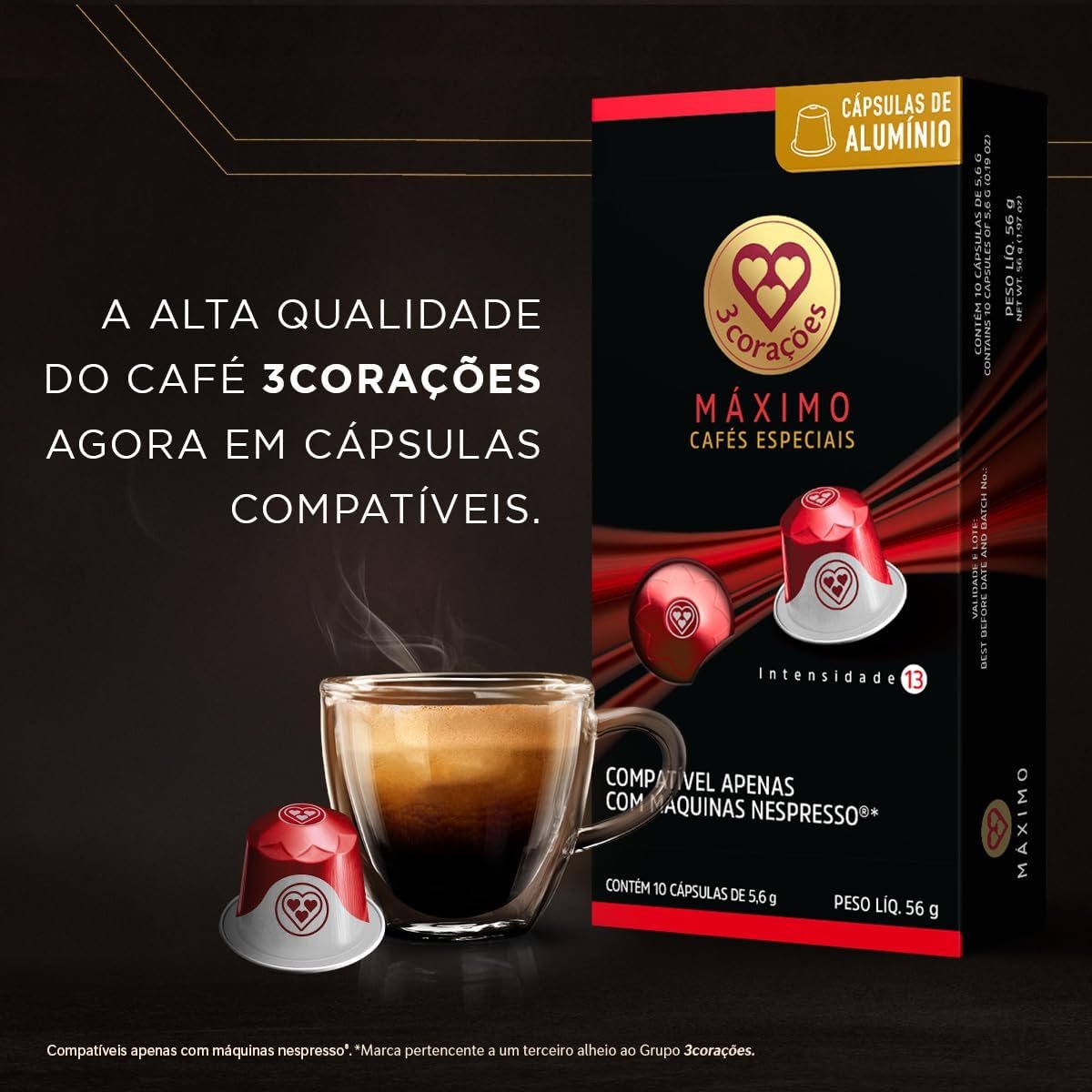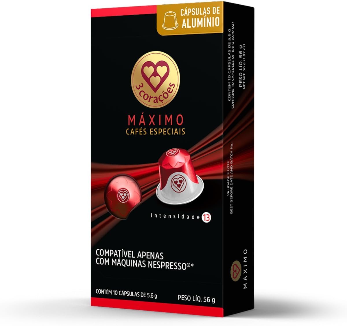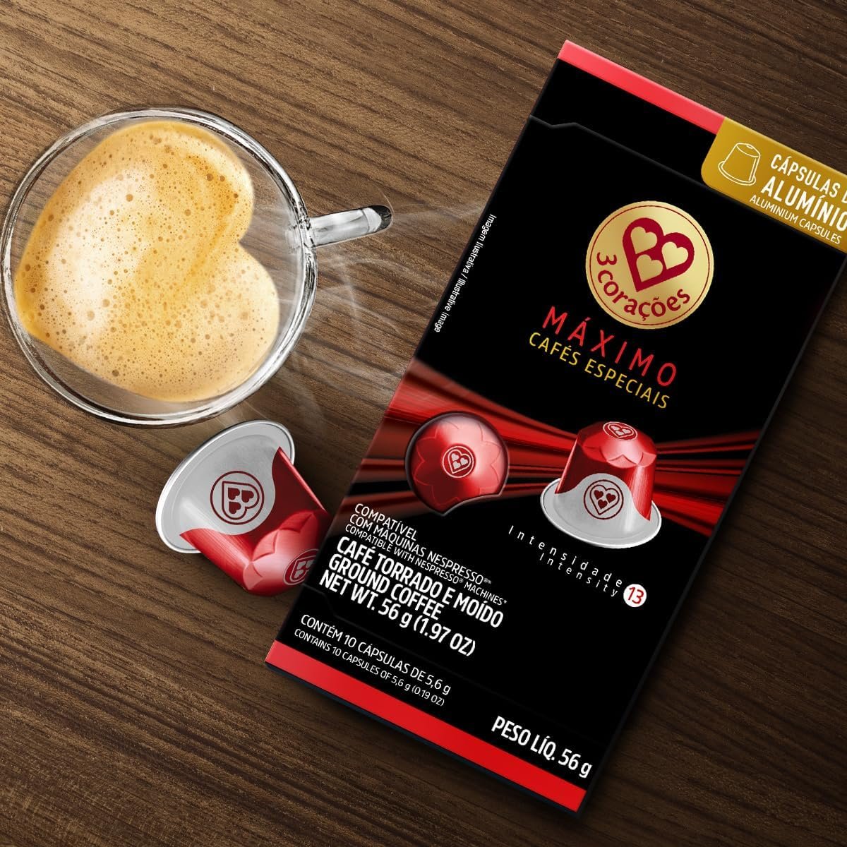 3 Corações Cápsulas de Café Máximo Intensidade 13, Compatíveis com Nespresso, contém 10 cápsulas
