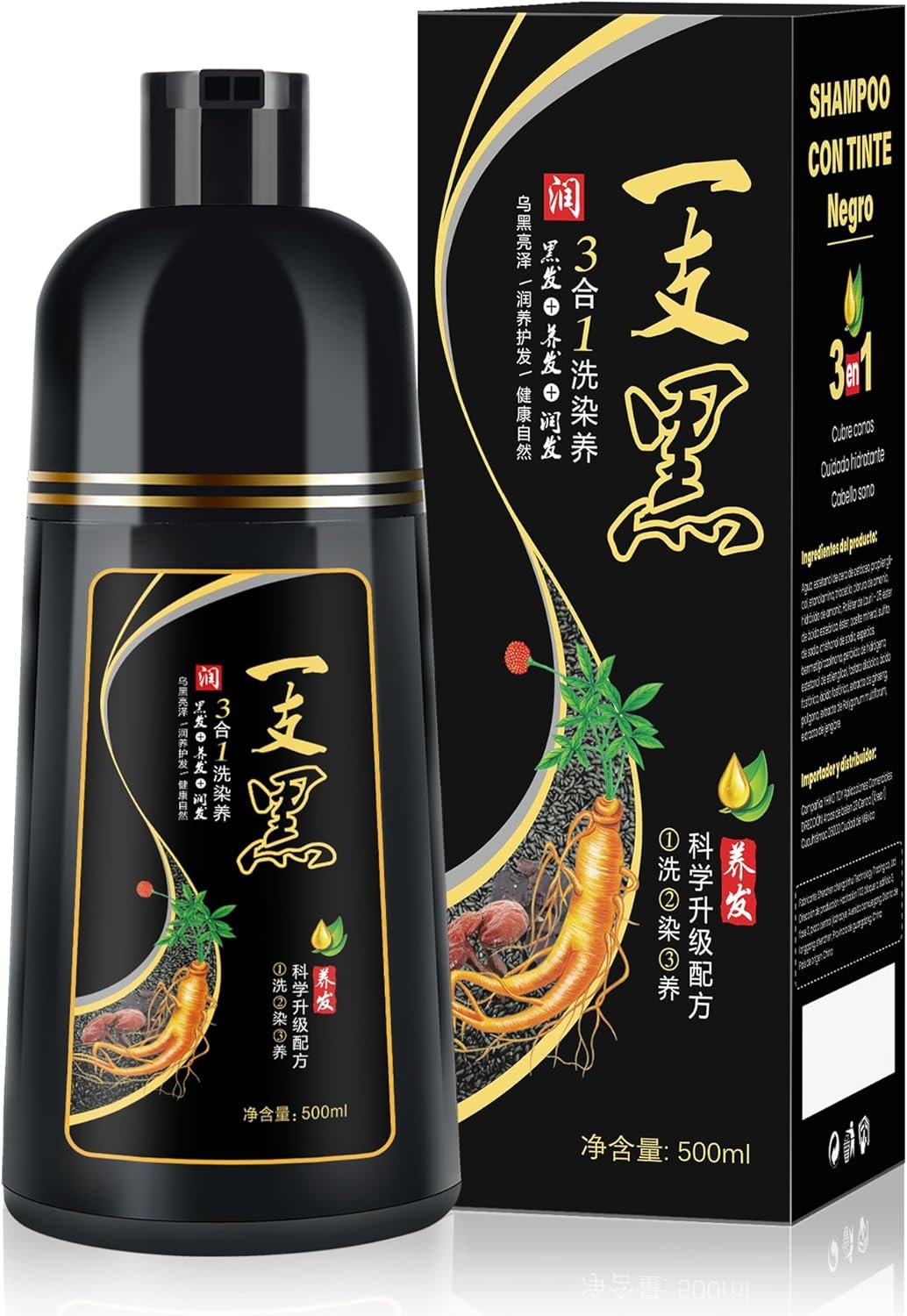 500ml Shampoo de Tintura 3 em 1 Preto Natural, Ingredientes a base de ervas para mulheres e homens, Tintura em minutos/semi-permanente