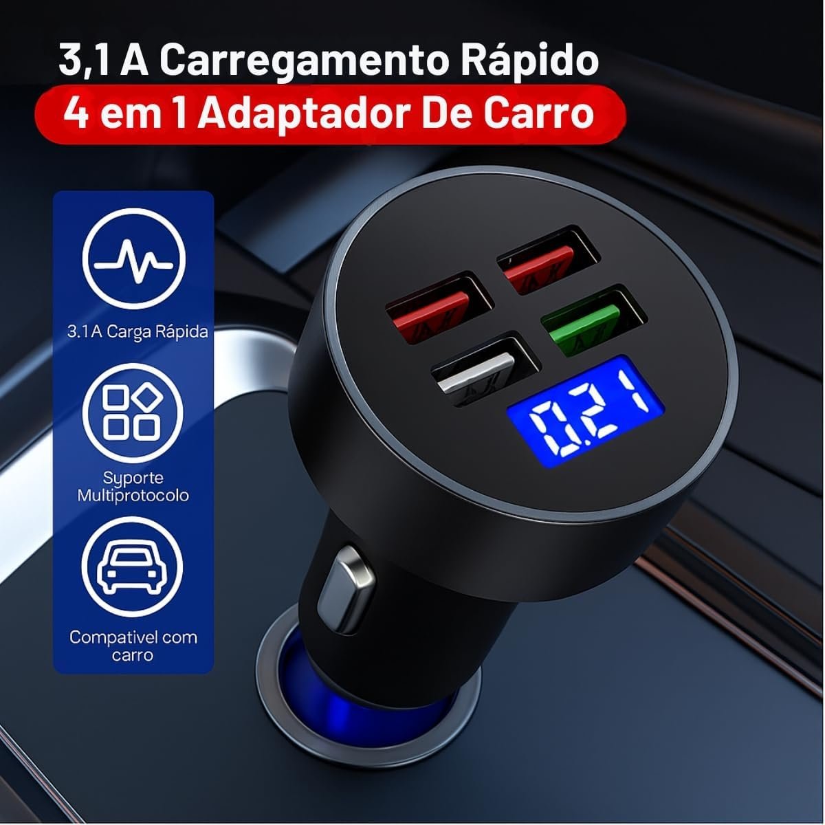 Adaptador De Carro 12V Carregador Super Rápido para Celular Turbo 4 Entradas Portatil USB Automotivo Viagem Carro