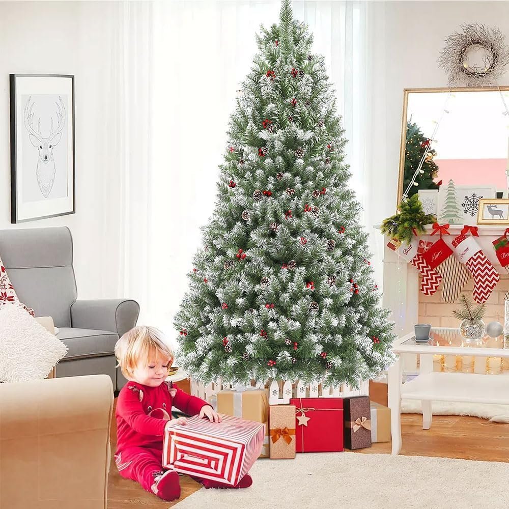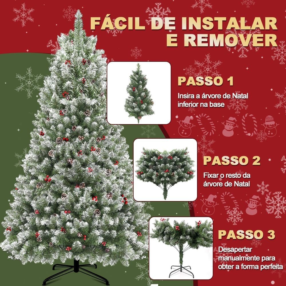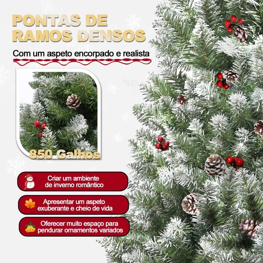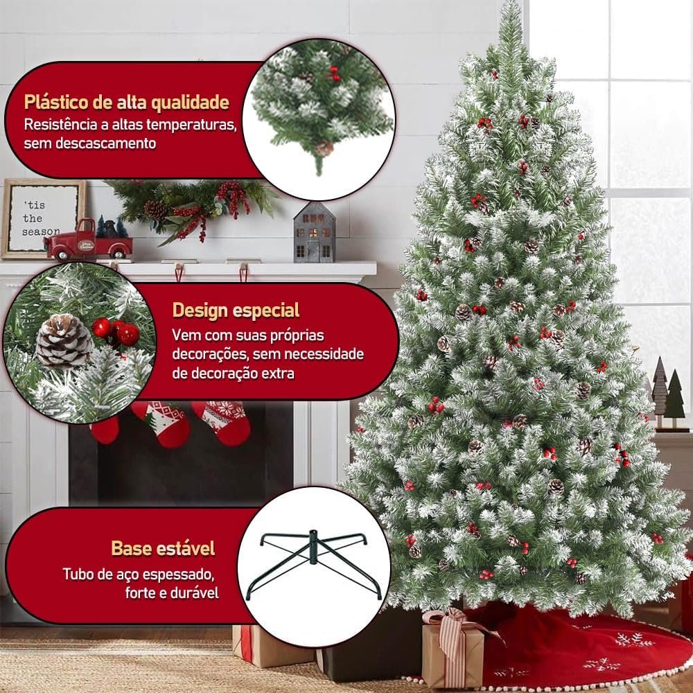 Título do Produto: Árvore de Natal 1,80m 850 Galhos com Base de Metal – Verde com Cerejas, Neve e Pinhas