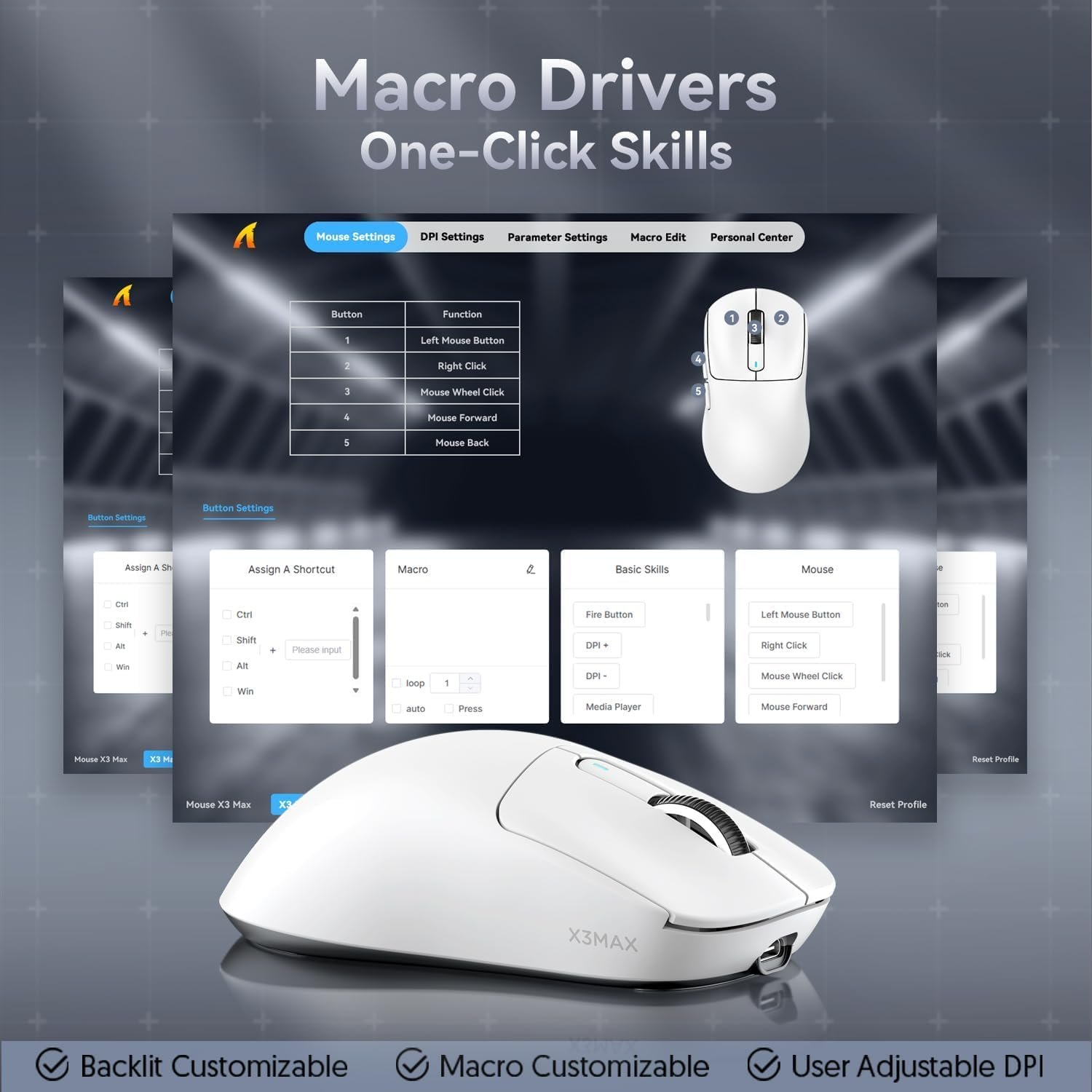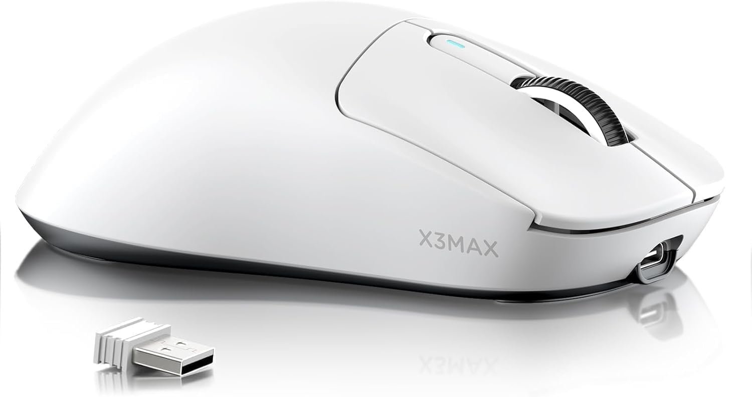 ATTACK SHARK X3MAX Mouse sem fio para jogos, PixArt PAW3950 42000 DPI, 49g Ultralight Tri-Mode BT5.4/2.4GHz/com fio, taxa de pesquisa de 1K, programável, bateria de 200 horas para PC/MAC/Win(Branco)