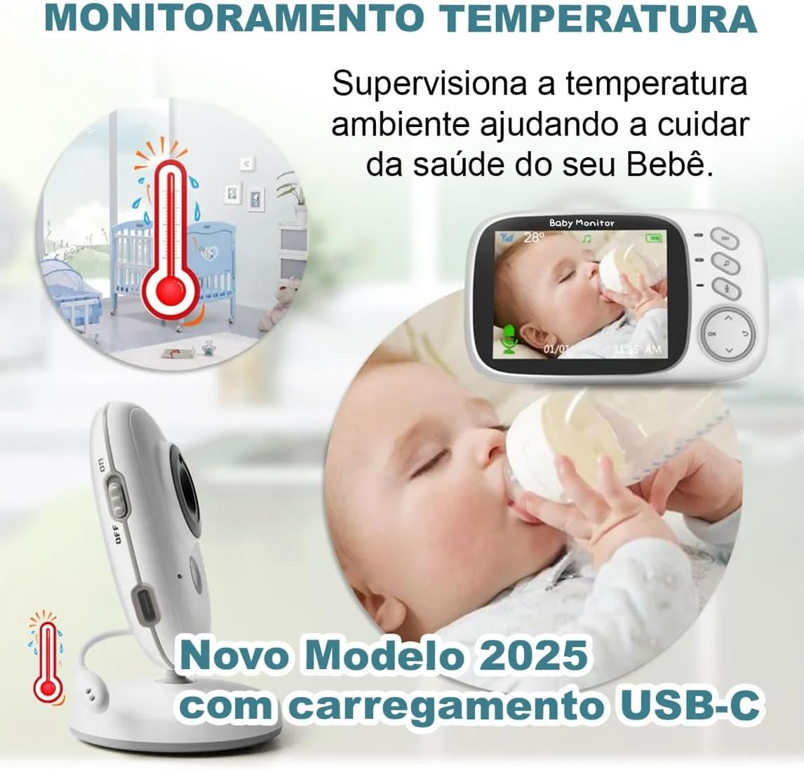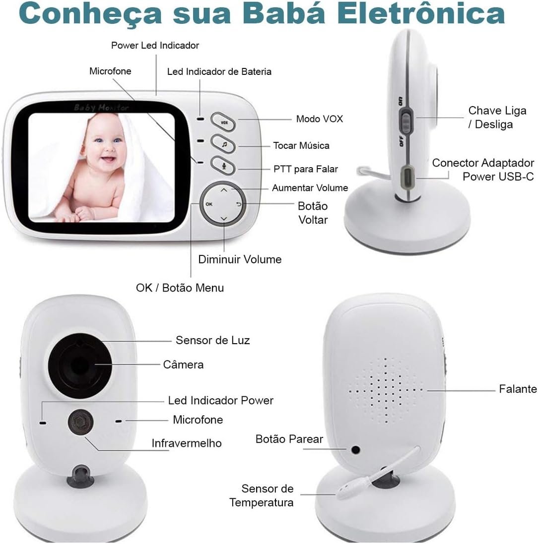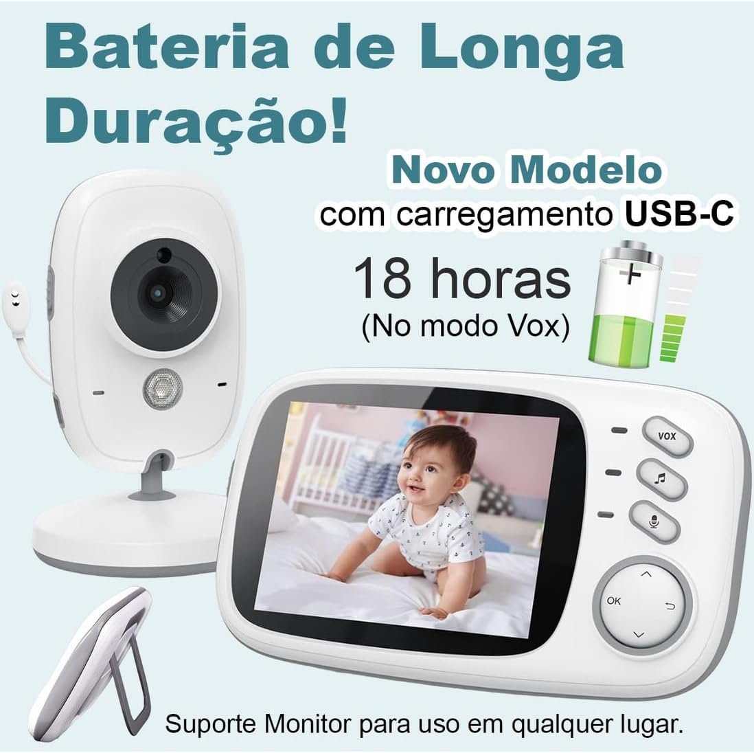 Babá Eletrônica, Câmera para Bebês com Tela de 3.2″, Visão Noturna 10M Infravermelha, Áudio Bidirecional, Detecção de Som VOX, Monitoramento Temperatura, Canção de Ninar