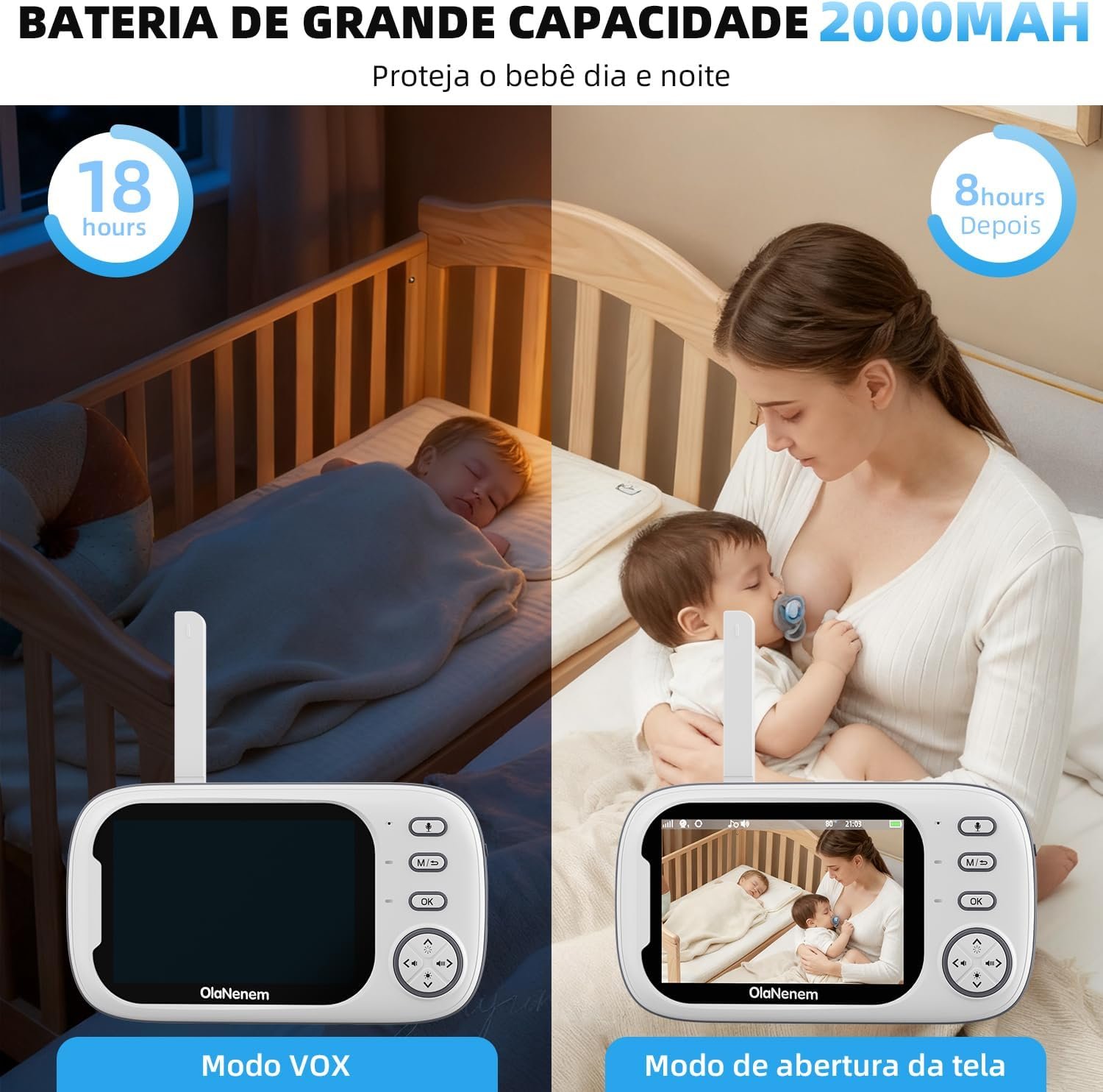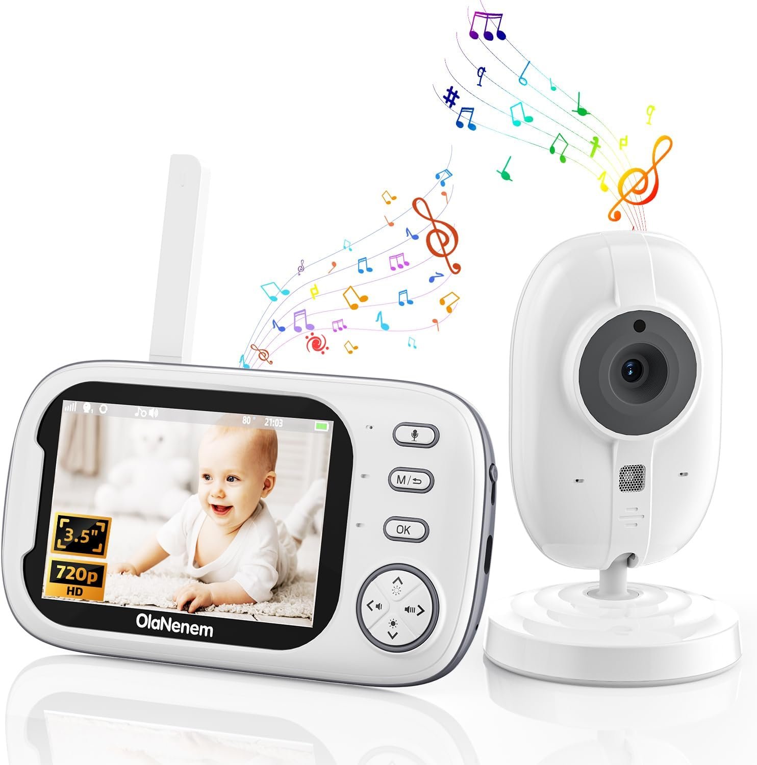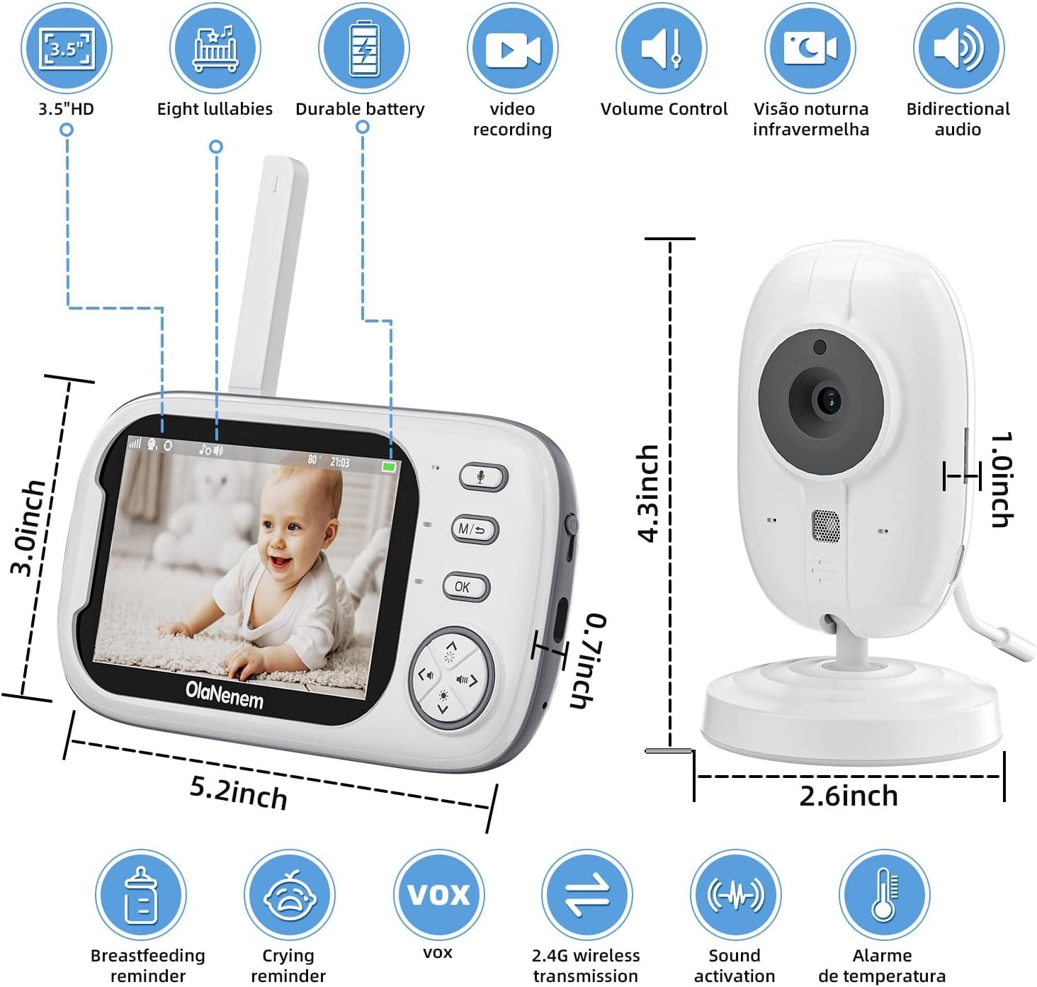 Babá Eletrônica OLANENEM, Tela 3.5″ 720P, Visão Noturna, Áudio Bidirecional, Monitoramento Temperatura, 8 Canções de Ninar para Recém-Nascidos