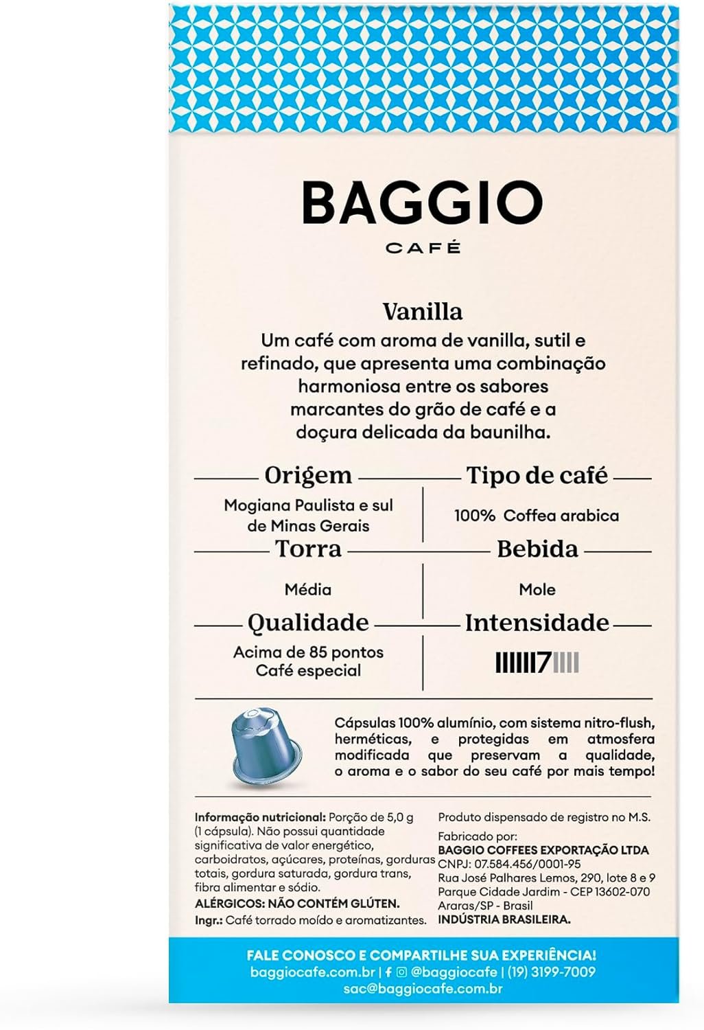 Desfrute de momentos únicos com o Baggio Café em cápsulas com aroma de baunilha. Compatíveis com máquinas Nespresso, este pacote contém 10 cápsulas que garantem um café de alta qualidade e sabor inigualável. Aproveite a praticidade e o aroma irresistível do café Baggio em cada xícara.