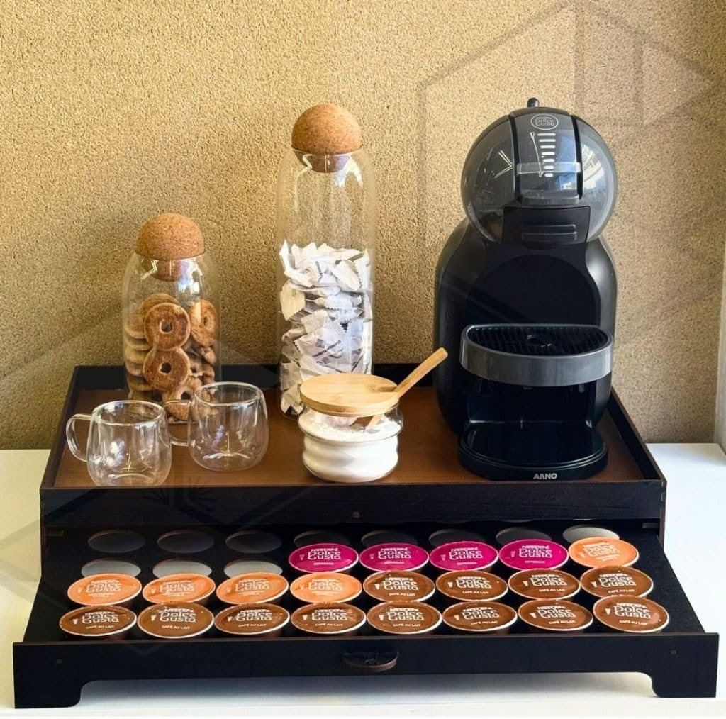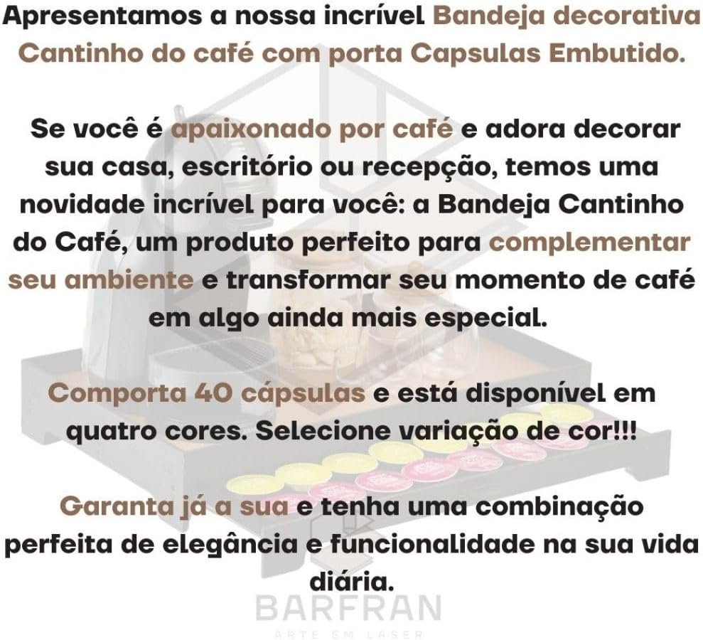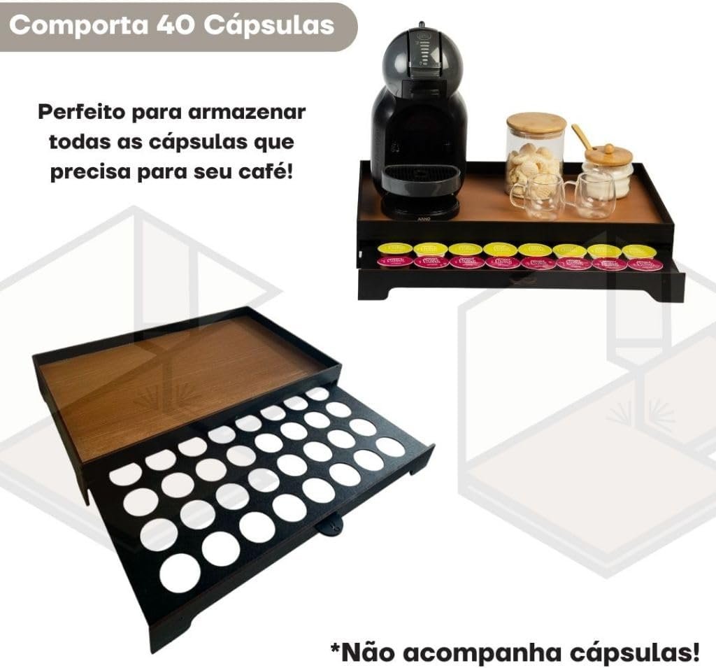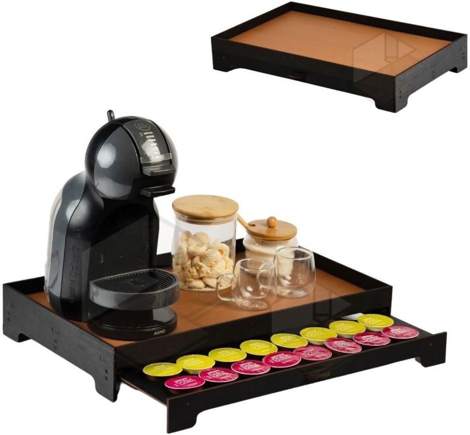 Bandeja Cantinho do Café em MDF, Preto com Caramelo, 50x30x8 cm, 1,25 kg, Acabamento em Gel, Porta 40 Cápsulas com Gaveta