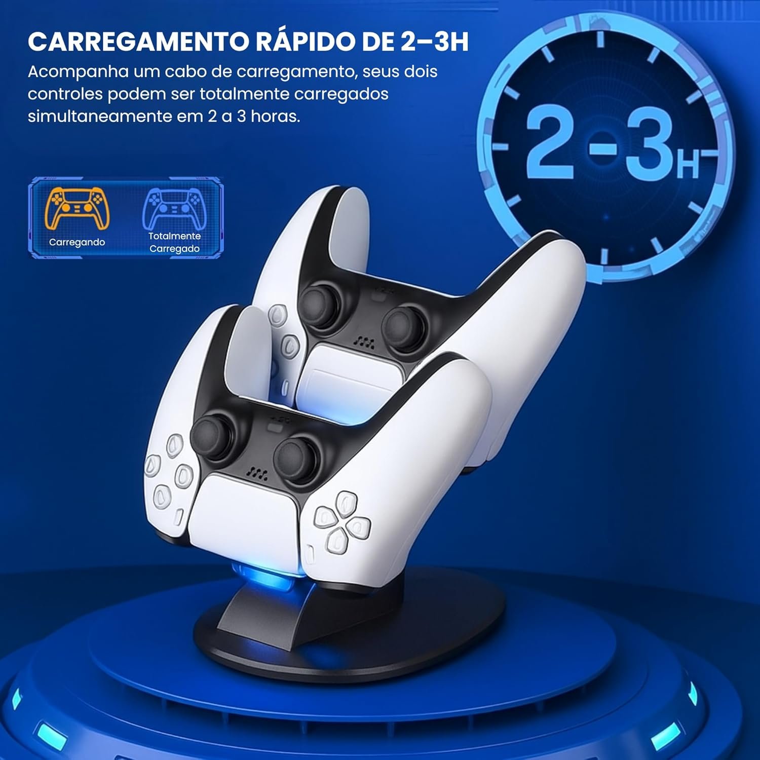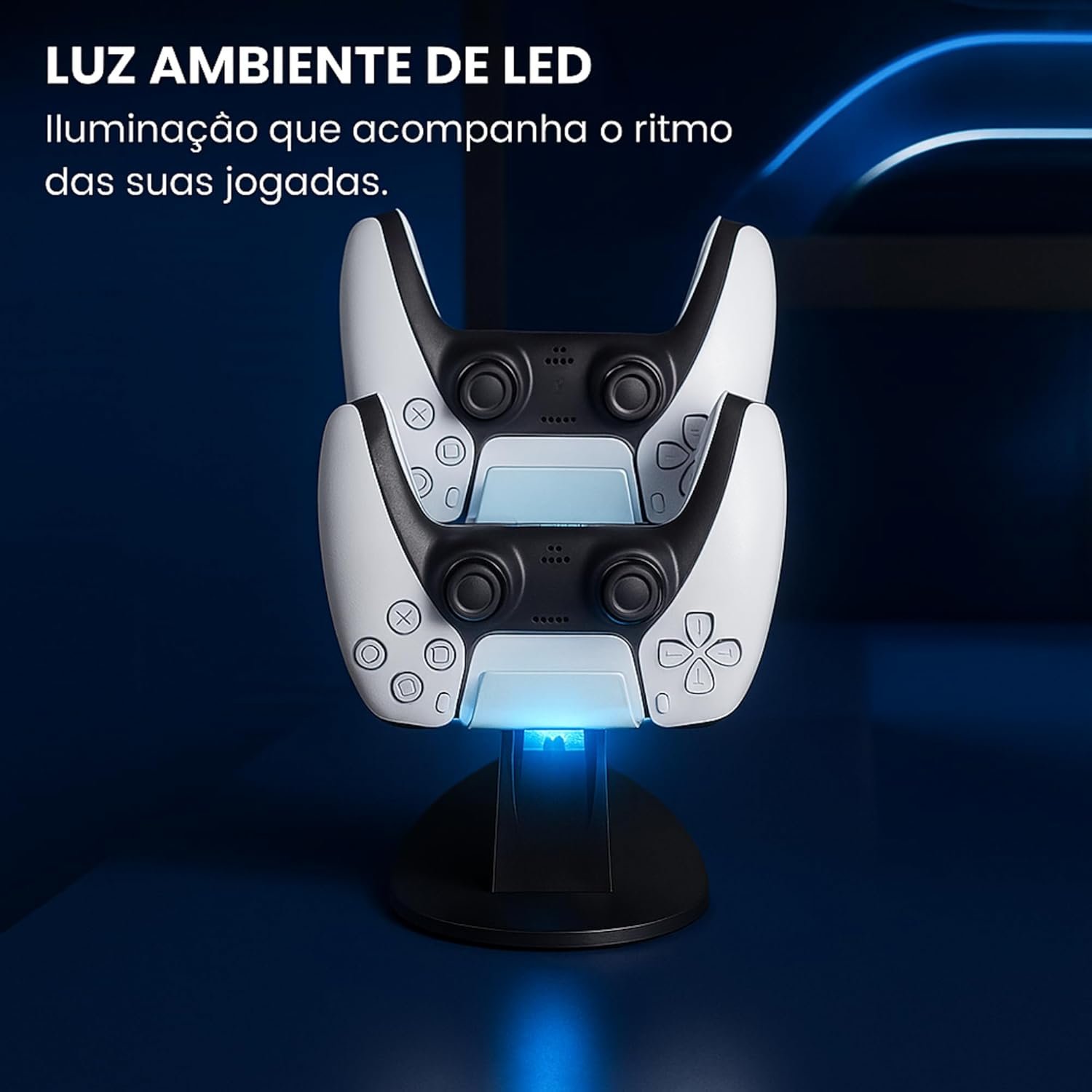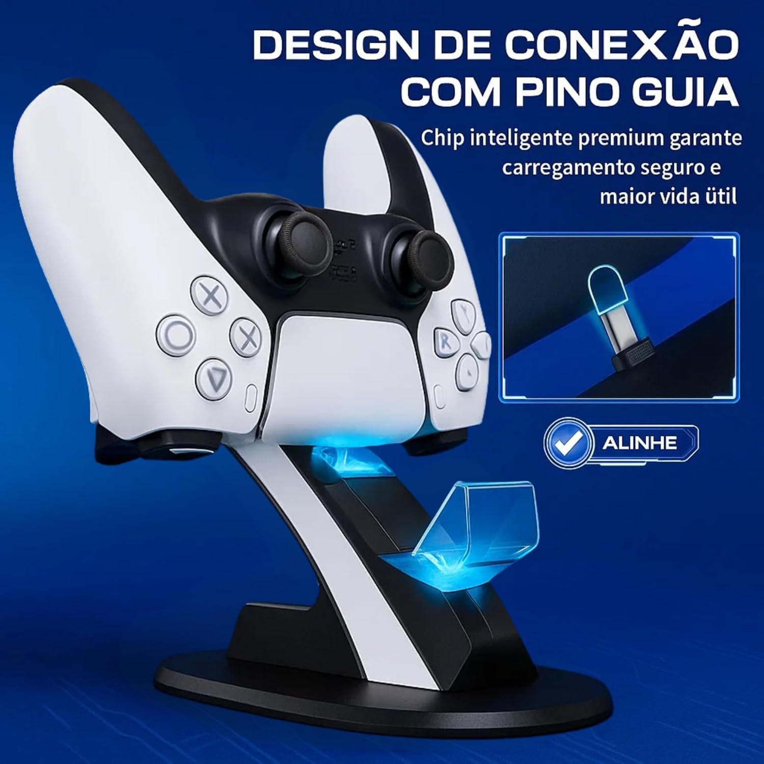 Base de Carregamento PS5 – Estação com Dock Duplo para Dois Controles com LED e Compatibilidade Total, Carregamento Rápido, Seguro e Proteção Contra Sobrecarga Suporte Ideal para Setup Gamer