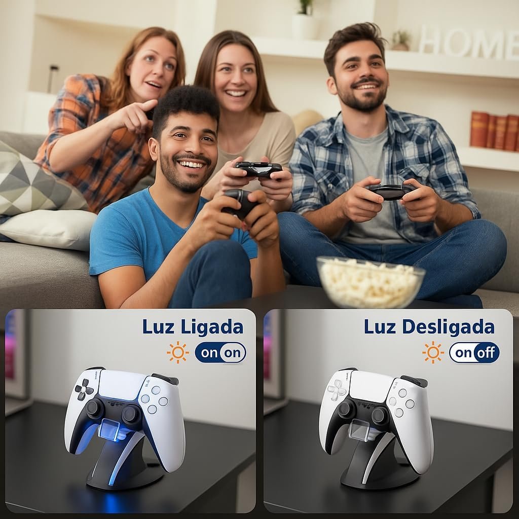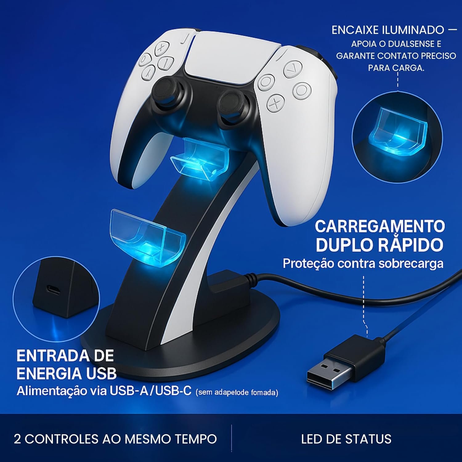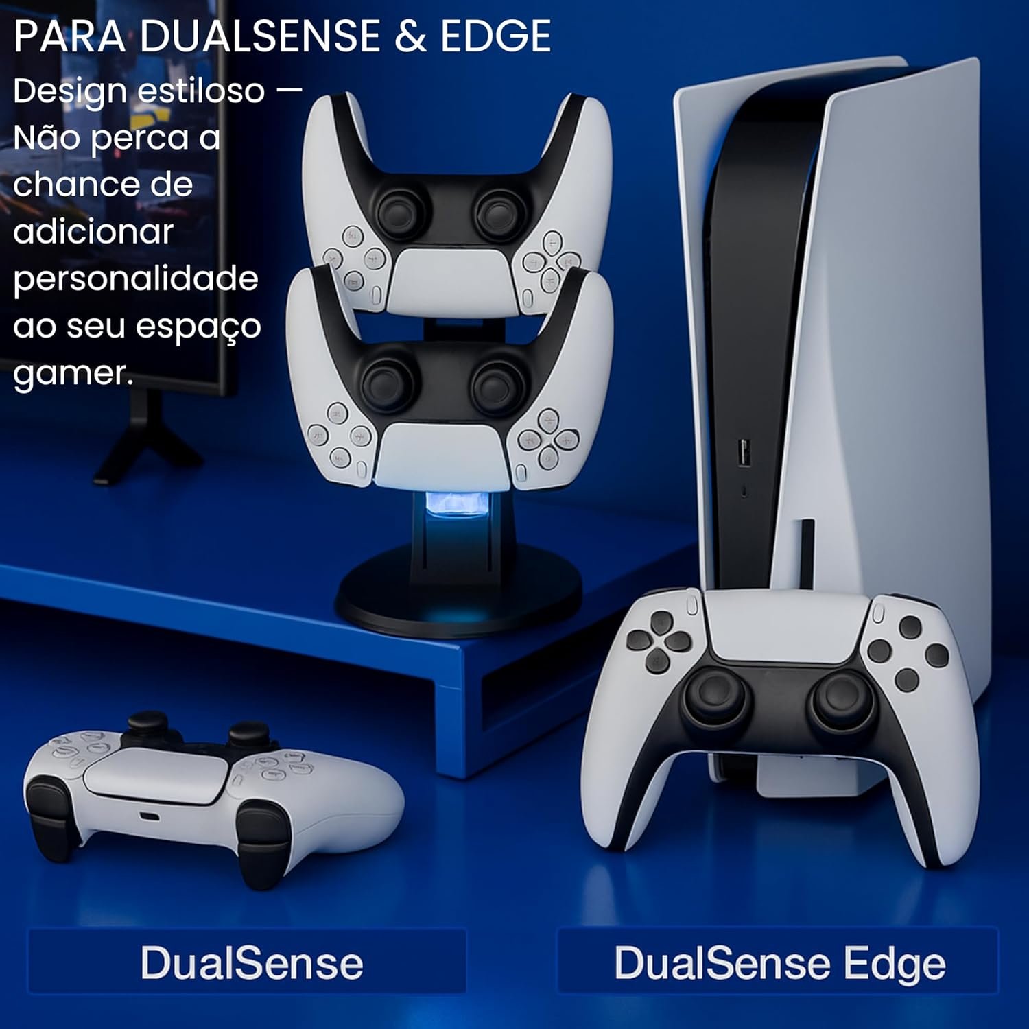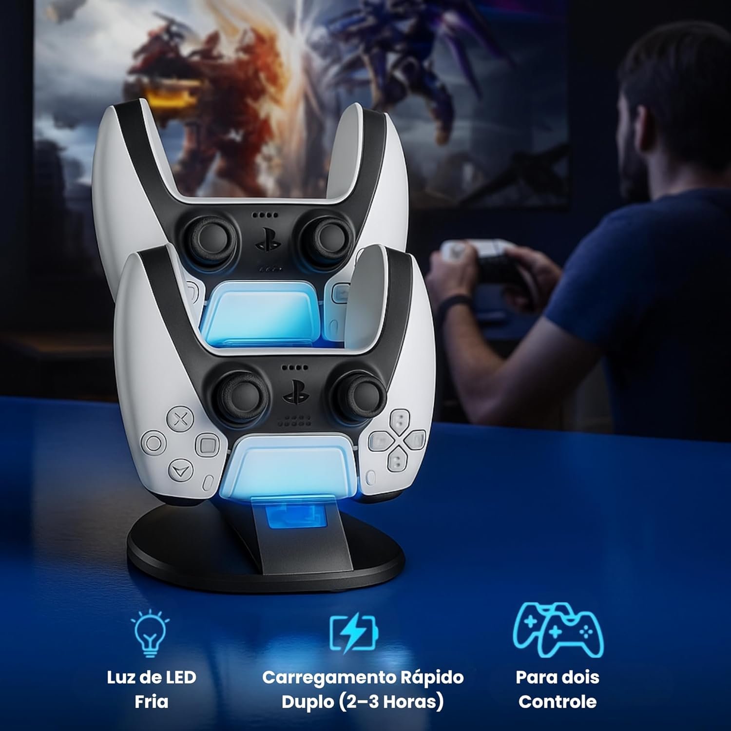 Base de Carregamento PS5 – Estação com Dock Duplo para Dois Controles com LED e Compatibilidade Total, Carregamento Rápido, Seguro e Proteção Contra Sobrecarga Suporte Ideal para Setup Gamer