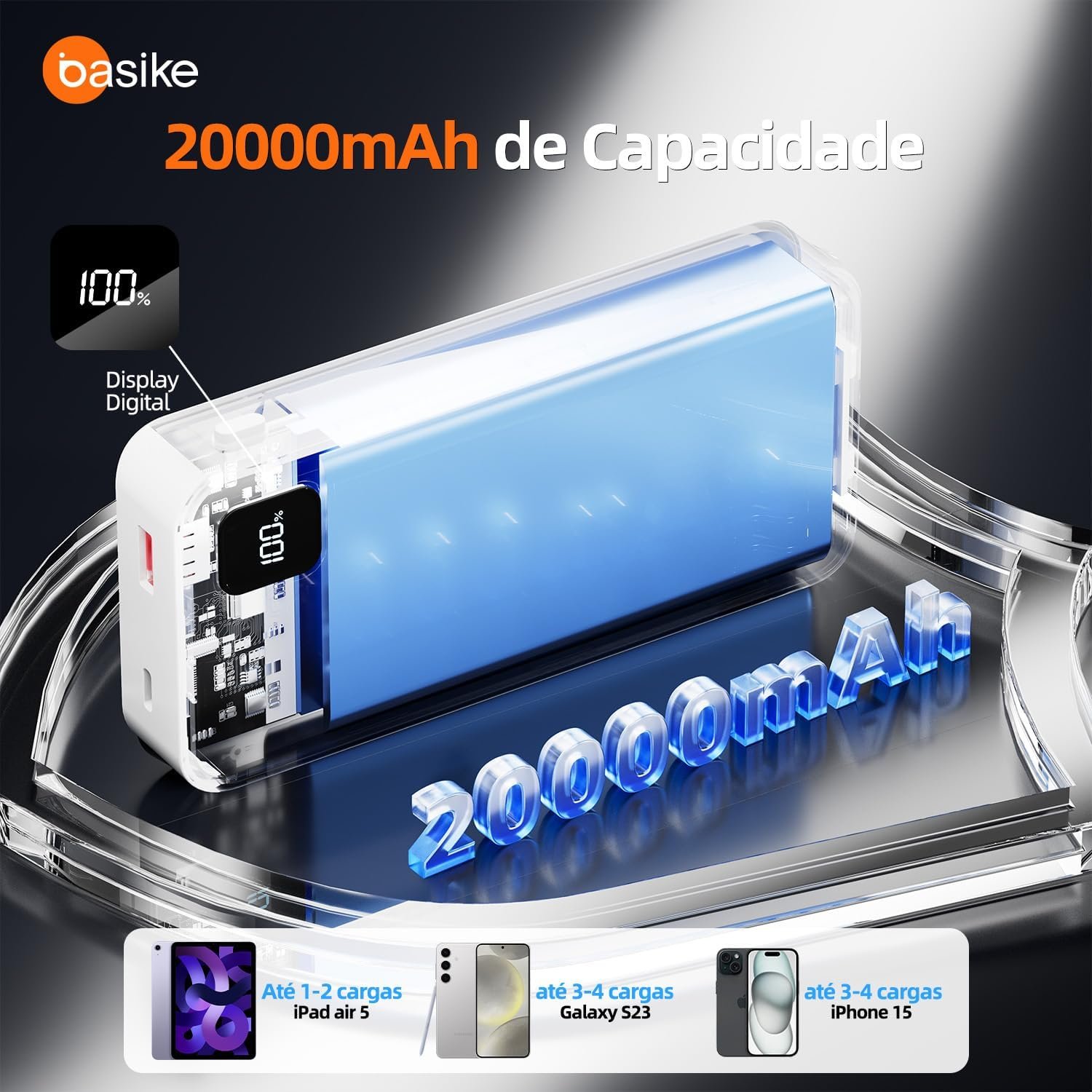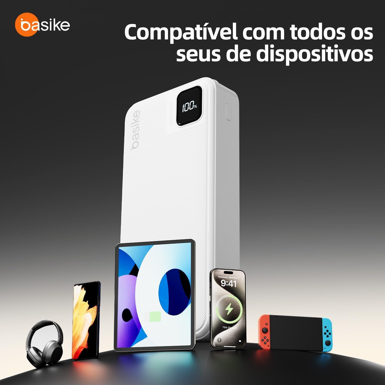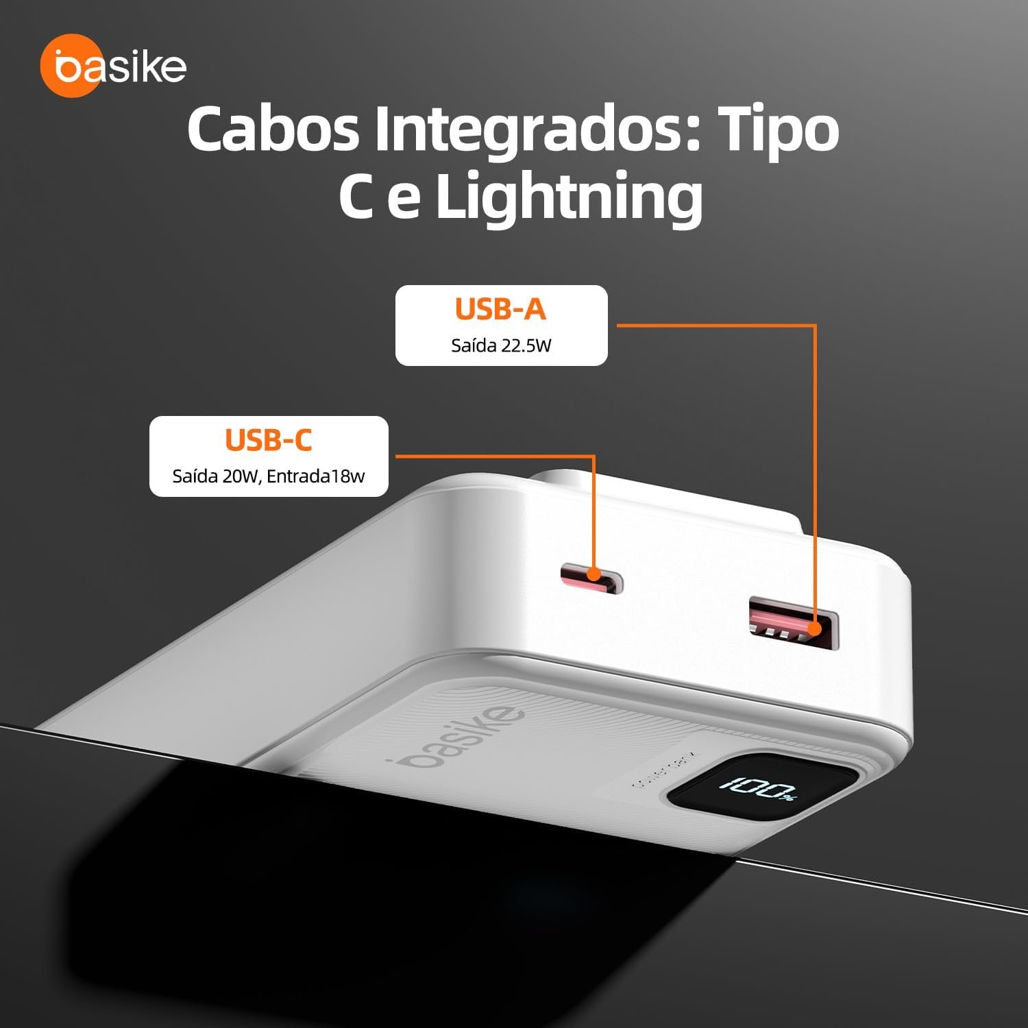 O Power Bank Basike é o seu parceiro perfeito para manter seus dispositivos carregados o dia todo. Com capacidade de 20000mAh, este carregador portátil oferece energia de sobra para várias recargas. Equipado com portas USB-A (até 22.5W) e USB-C (até PD20W), além de 2 cabos integrados (USB-C e Lightning), garantindo compatibilidade com diversos aparelhos.