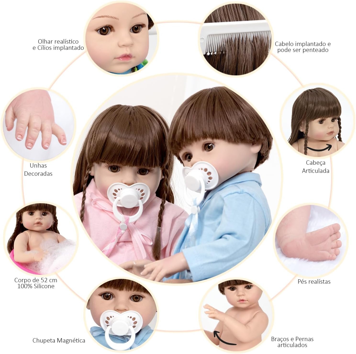 Bebe Reborn Gêmeos Casal 100% Silicone Bolsa 36 AcessóriosBebe Reborn Gêmeos Casal 100% Silicone Bolsa 36 Acessórios