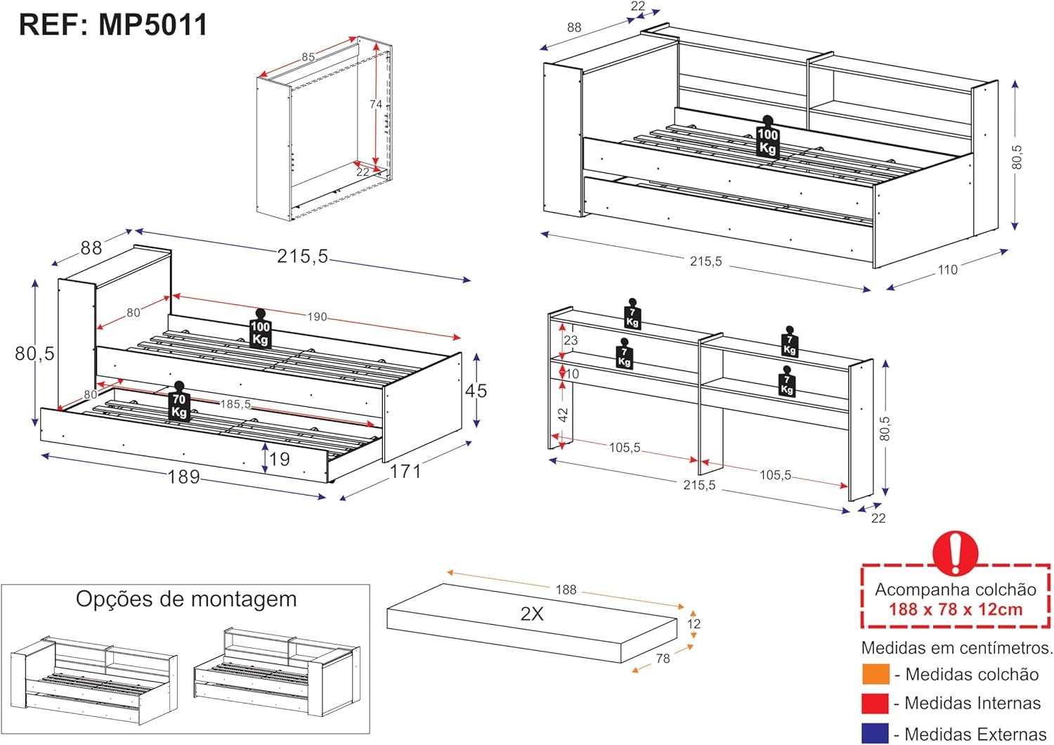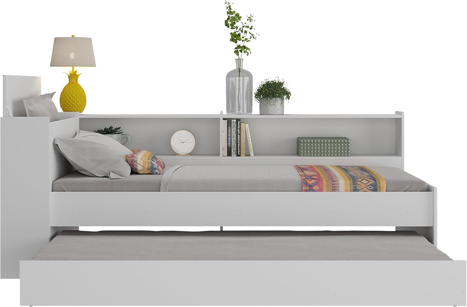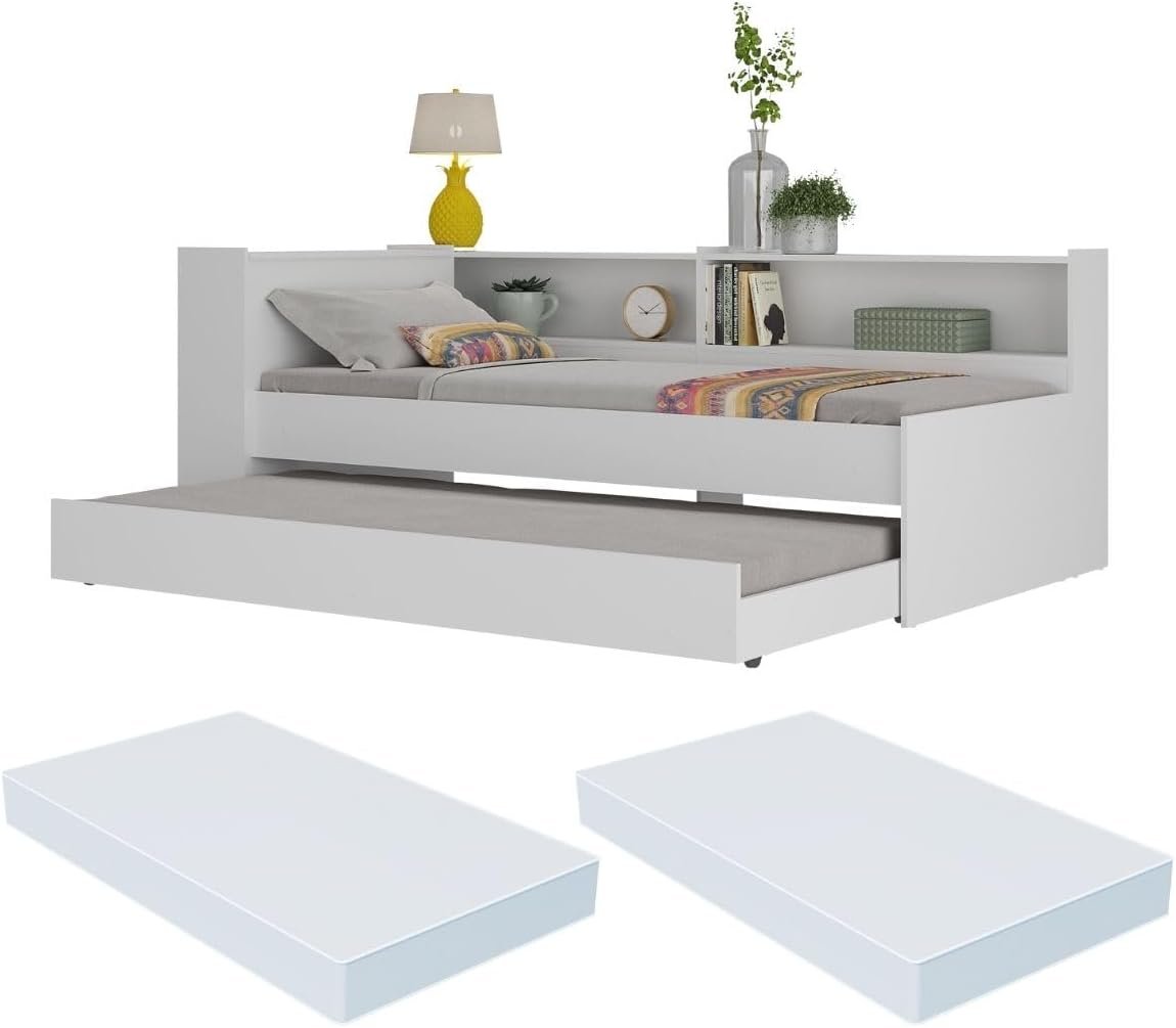 Bicama Solteiro com Colchão Incluso, Prateleira Lateral e Baú Embutido Multimóveis Branco