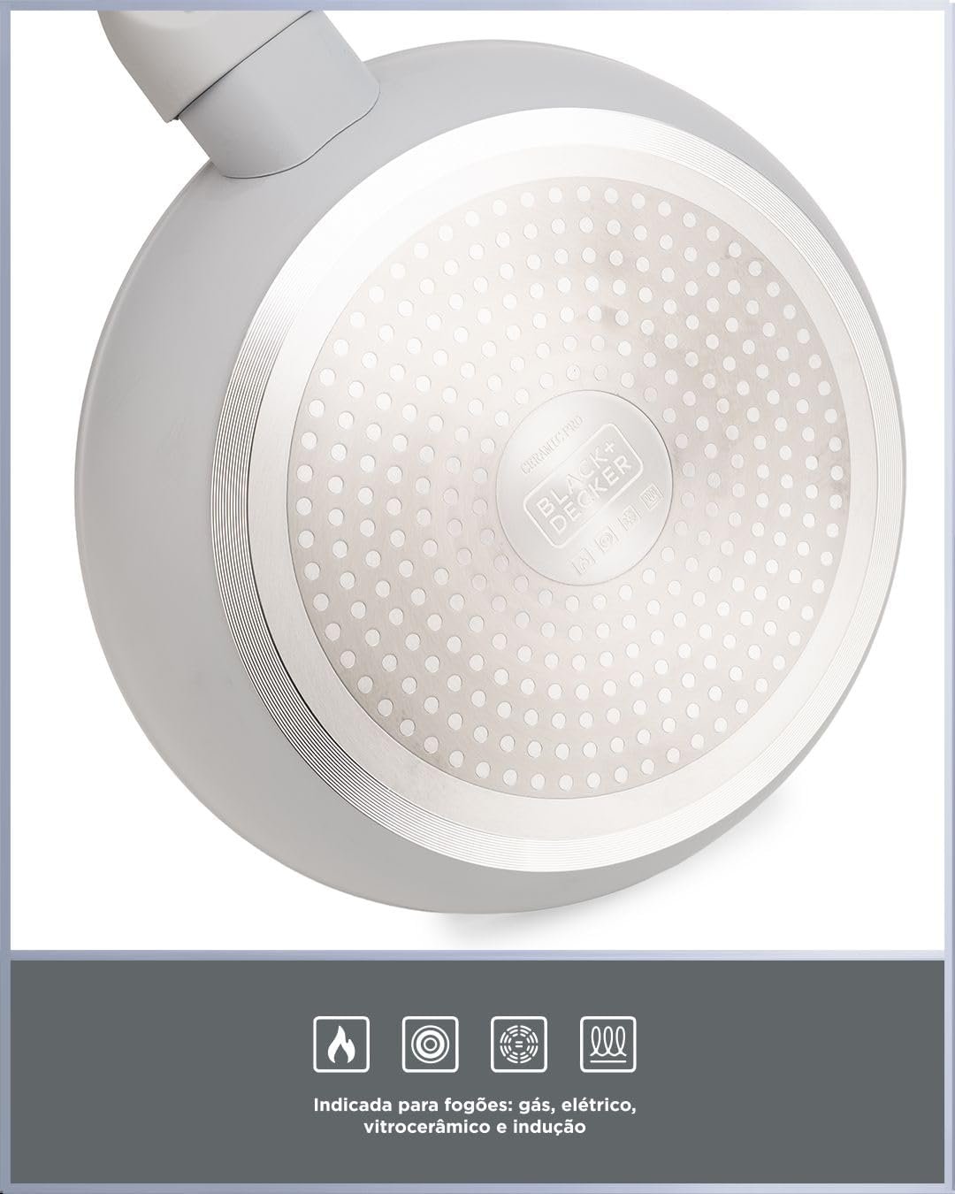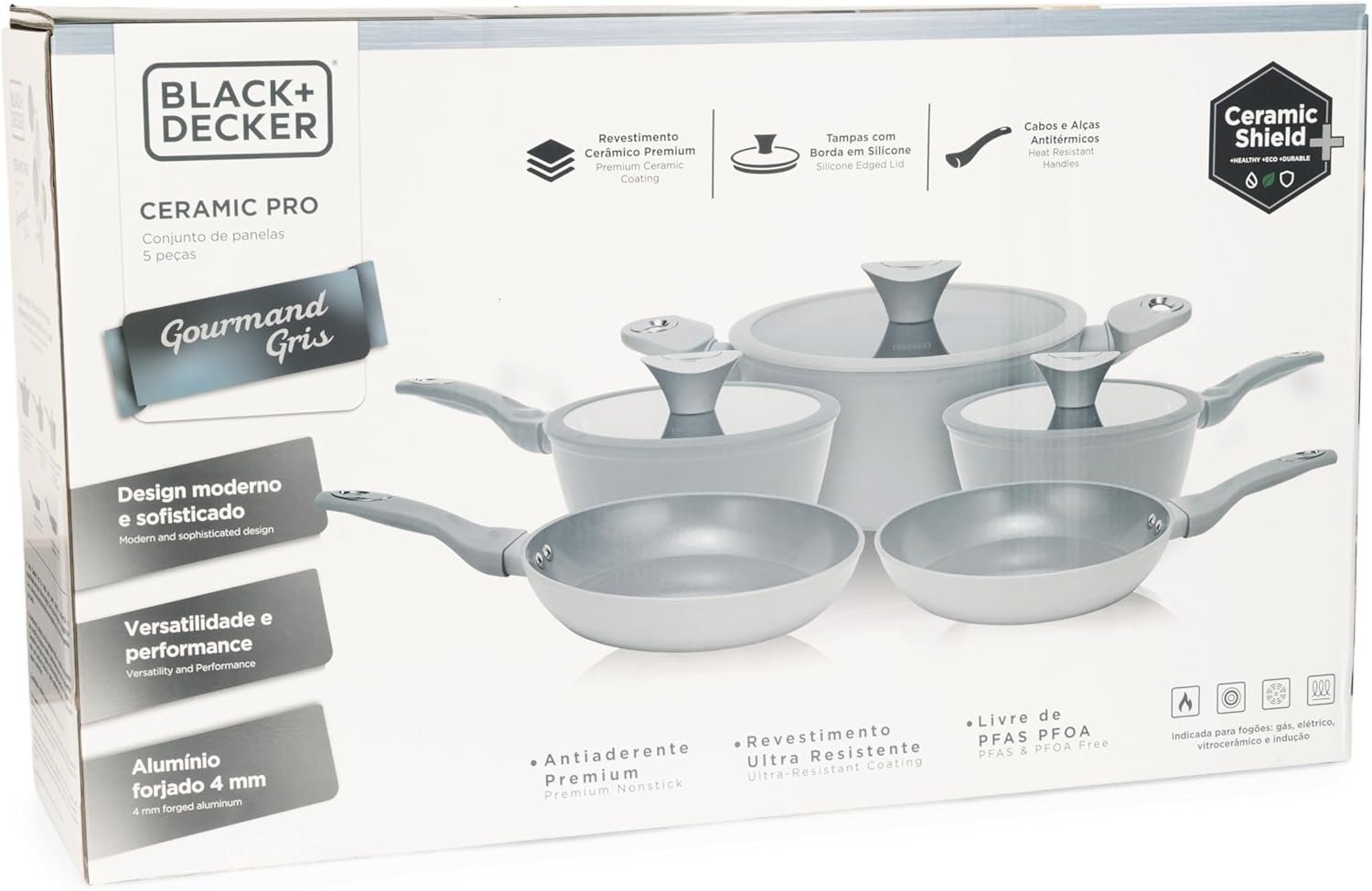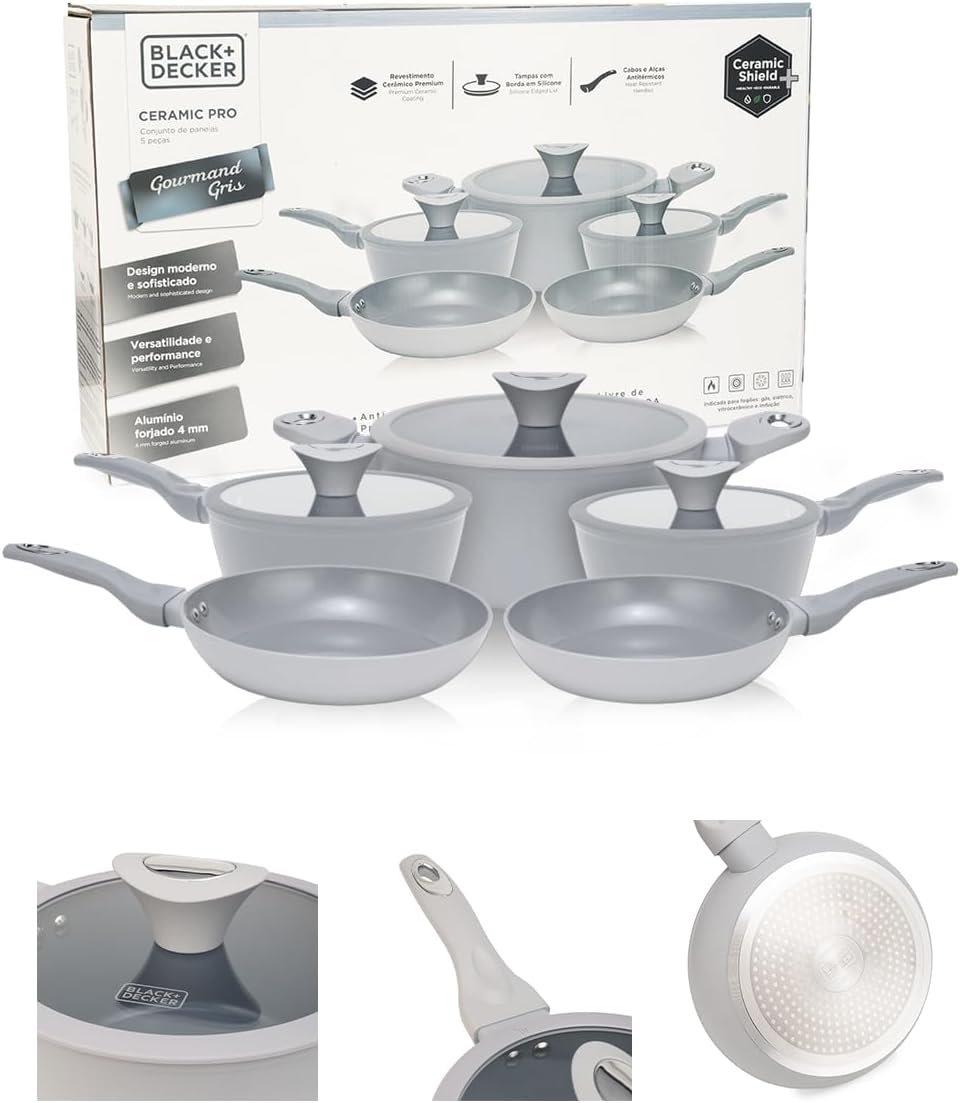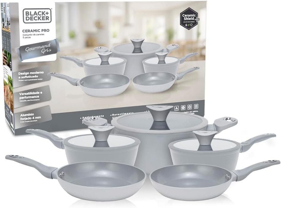 BLACK+DECKER Conjunto de Panelas 5 Peças Ceramic Pro Gourmand Gris – Revestimento Cerâmico Antiaderente, Base Compatível com Indução e Tampas de Vidro com Borda de Silicone – Mist Grey