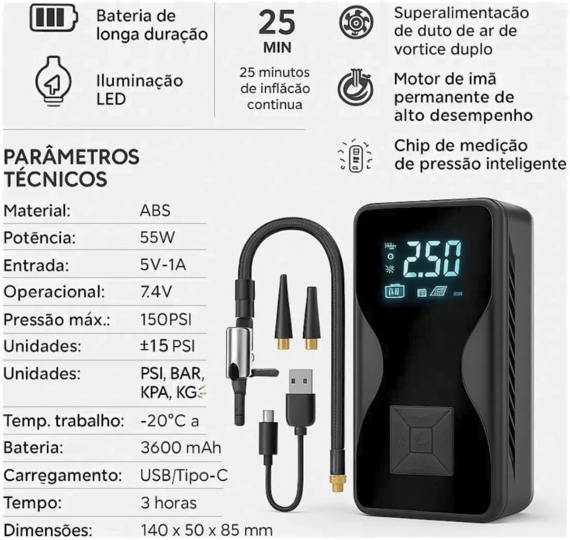 Bomba De Ar Portátil Recarregável Compressor e Calibrador Ar Marca: Memento