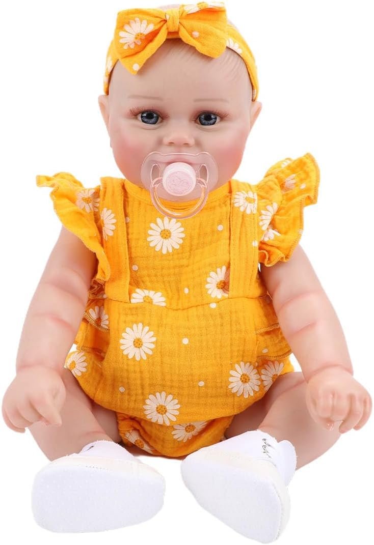 Boneca Bebe Reborn Menina de Silicone Realista Pintado Presente da Menina Pode dar Banho (Vestido Amarelo 48cm)
