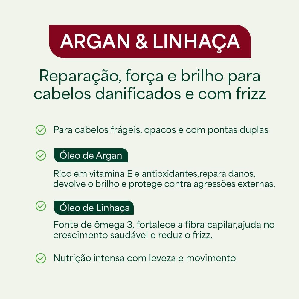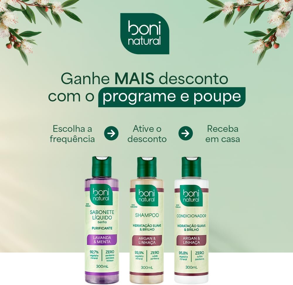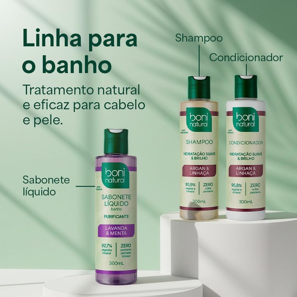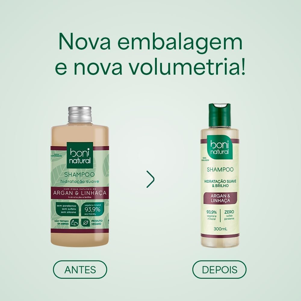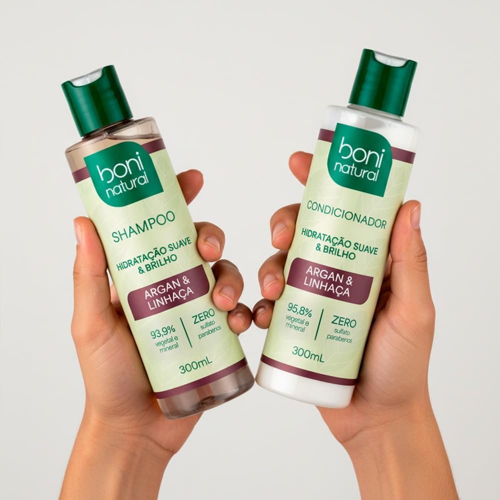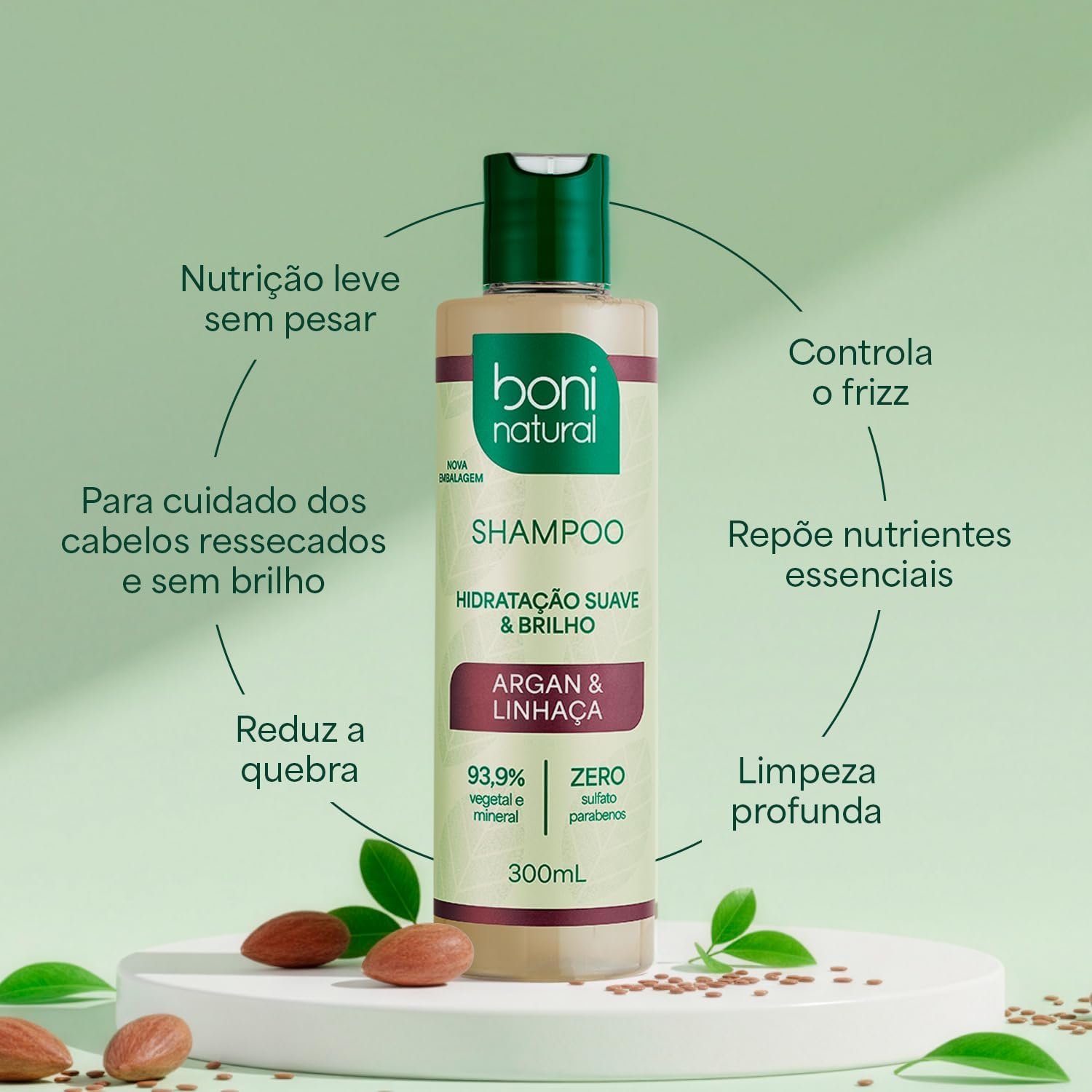 BONI NATURAL – Shampoo Vegano e Natural de Argan e Linhaça, Para todos os tipos de cabelo, Hidratação e Brilho, Boni Natural, 300ml