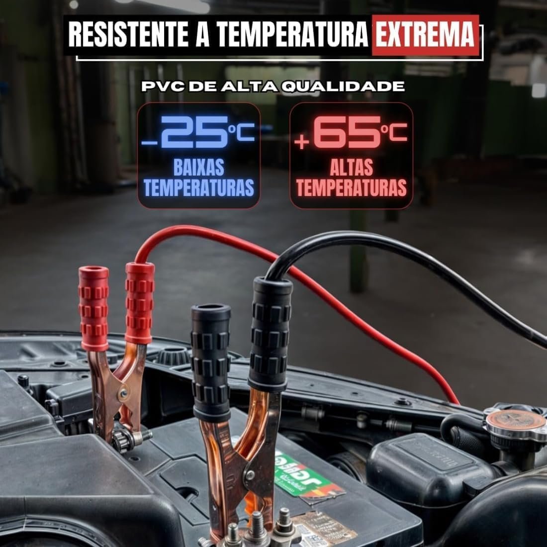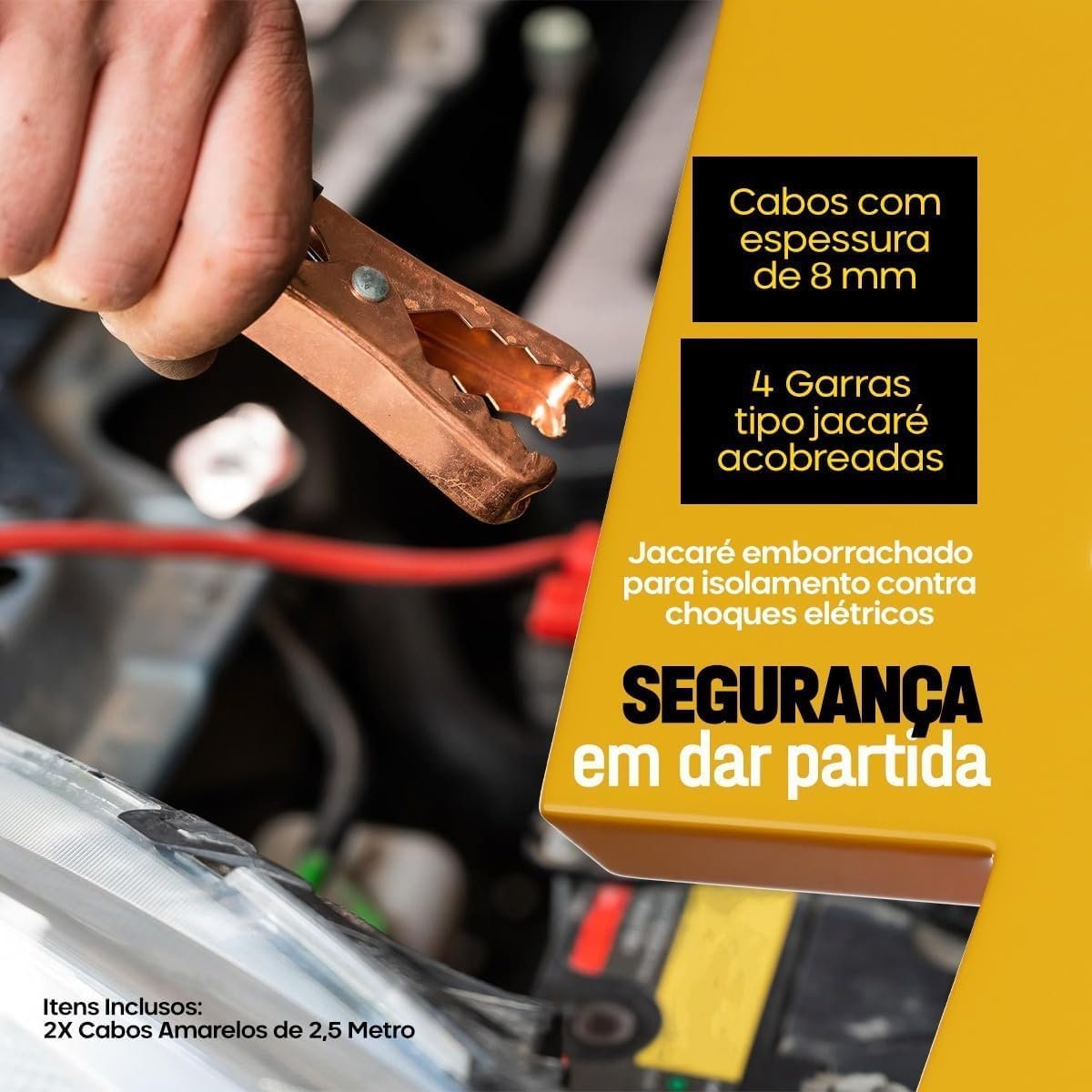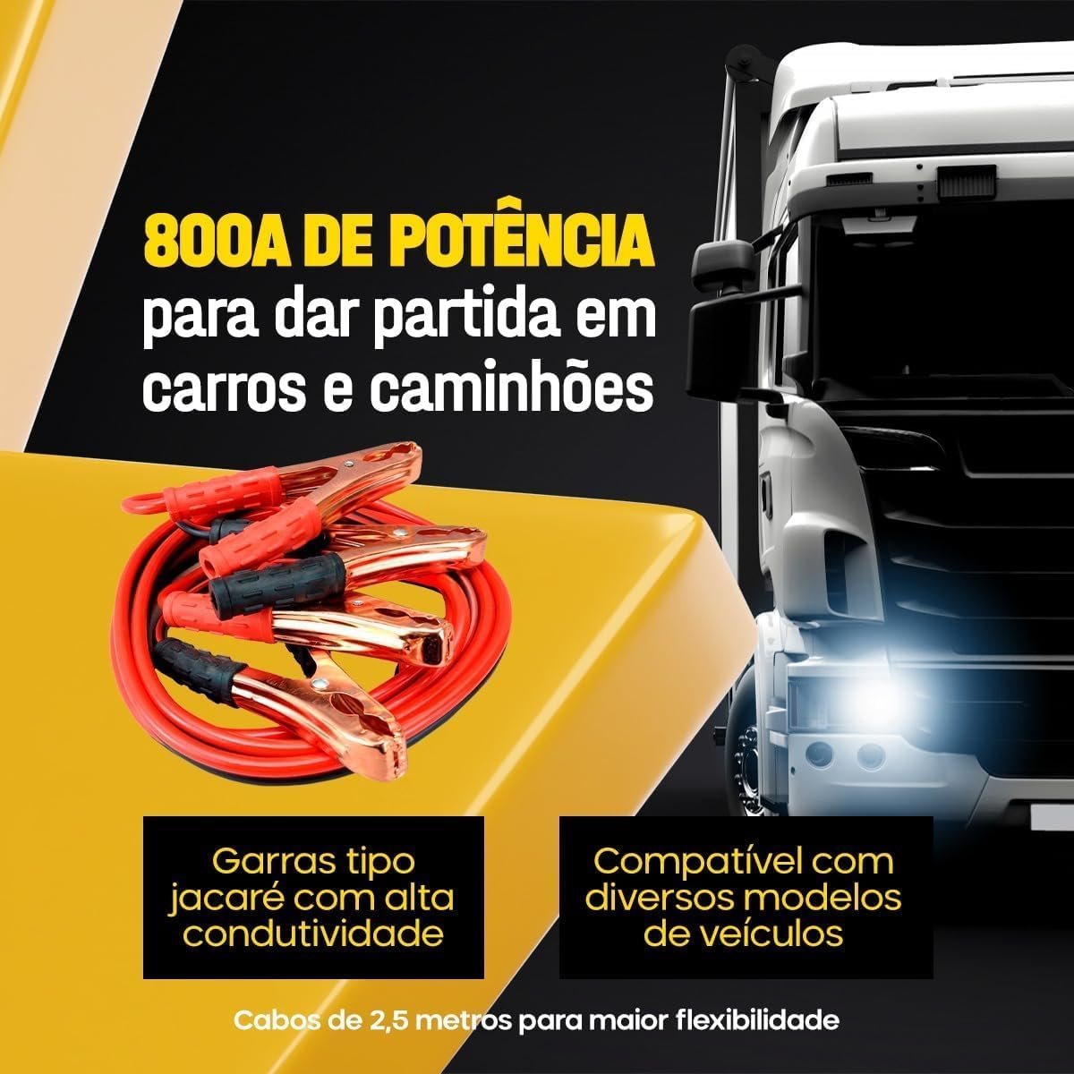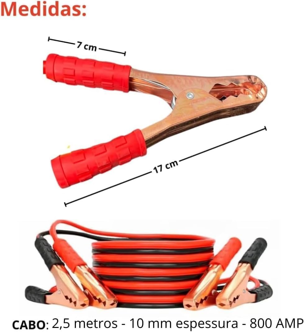 Cabo de Chupeta para Fazer Carga Recarga de Bateria Automotivo, Auxiliar de Partida para Bateria 800Amp, 2,5 metros, m, 10mm, Garras de Aço Cobreado, 12V/24V, com Bolsa, Carro, Moto, Caminhão, Vans