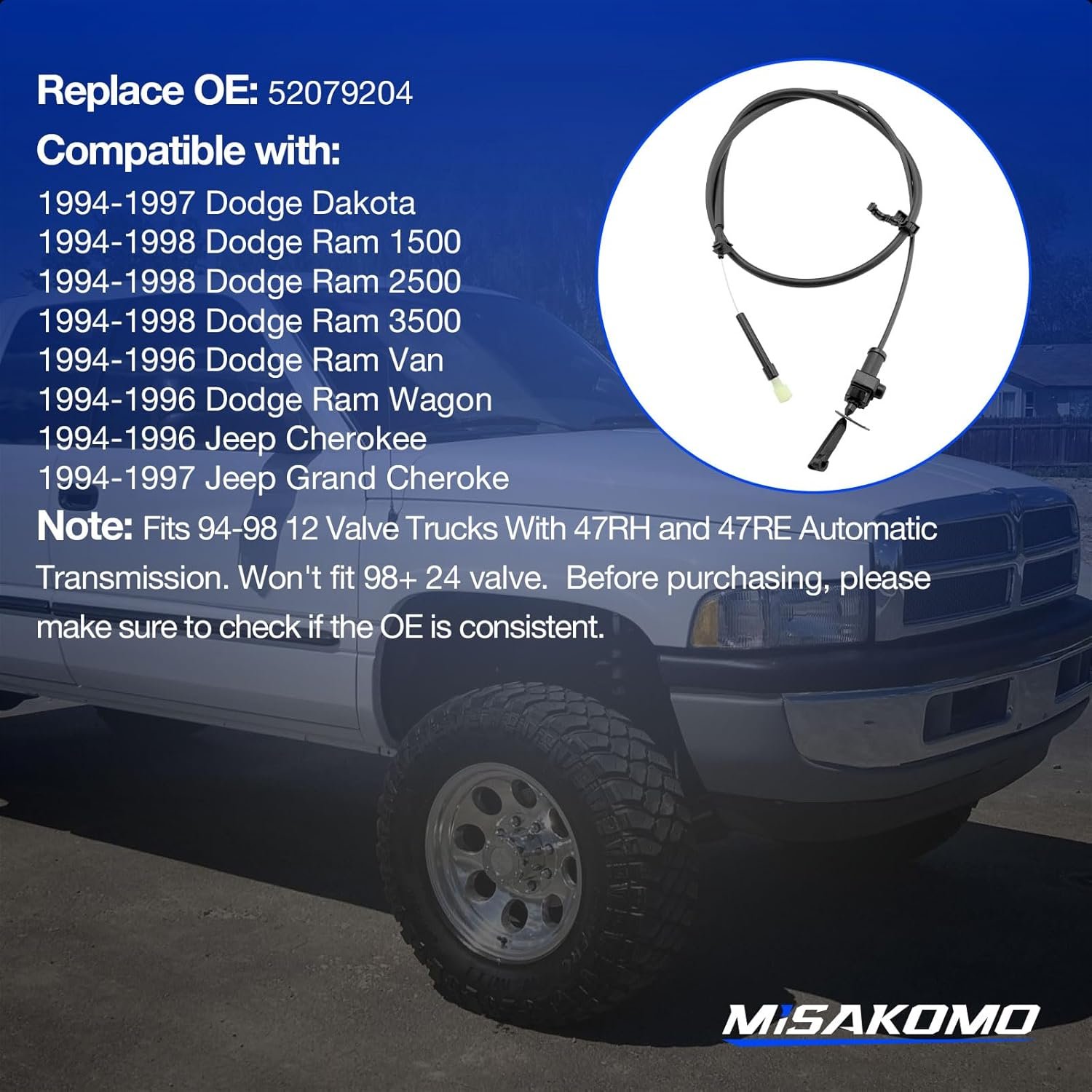 Cabo de válvula de aceleração de transmissão compatível com Dodge Ram 1994-1998 1500 2500 3500, 1994-1997 Dodge Dakota, 1994-1996 Jeep Cherokee 1994-1997 Jeep Grand Cheroke Substituto # 52079204