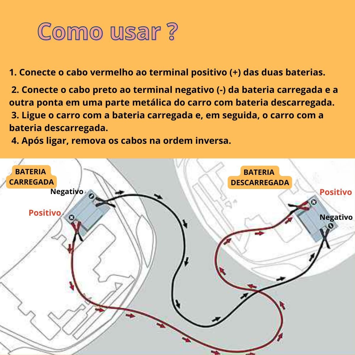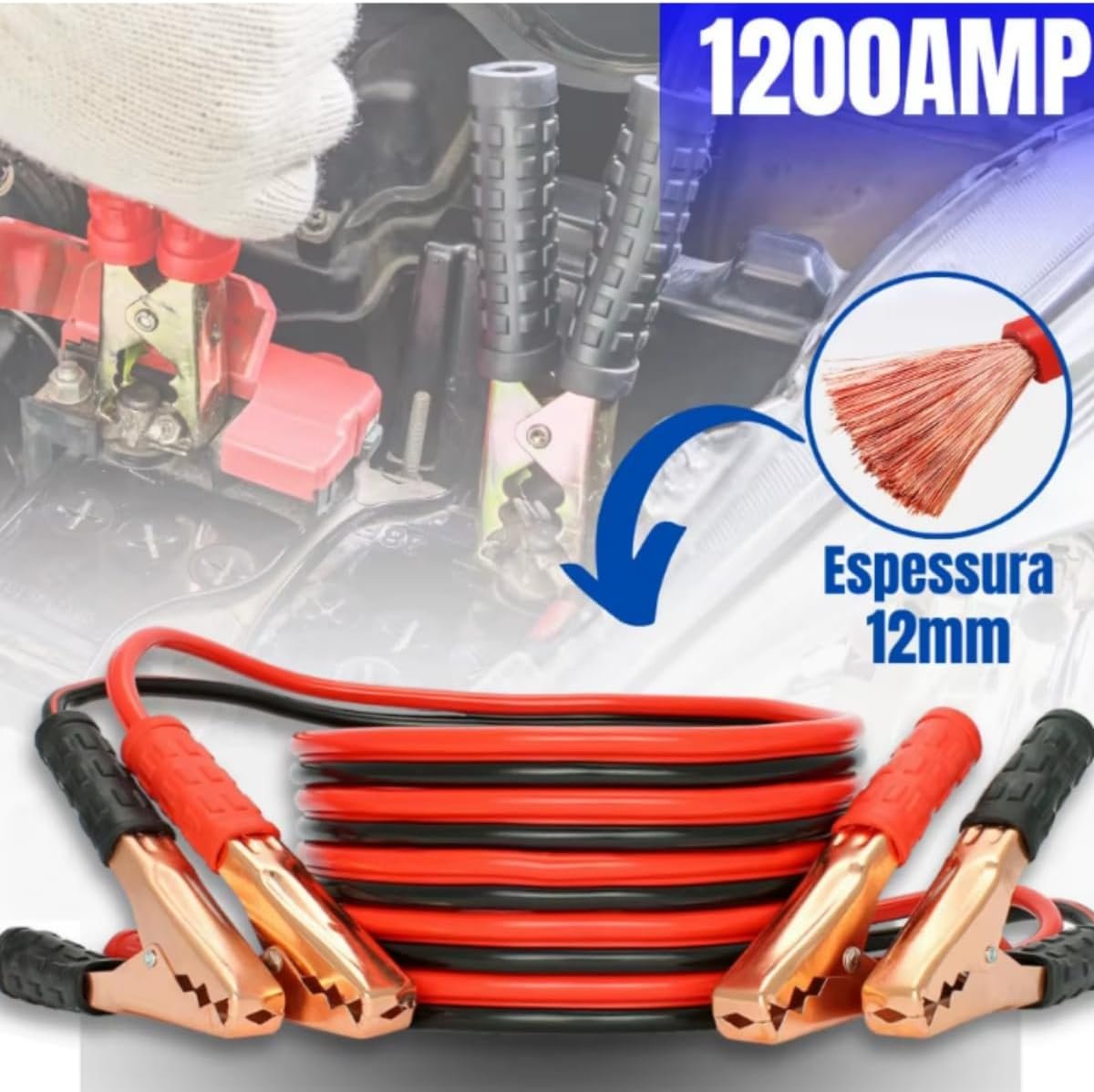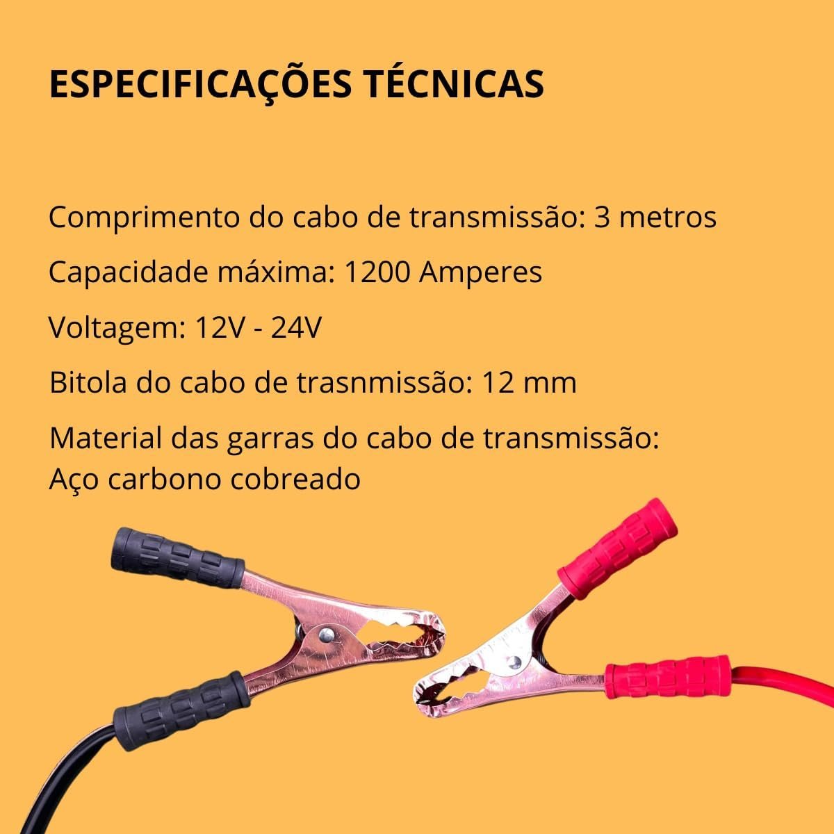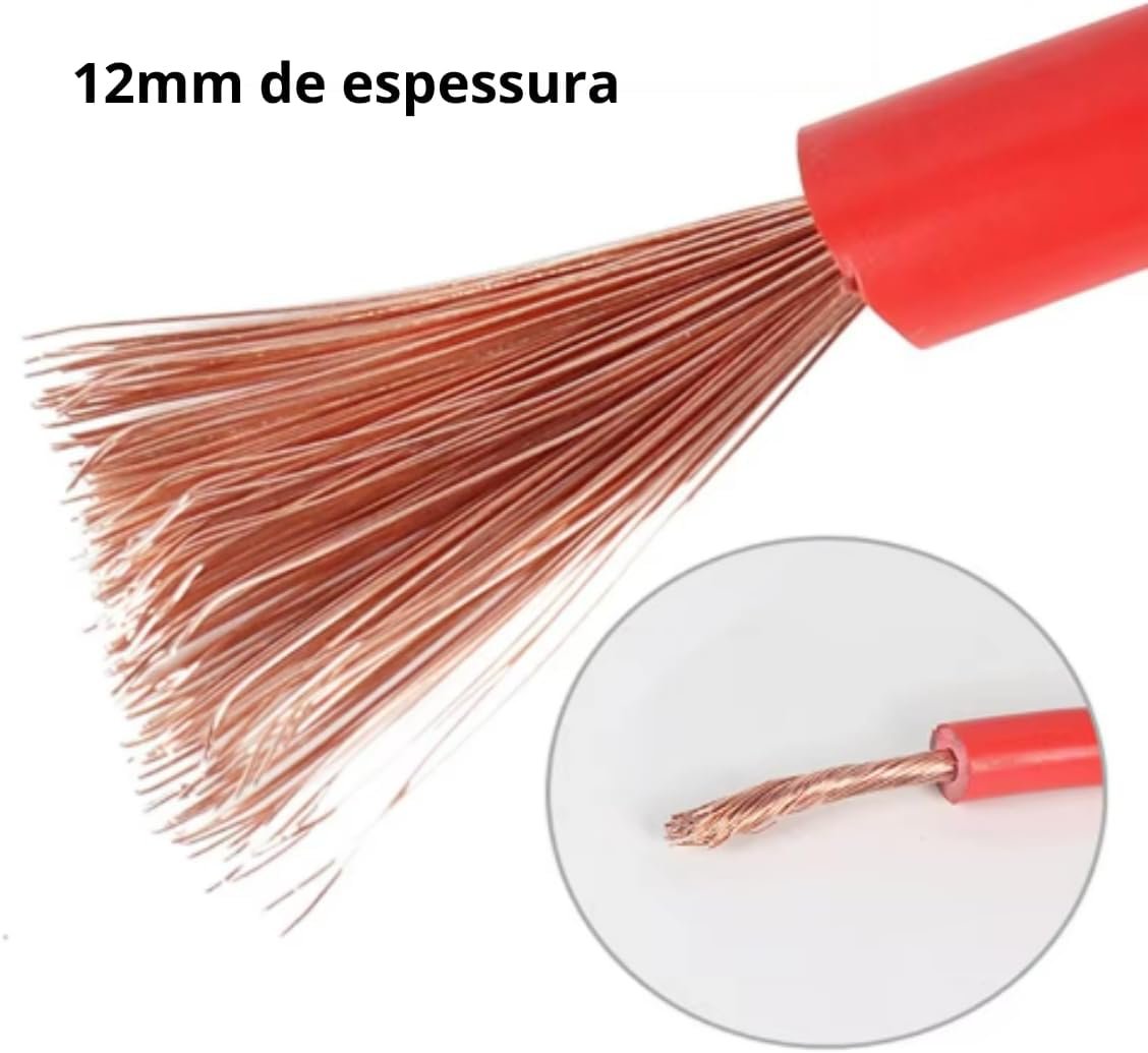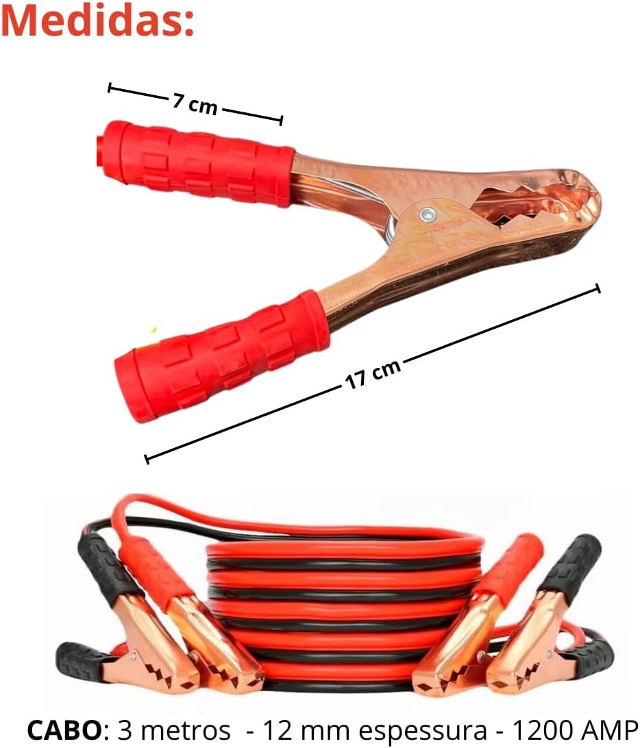 Cabo Para Recarga De Bateria 3m Com Garras Em Aço Cobreado 1200A Bitola 12mm Resistente E Seguro Chupeta