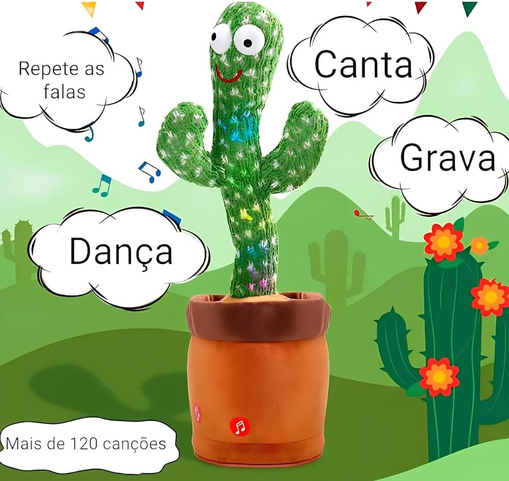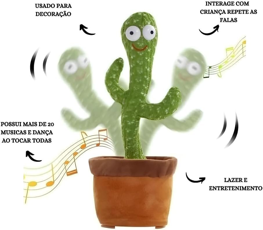 Encante-se com o Cacto Dançante e Falante Interativo, um brinquedo premium que vai trazer muita diversão para sua casa! Este simpático cacto não só pisca e toca músicas, mas também repete a voz, proporcionando momentos de alegria e interação para crianças e adultos.