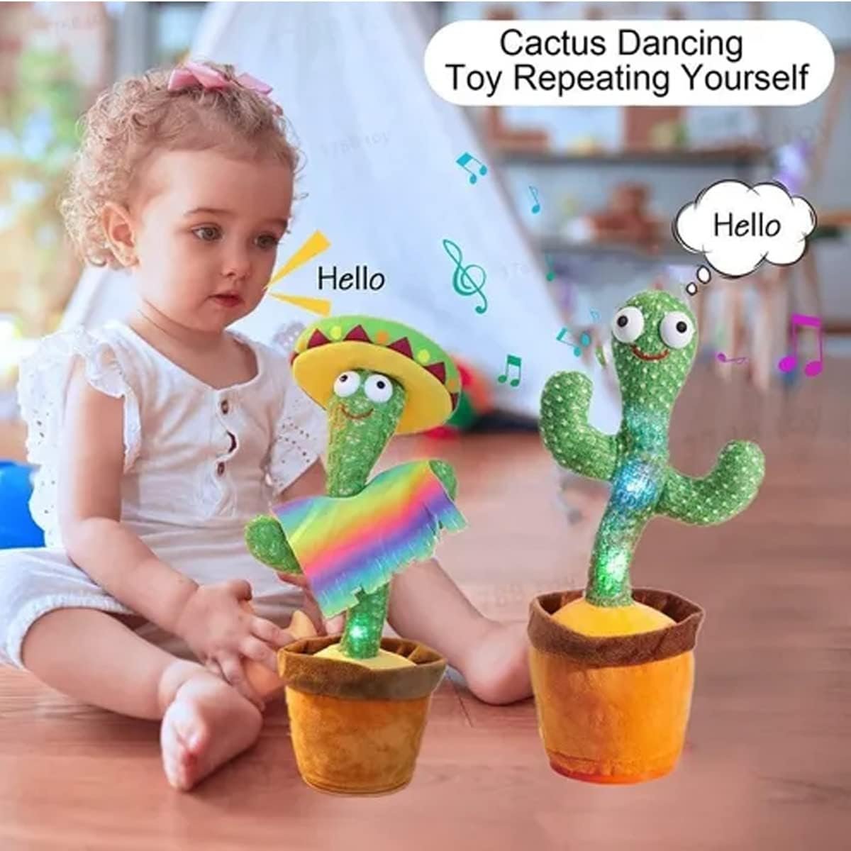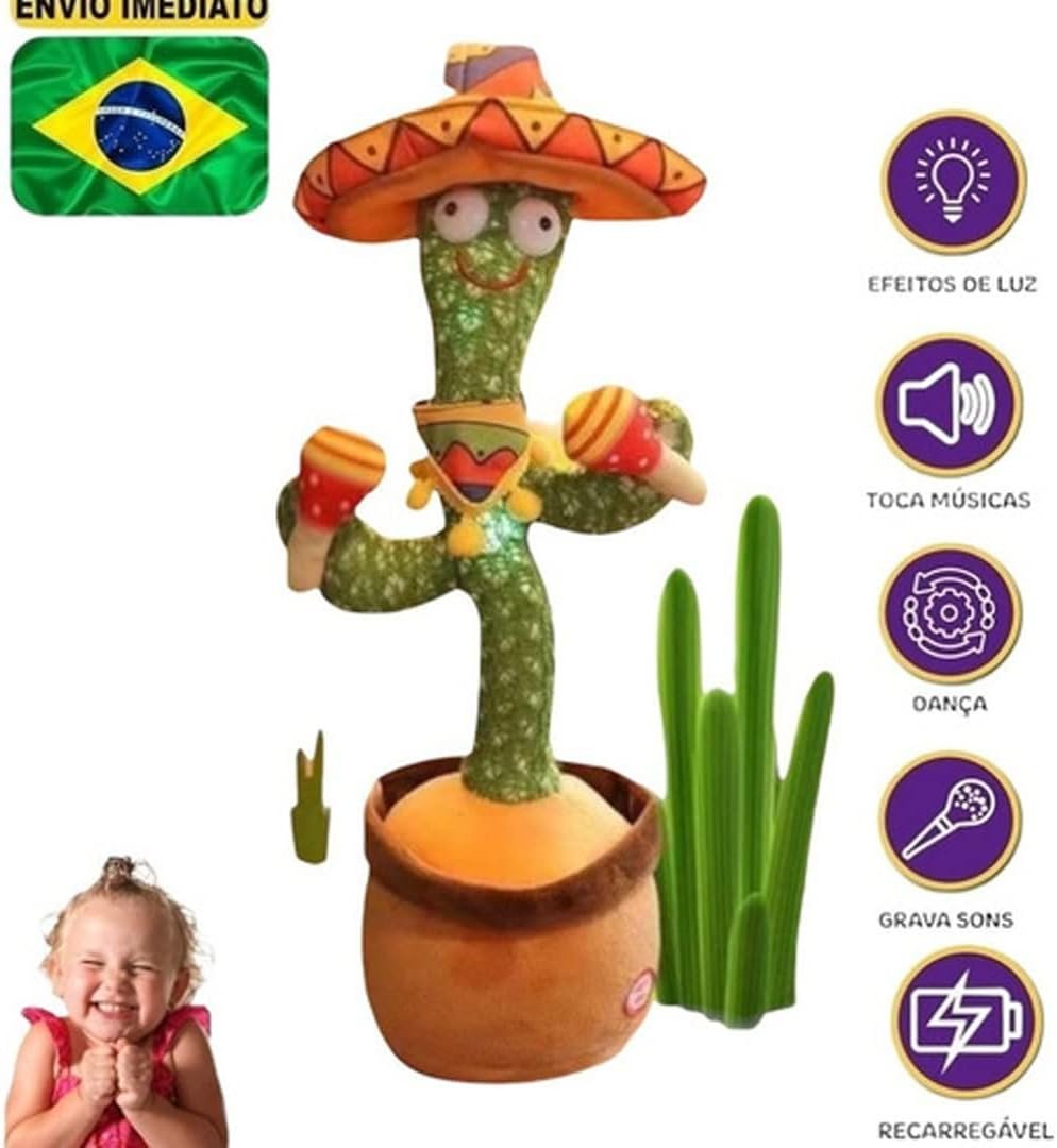 Descrição: Este Cacto Dançante Falante é o companheiro perfeito para alegrar qualquer ambiente! Com a capacidade de repetir o que é dito, reproduzir música e luzes coloridas, ele proporciona entretenimento garantido. Além disso, vem com uma roupa exclusiva para deixá-lo ainda mais charmoso. Surpreenda-se com a diversão e encanto que este cacto pode trazer para sua casa ou escritório!