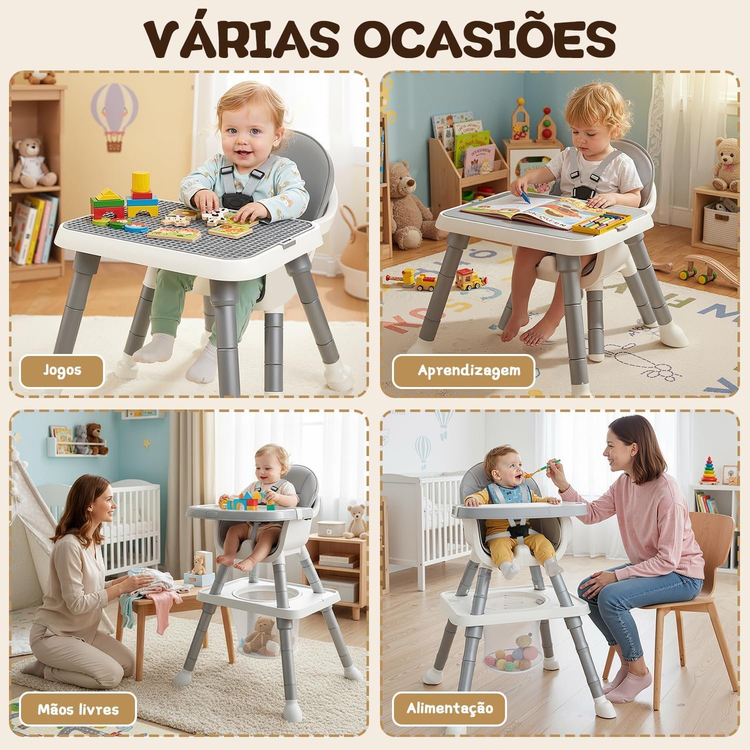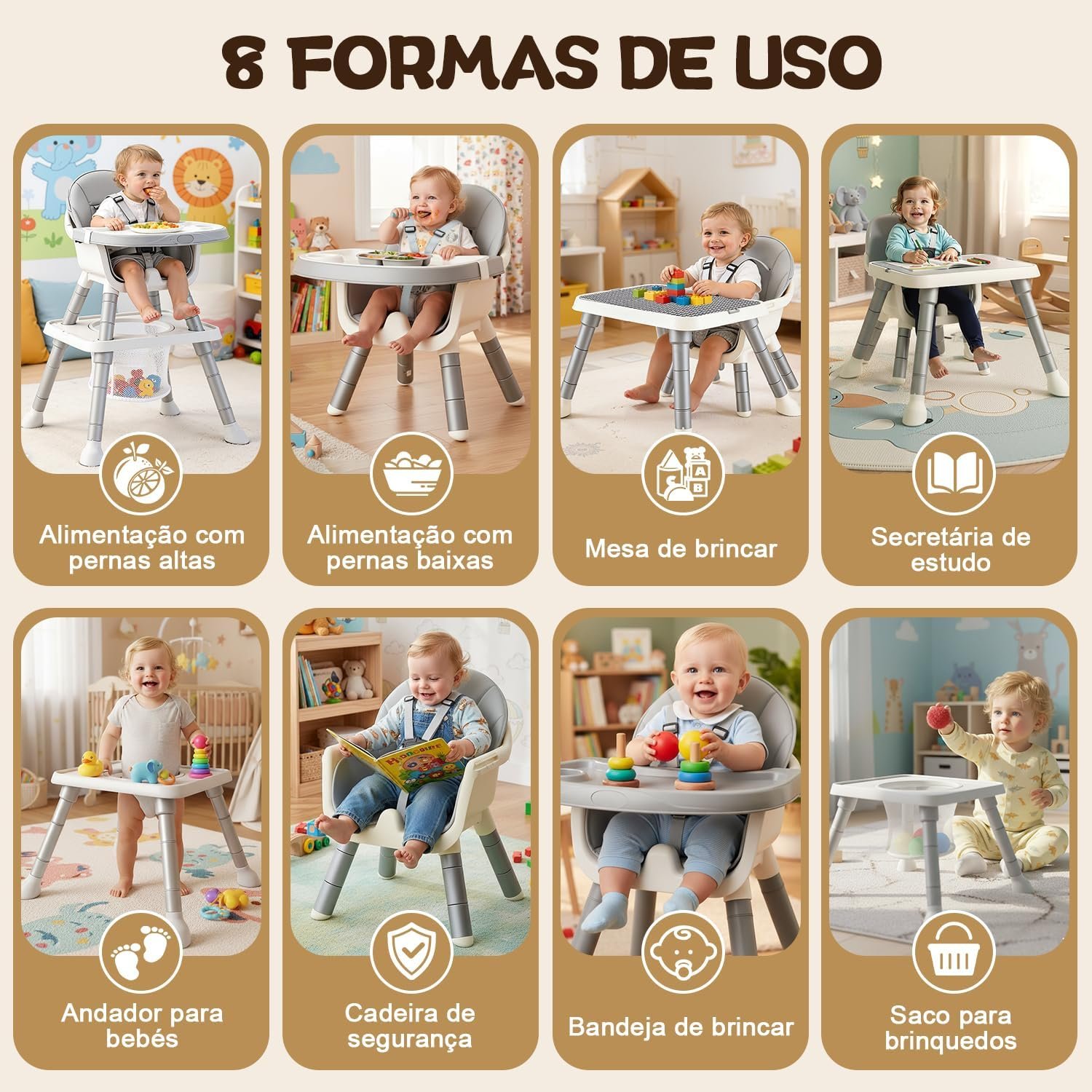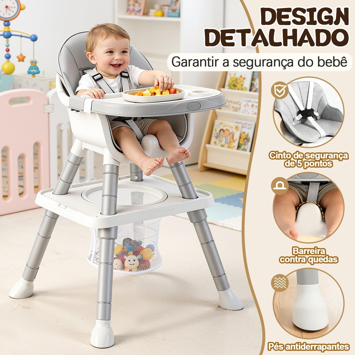 Cadeira de Alimentação 8 em 1, com Cinto de Segurança de 5 Pontos, Bandeja Removível, Cadeira e Mesa de Estudo, Suporta até 50 kg, Cor Cinza