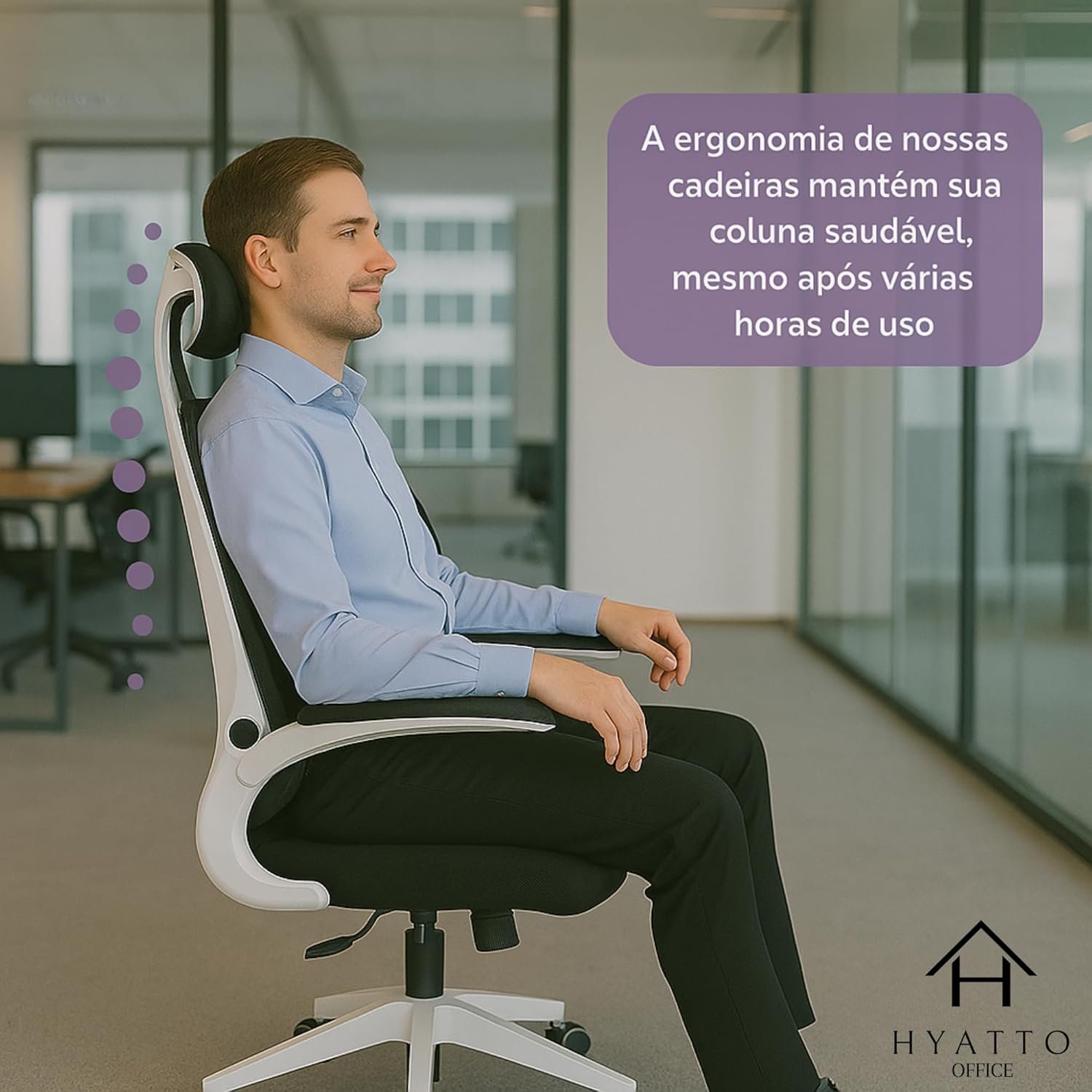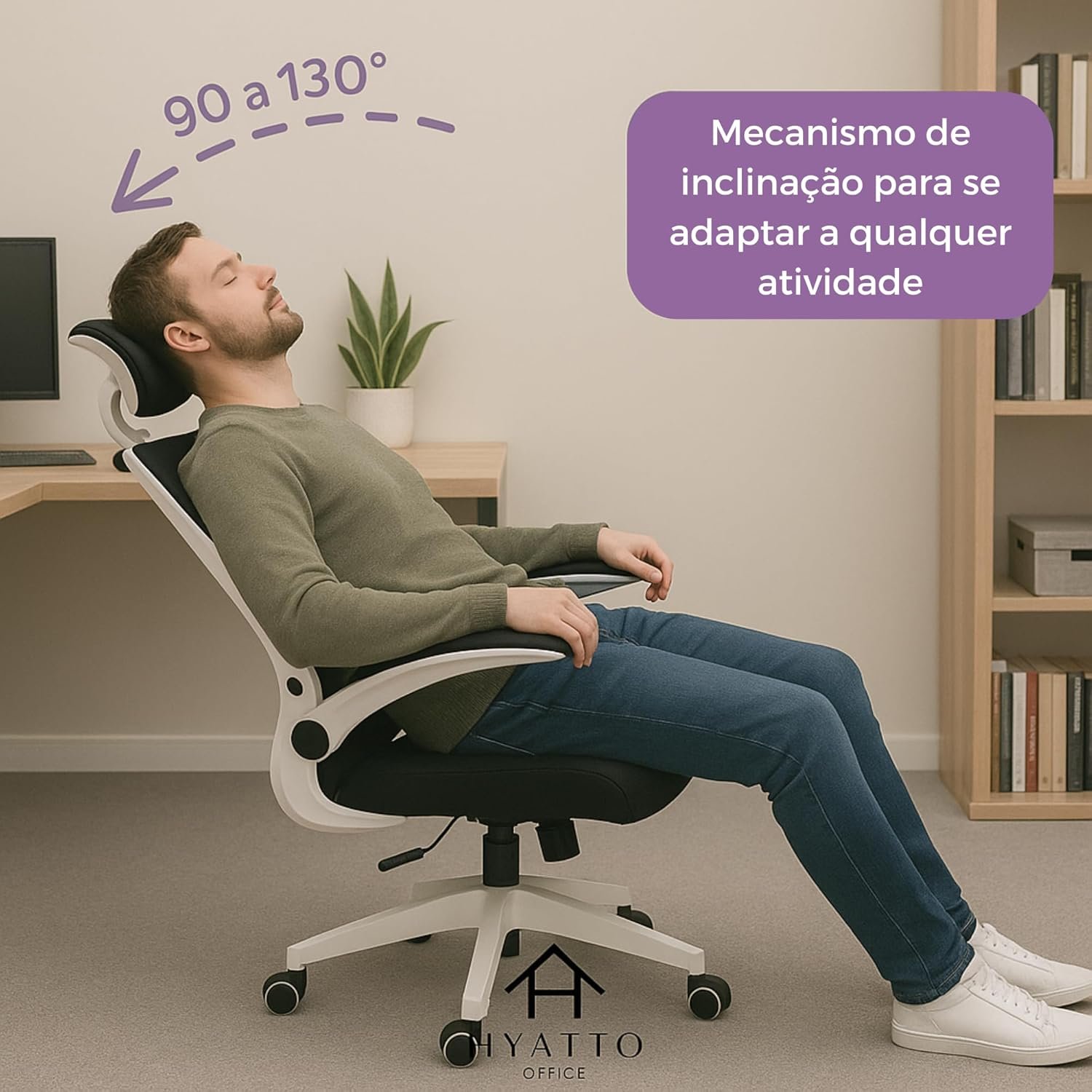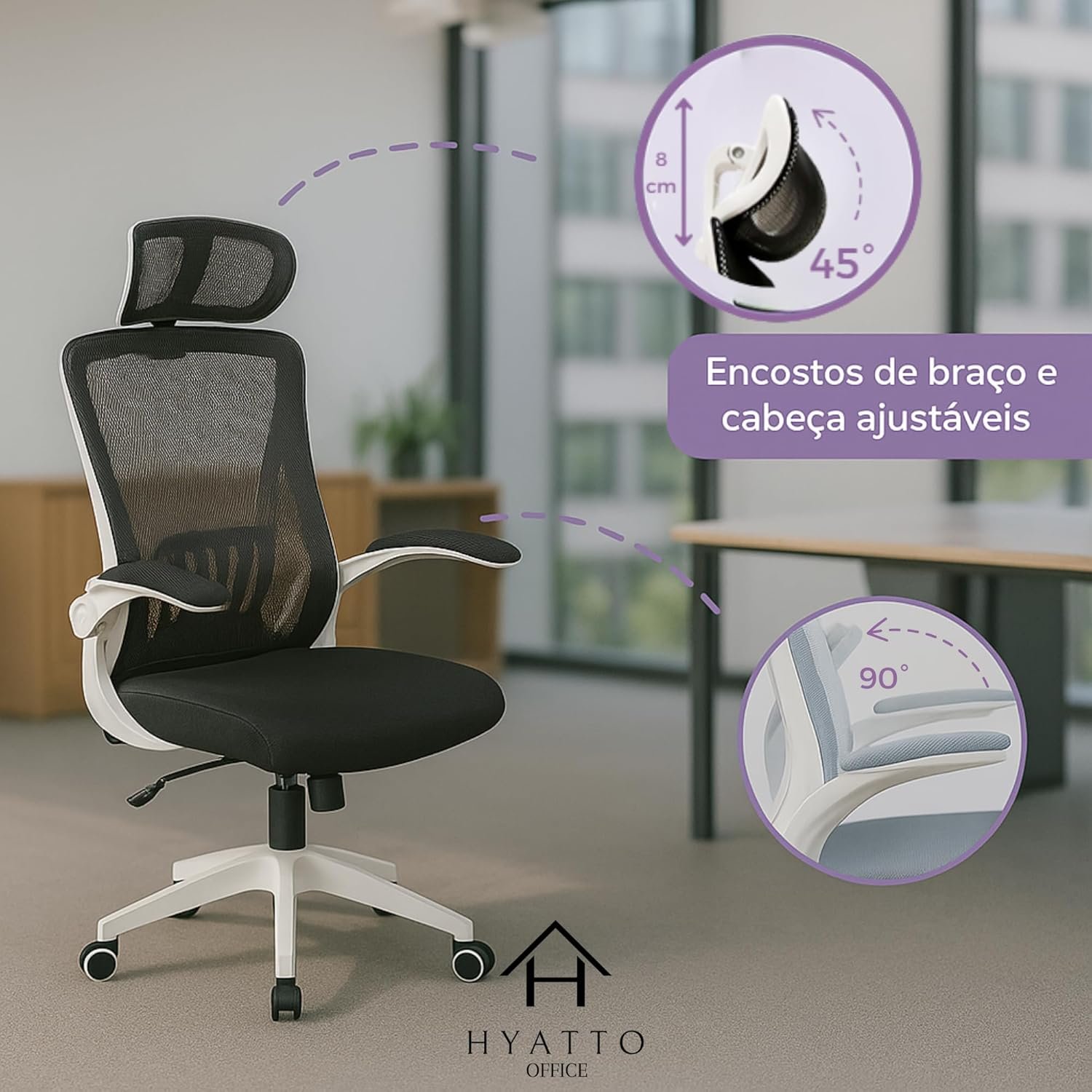 Cadeira de Escritório Ergonômica Giratória, Encosto de Cabeça Ajustável, Estofado Mesh, Tipo Presidente Confortável, Mecanismo de Elevação a gás, Inclinação, Preta e Branca | HYATTO OFFICE |