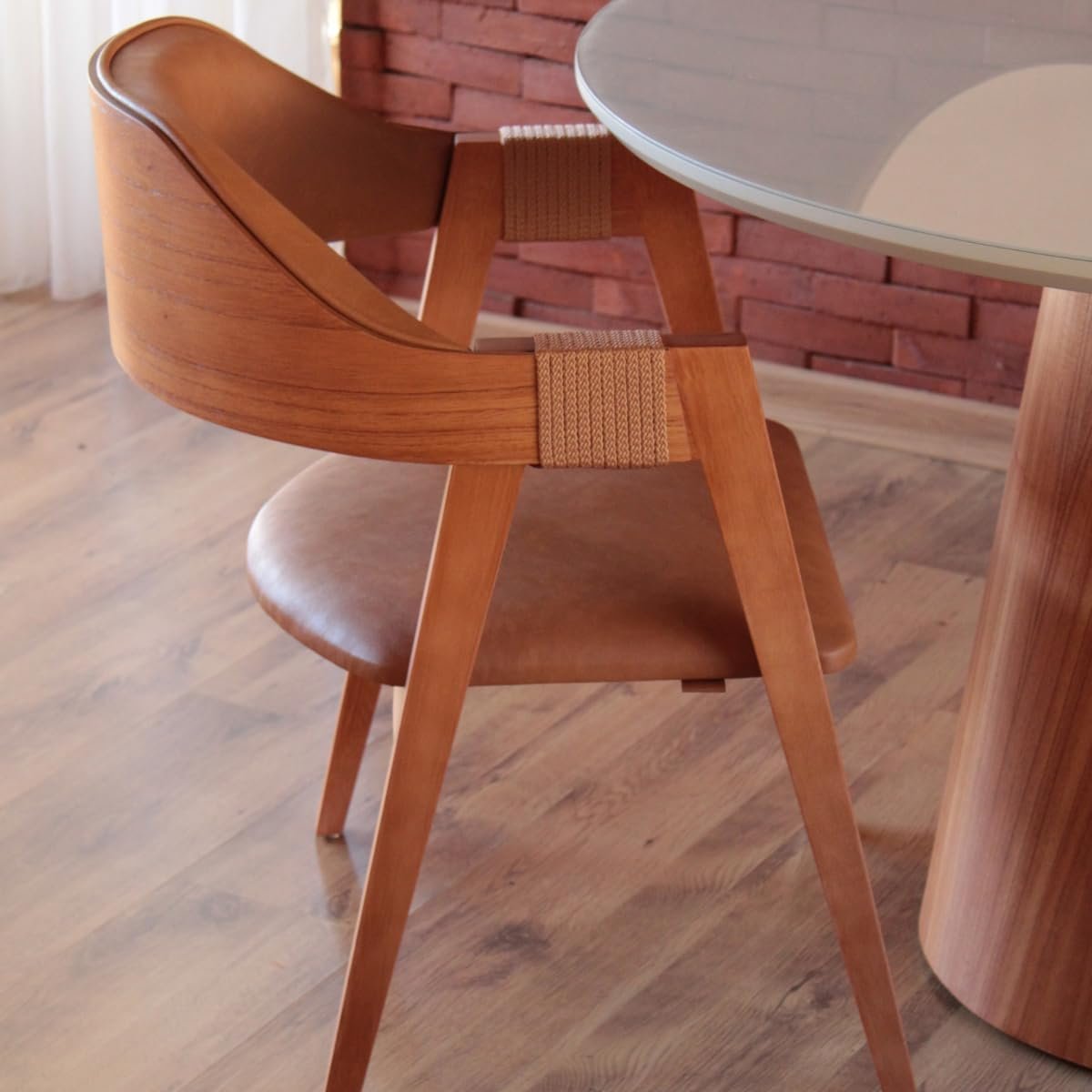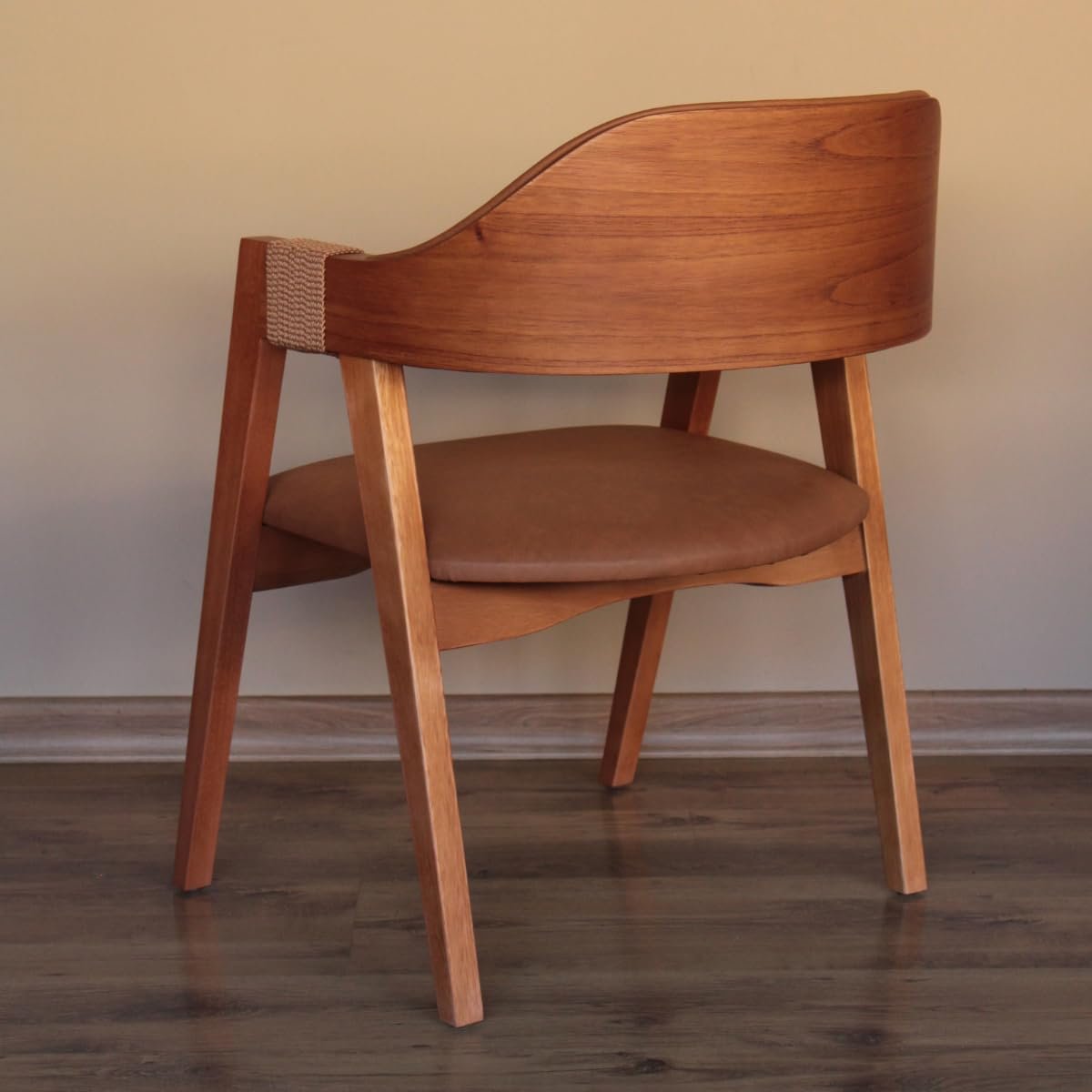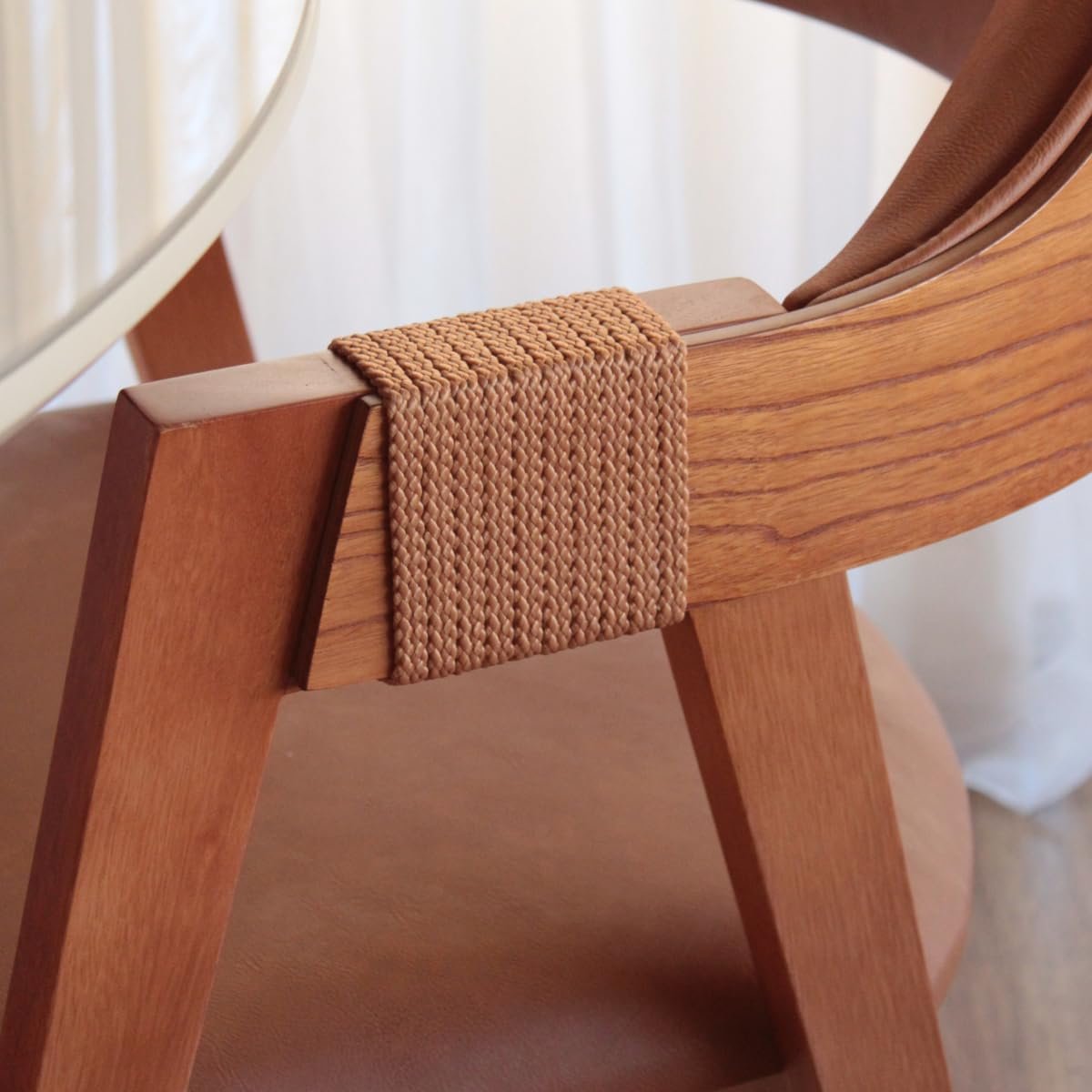 Cadeira de Jantar Com Encosto Curvo Base em Madeira Maciça Detalhe no Braço em Corda Nautica – Emily (Couro Marrom)Cadeira de Jantar Com Encosto Curvo Base em Madeira Maciça Detalhe no Braço em Corda Nautica – Emily (Couro Marrom)