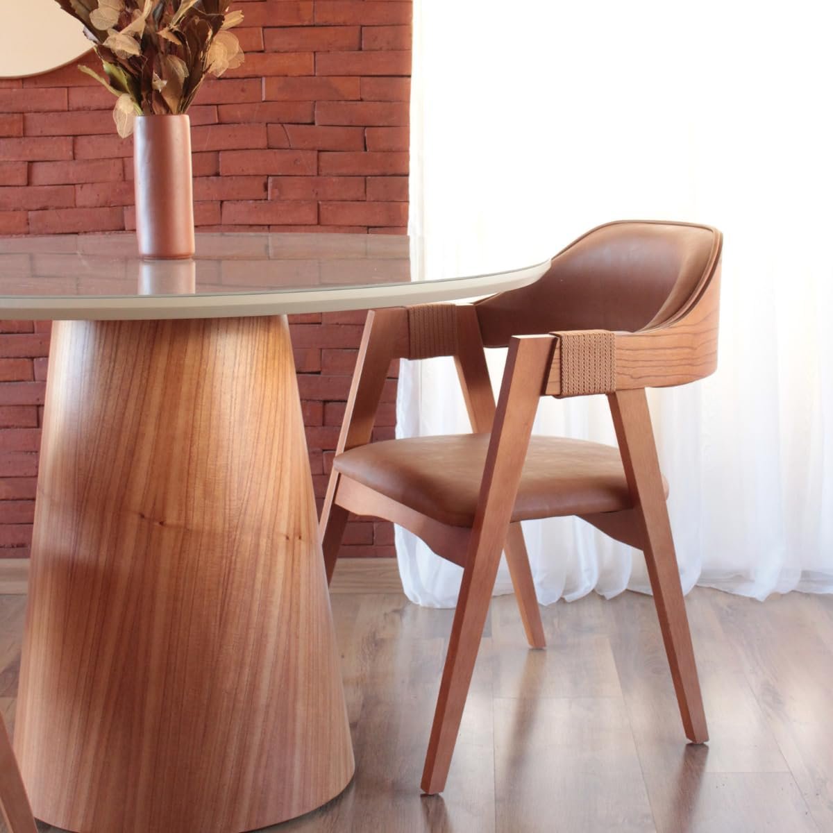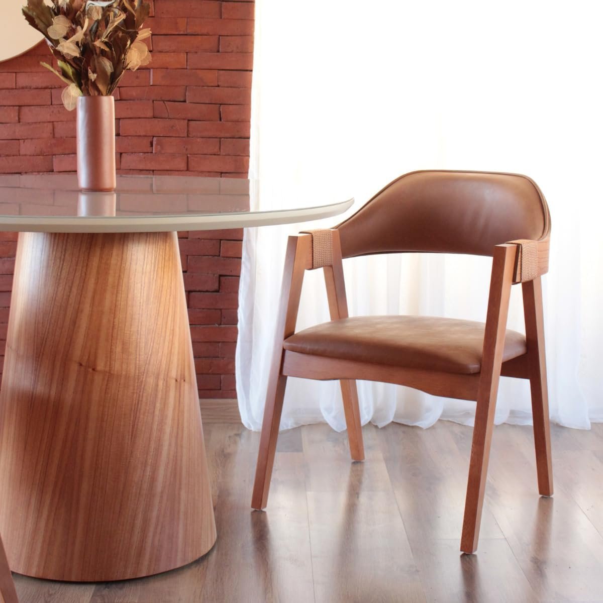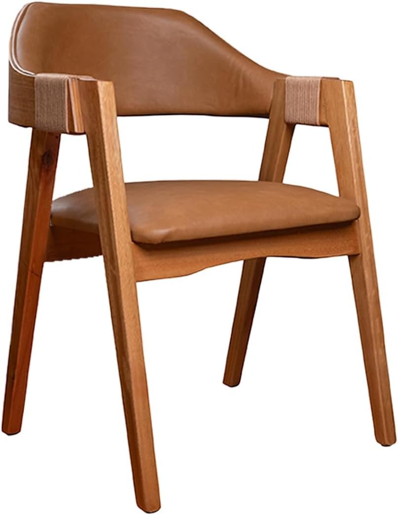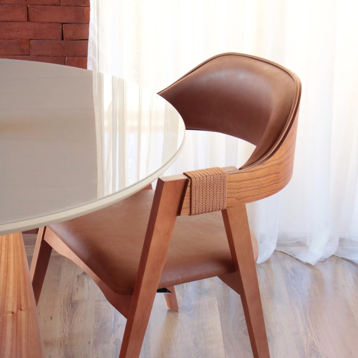 Cadeira de Jantar Com Encosto Curvo Base em Madeira Maciça Detalhe no Braço em Corda Nautica – Emily (Couro Marrom)Cadeira de Jantar Com Encosto Curvo Base em Madeira Maciça Detalhe no Braço em Corda Nautica – Emily (Couro Marrom)