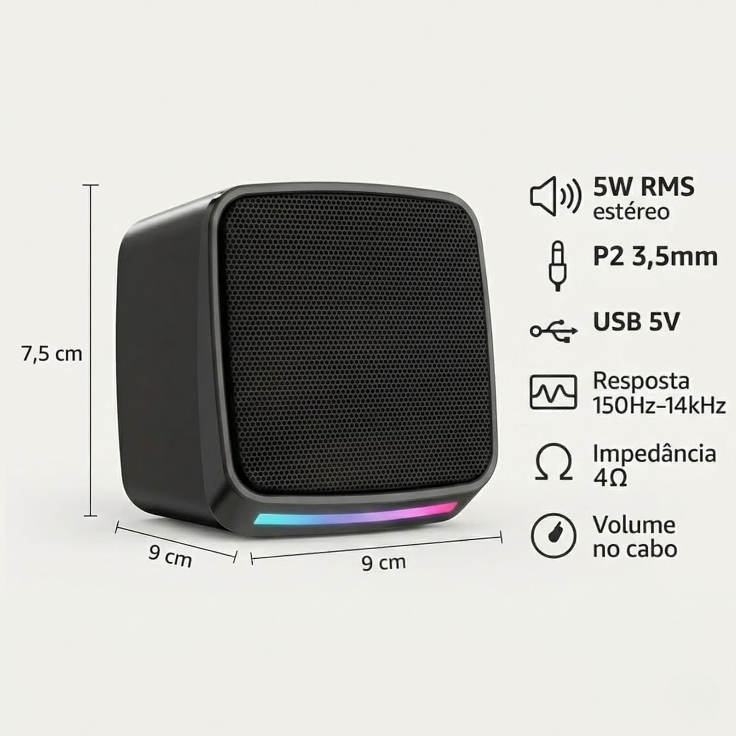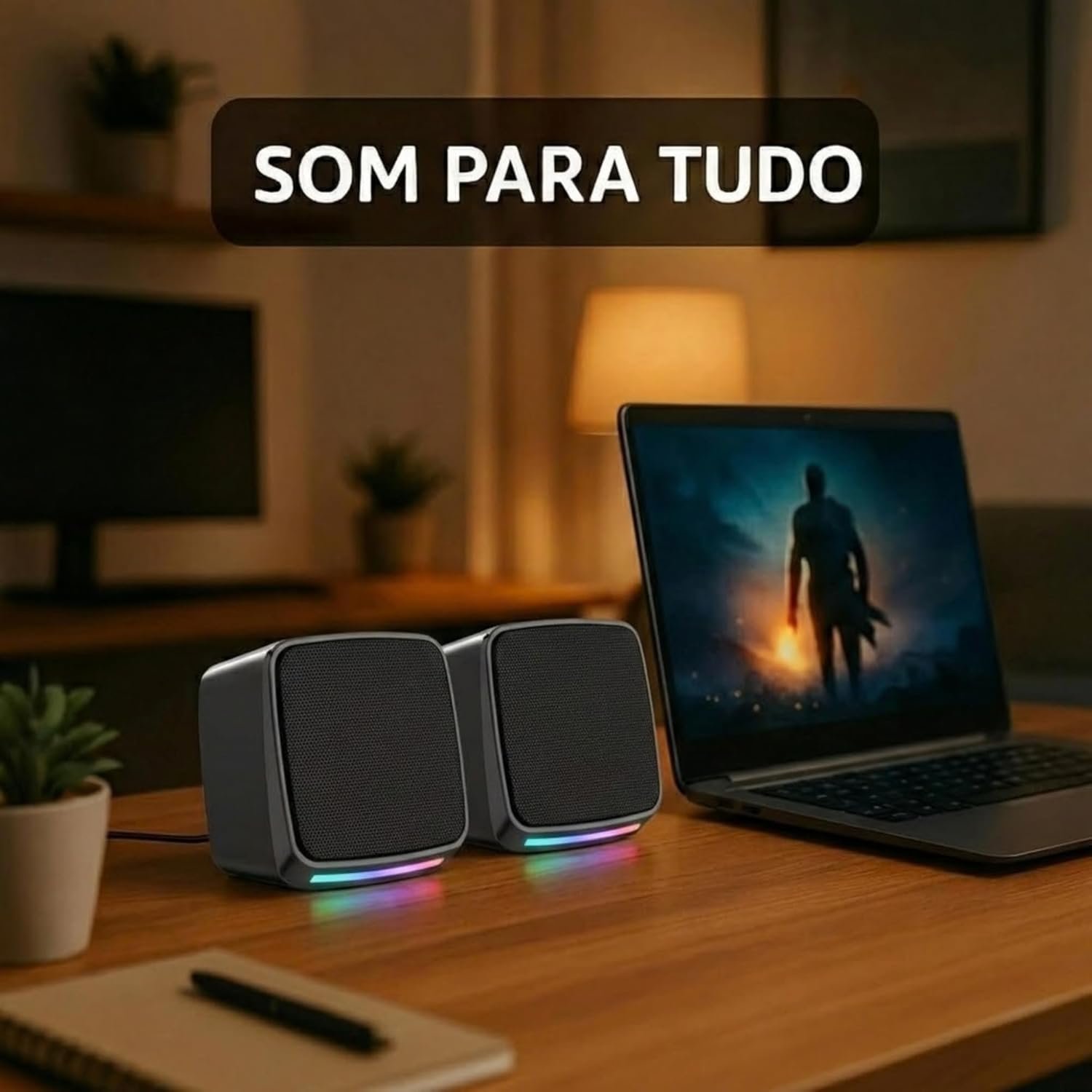 Caixa de Som para PC Gamer 6W RMS, Alto Falante Estéreo com Iluminação RGB, Conexão USB e P2, Controle de Volume, Plug and Play, Ideal para Notebook, TV, Setup Gamer, Home Office e Aulas Online