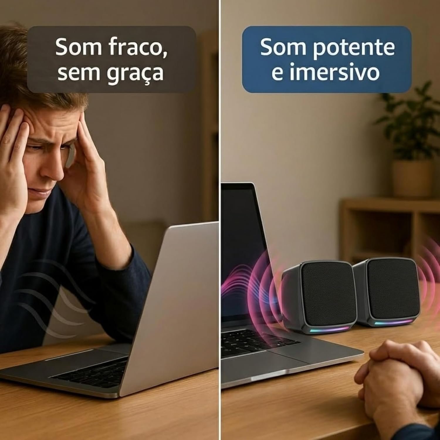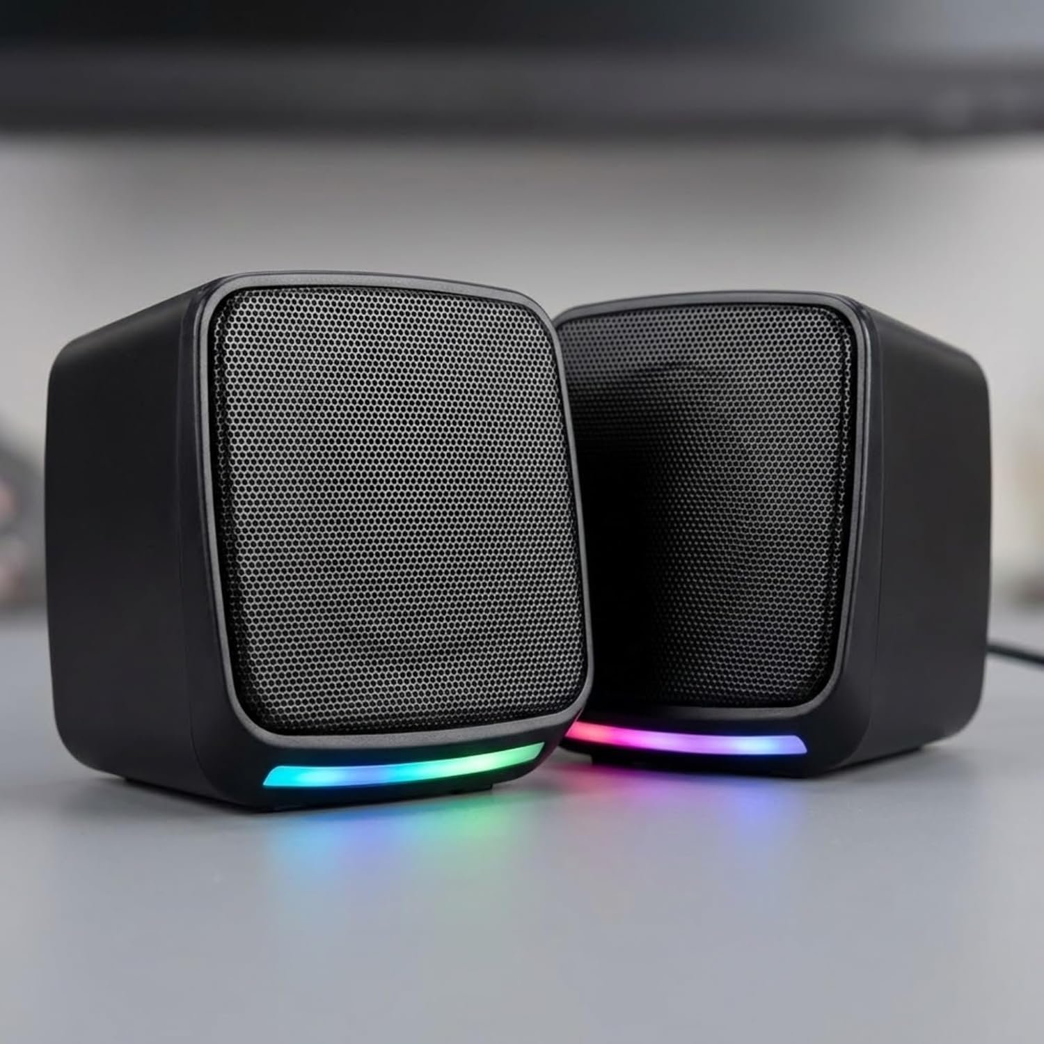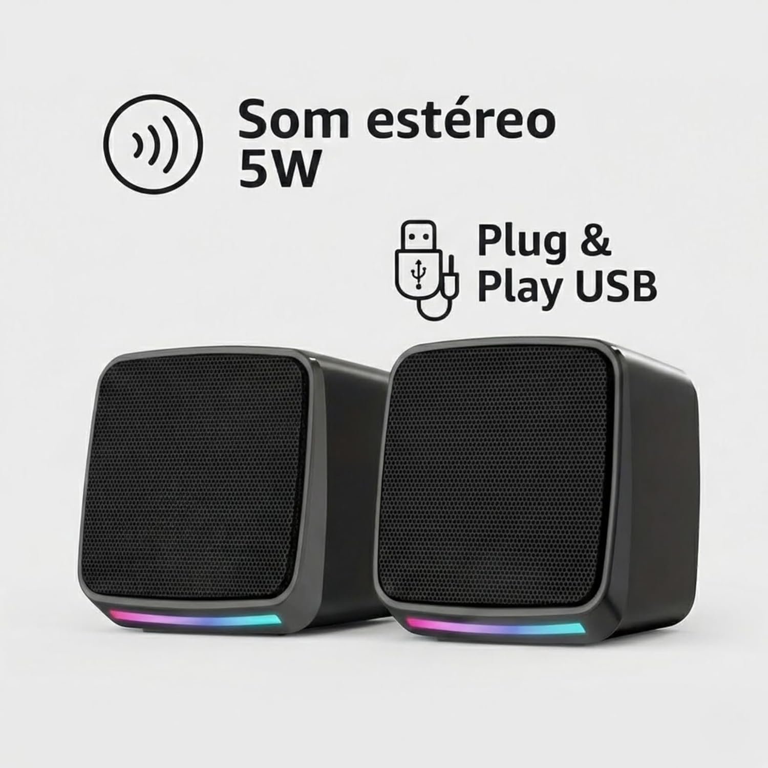 Caixa de Som para PC Gamer 6W RMS, Alto Falante Estéreo com Iluminação RGB, Conexão USB e P2, Controle de Volume, Plug and Play, Ideal para Notebook, TV, Setup Gamer, Home Office e Aulas OnlineCaixa de Som para PC Gamer 6W RMS, Alto Falante Estéreo com Iluminação RGB, Conexão USB e P2, Controle de Volume, Plug and Play, Ideal para Notebook, TV, Setup Gamer, Home Office e Aulas Online