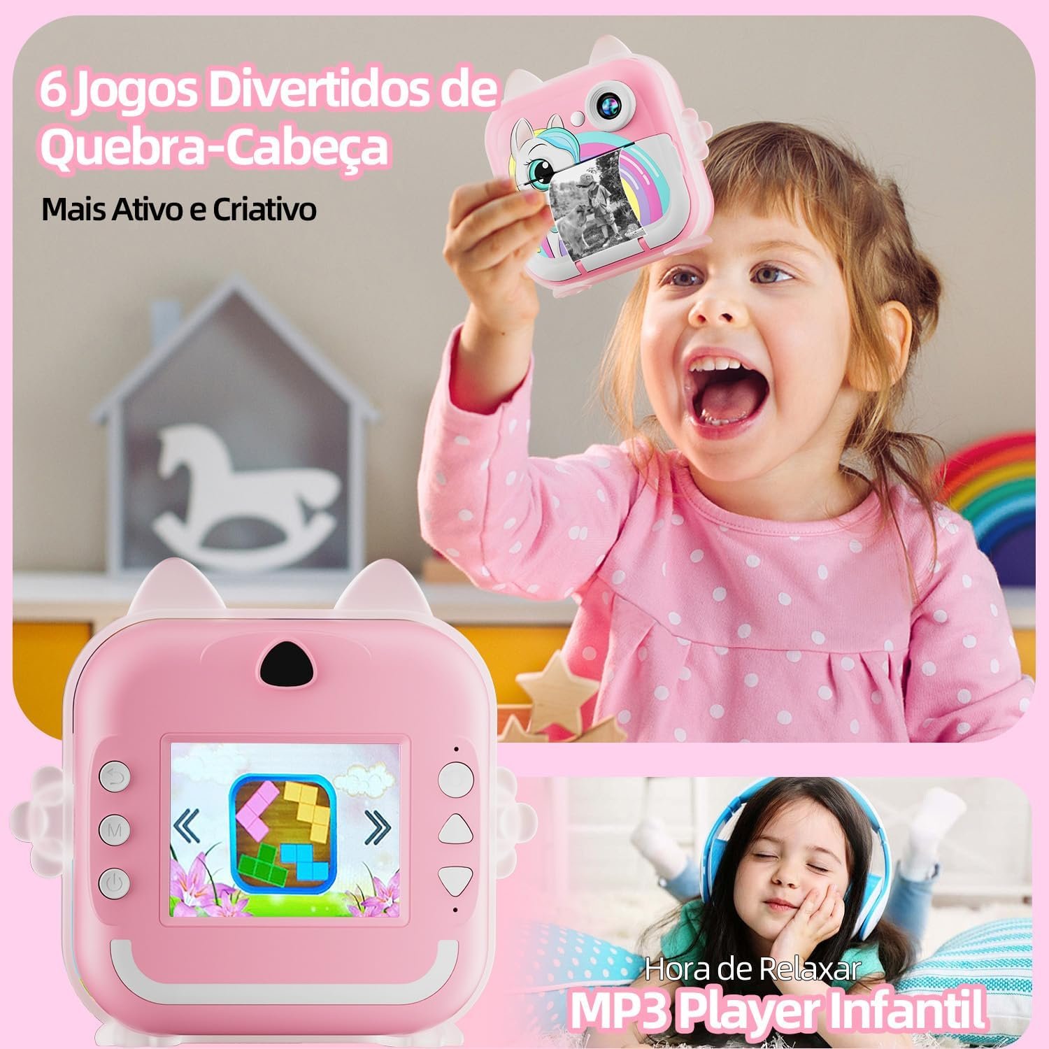Com a Câmera Fotográfica Infantil Rosa, as crianças podem registrar momentos especiais, imprimir fotos em alta qualidade de 20MP, gravar vídeos, criar time-lapses, jogar e muito mais em um único dispositivo portátil. Equipada com tela de 2,4 polegadas, zoom 6x e impressão térmica de 200 dpi, esta câmera é perfeita para estimular a criatividade dos pequenos fotógrafos. Leve, compacta e fácil de usar, acompanha papel de impressão para diversão instantânea. Garanta já a sua!
