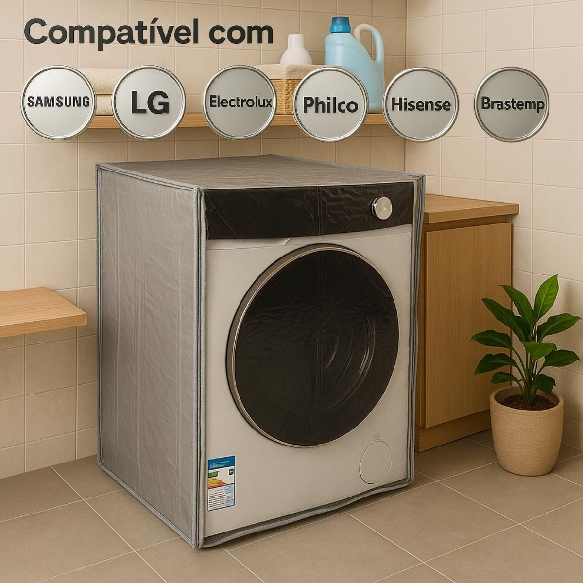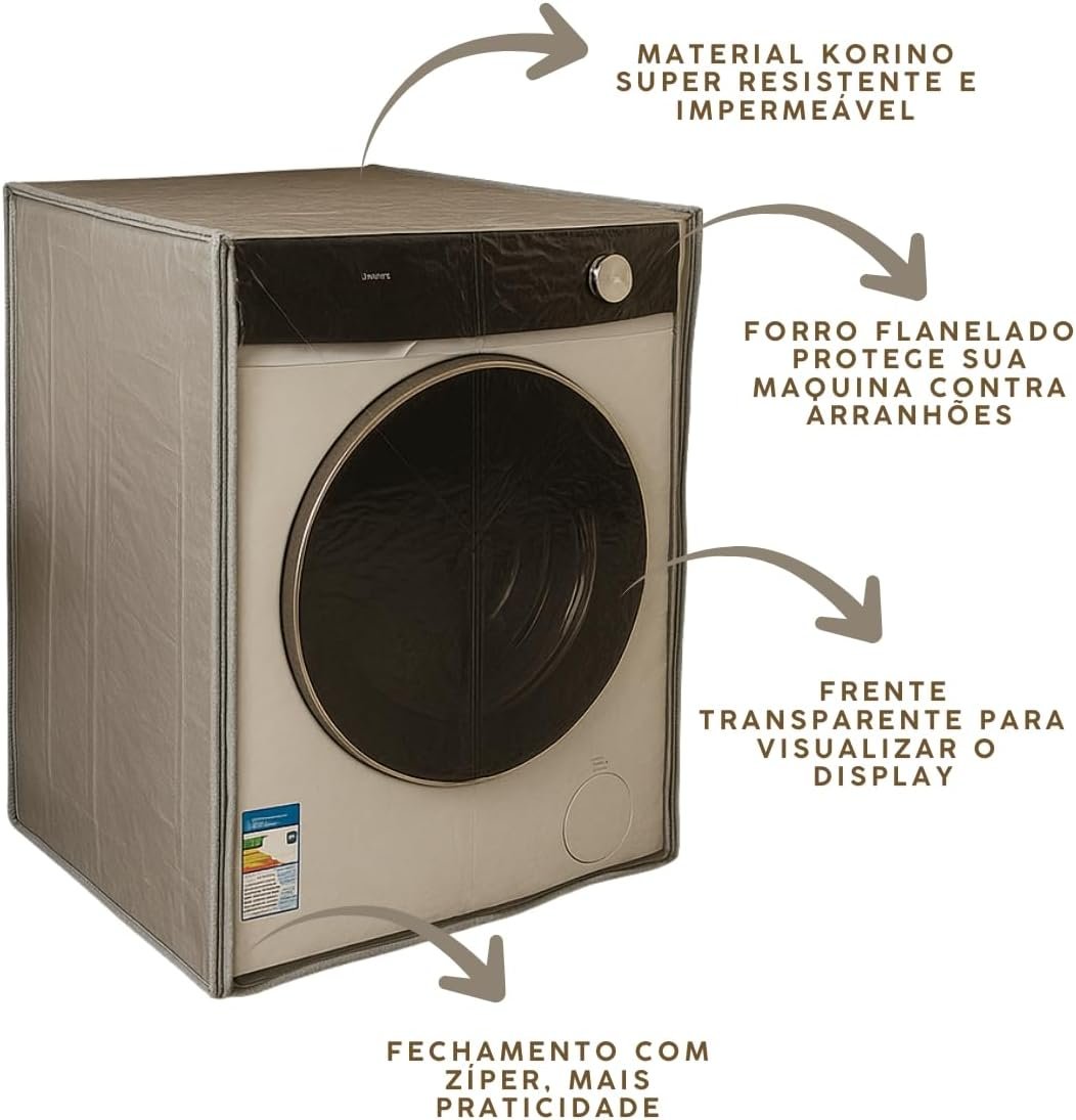 Capa Premium para Lavadora e Lava e Seca 10kg, 11kg, 12kg e 13kg, Material Korino Impermeável Resistente, com Zíper, Flanelada, 84x64x661cm, Proteção Contra Sol e Poeira