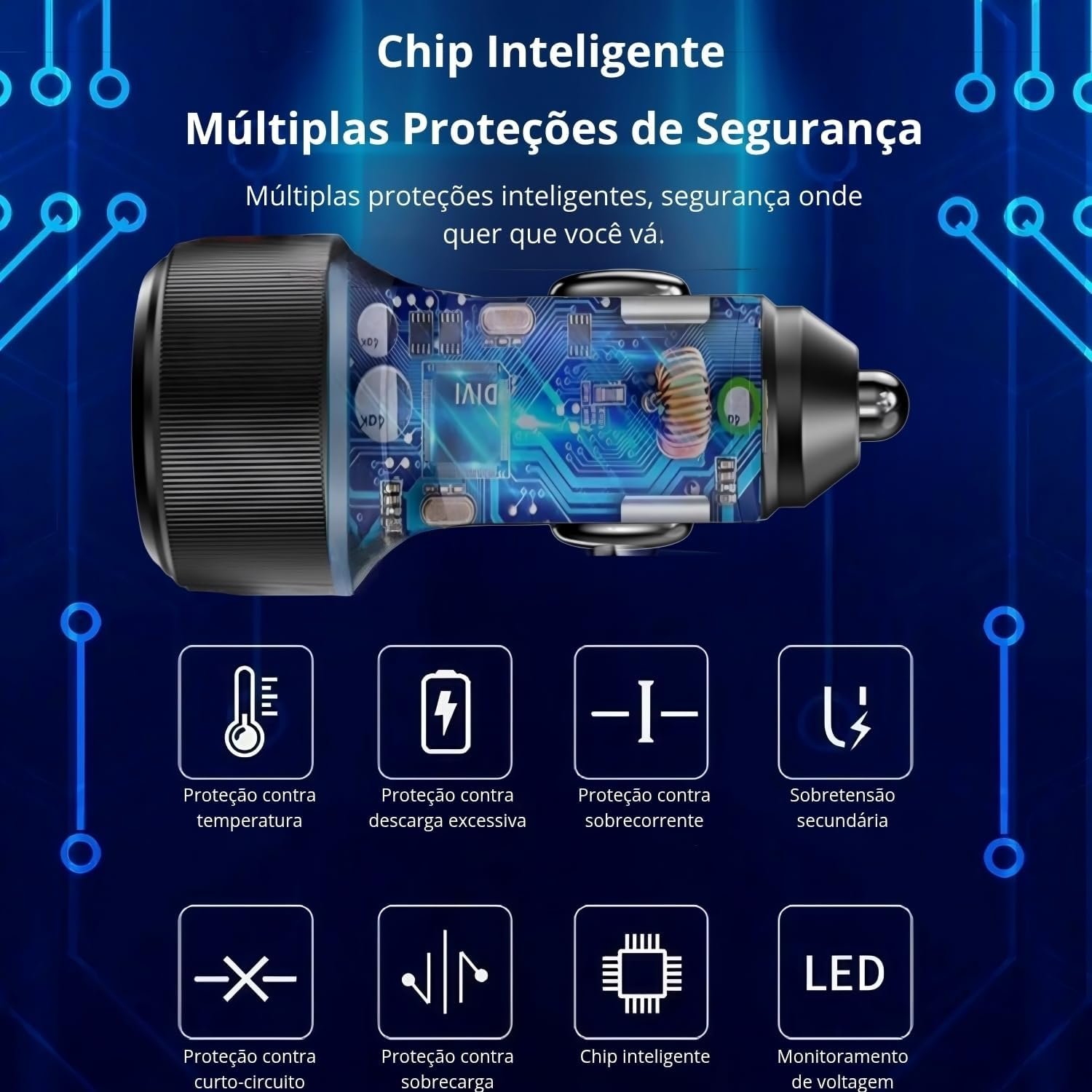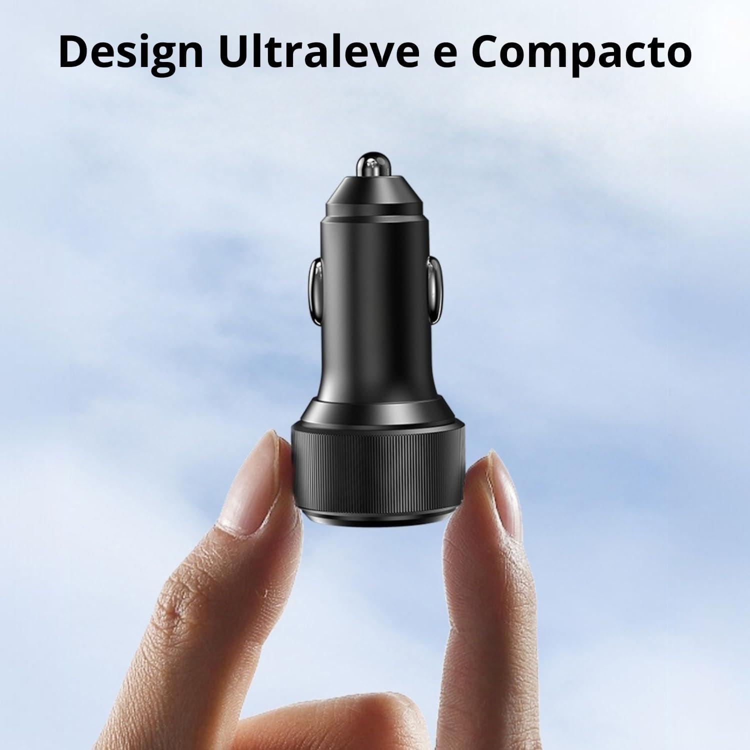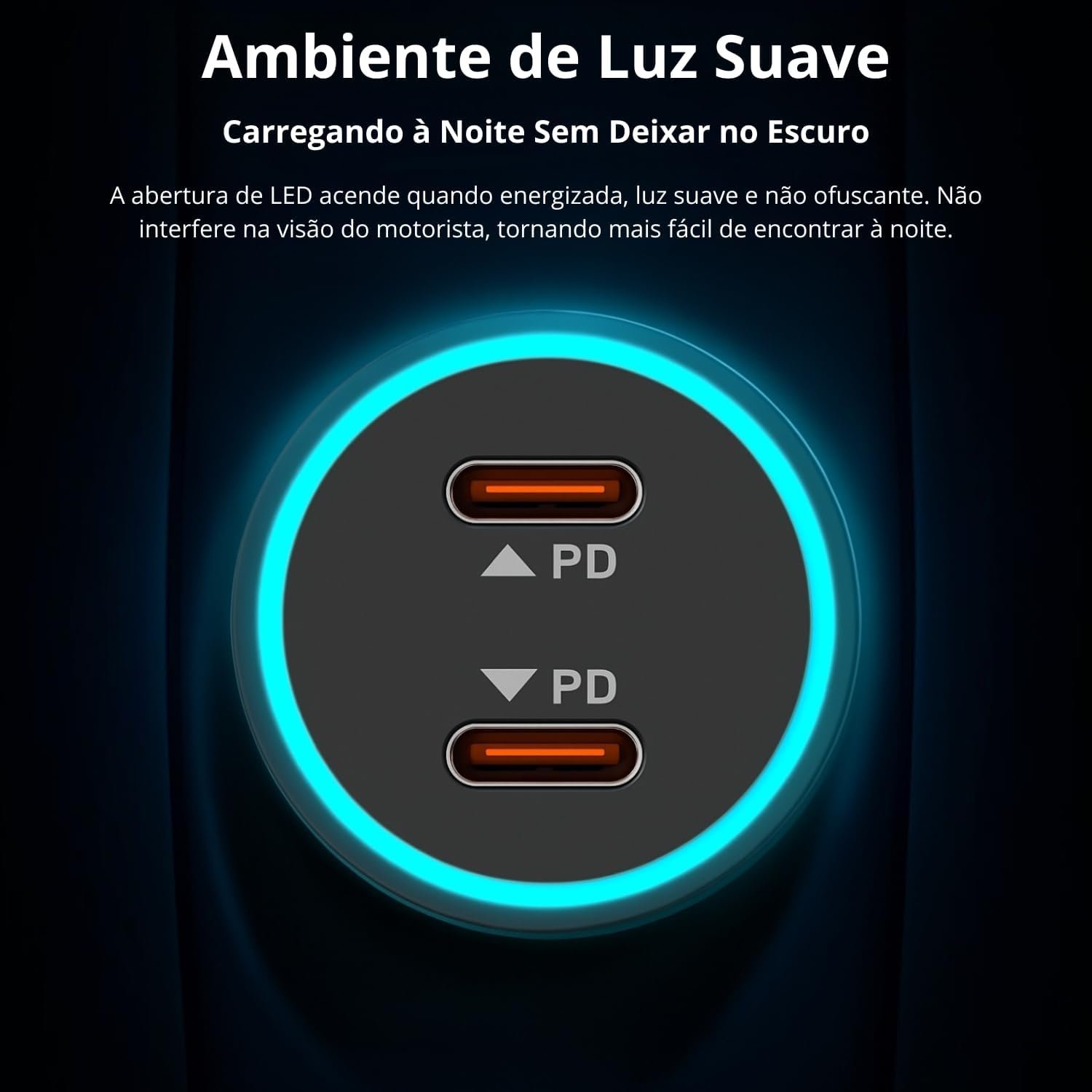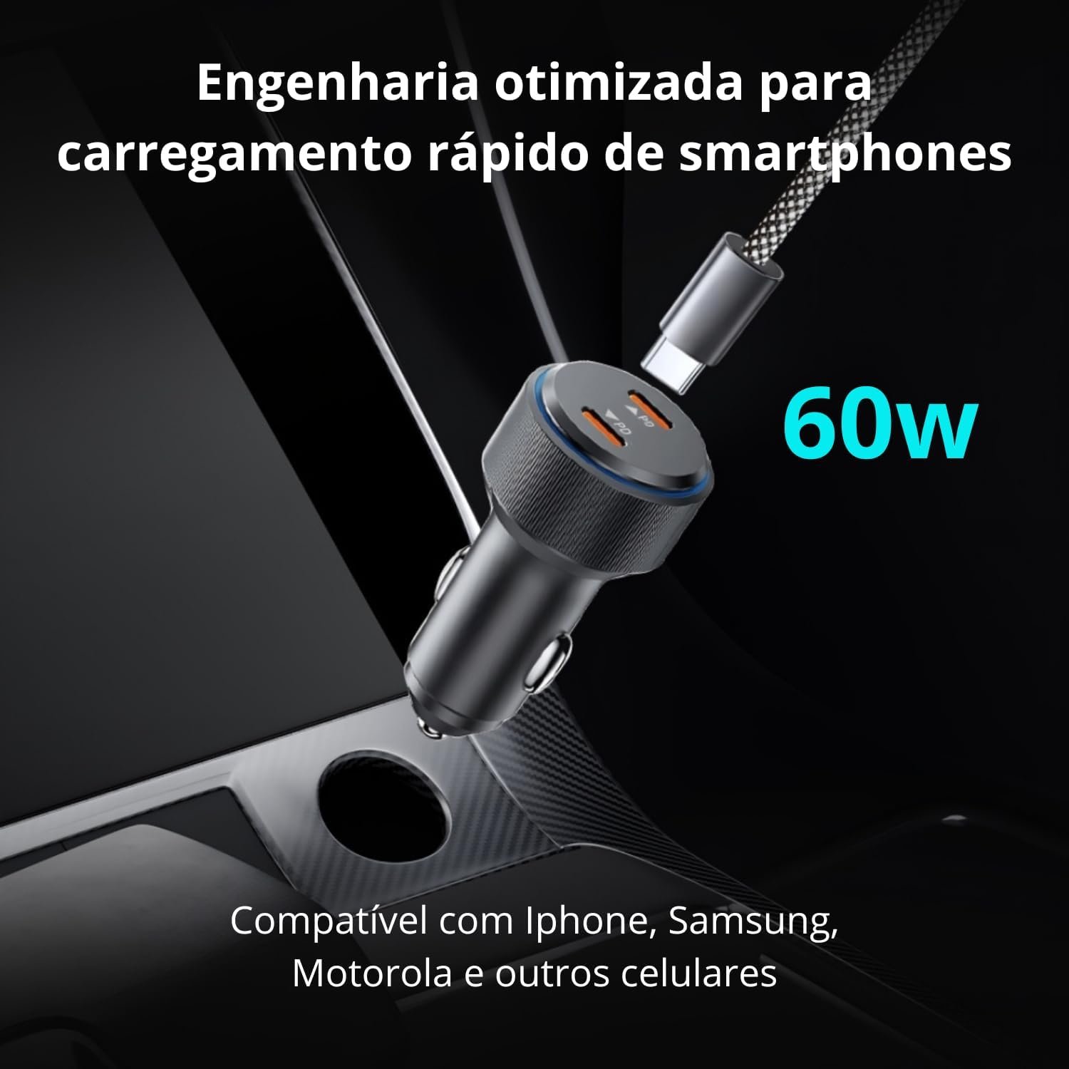 Carregador Veicular 60W Turbo com Cabo USB-C – Duas Entradas USB-C, Carregamento Ultra Rápido, Proteção Inteligente e LED Indicador para Celulares e Tablets