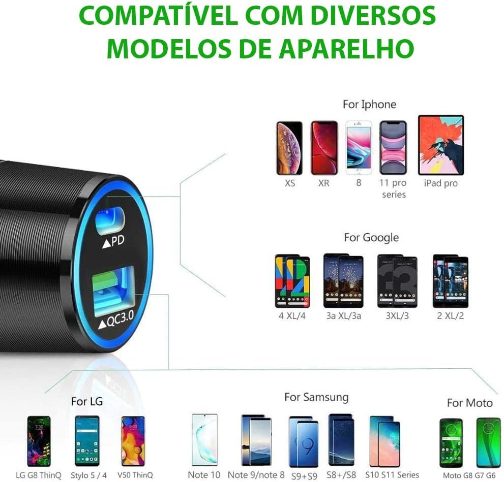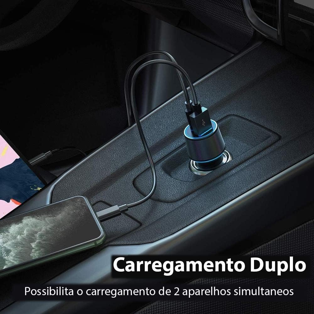 Carregador Veicular Universal 38w Turbo Com 2 Entradas 1 Usb e 1 Usb-C Carga Ultra R�pida Entrada 12v 24V (Preta)