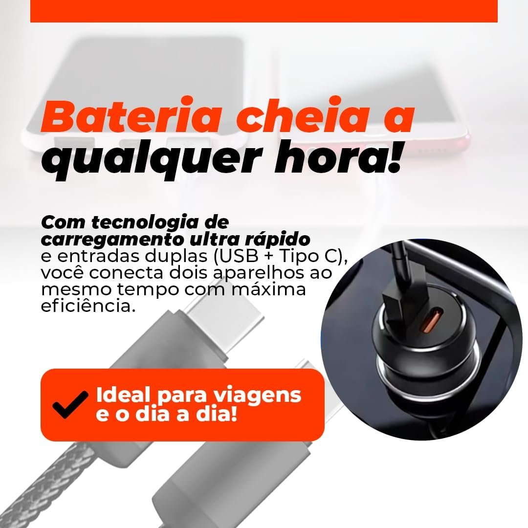 Carregador Veicular Universal Rápido para Carro Automóvel 60W Turbo Power com 2 Entradas USB + Cabo USB-C Incluso Carregamento Ultra Rápido para Celulares, Tablets e Dispositivos Eletrônicos – PremiumCarregador Veicular Universal Rápido para Carro Automóvel 60W Turbo Power com 2 Entradas USB + Cabo USB-C Incluso Carregamento Ultra Rápido para Celulares, Tablets e Dispositivos Eletrônicos – Premium