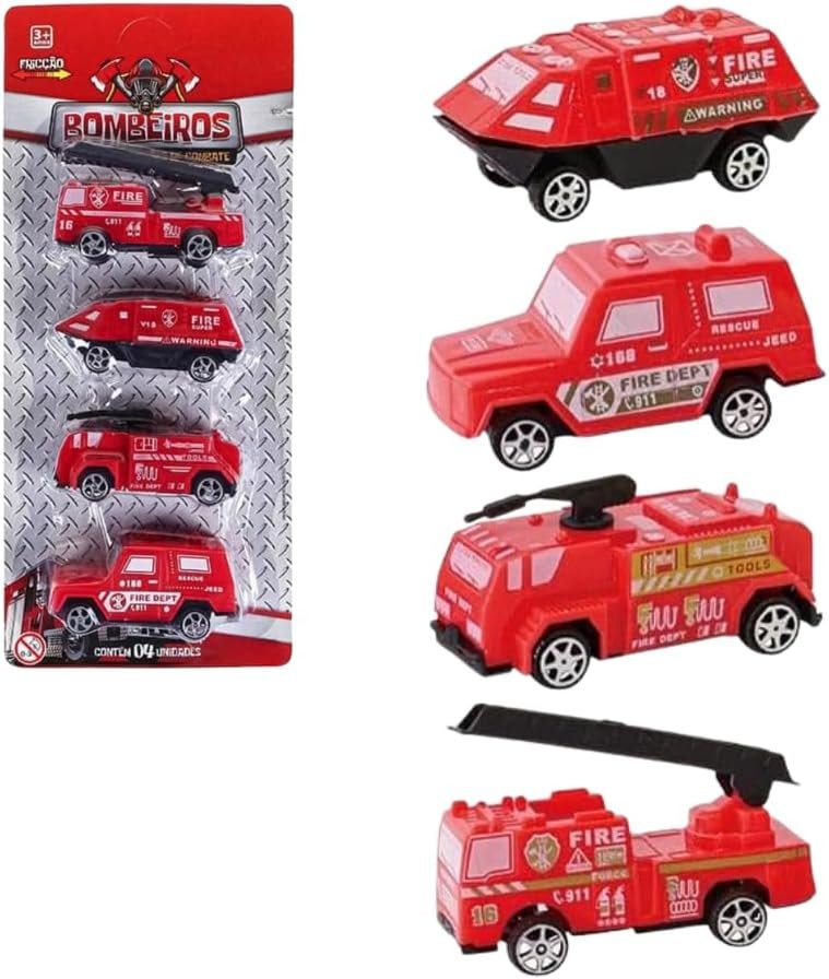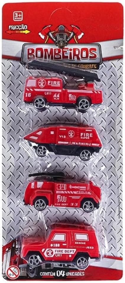 Conjunto Caminhão de Bombeiro 4 Peças com Fricção – Brinquedo Educativo Infantil com Veículos de Resgate Coloridos