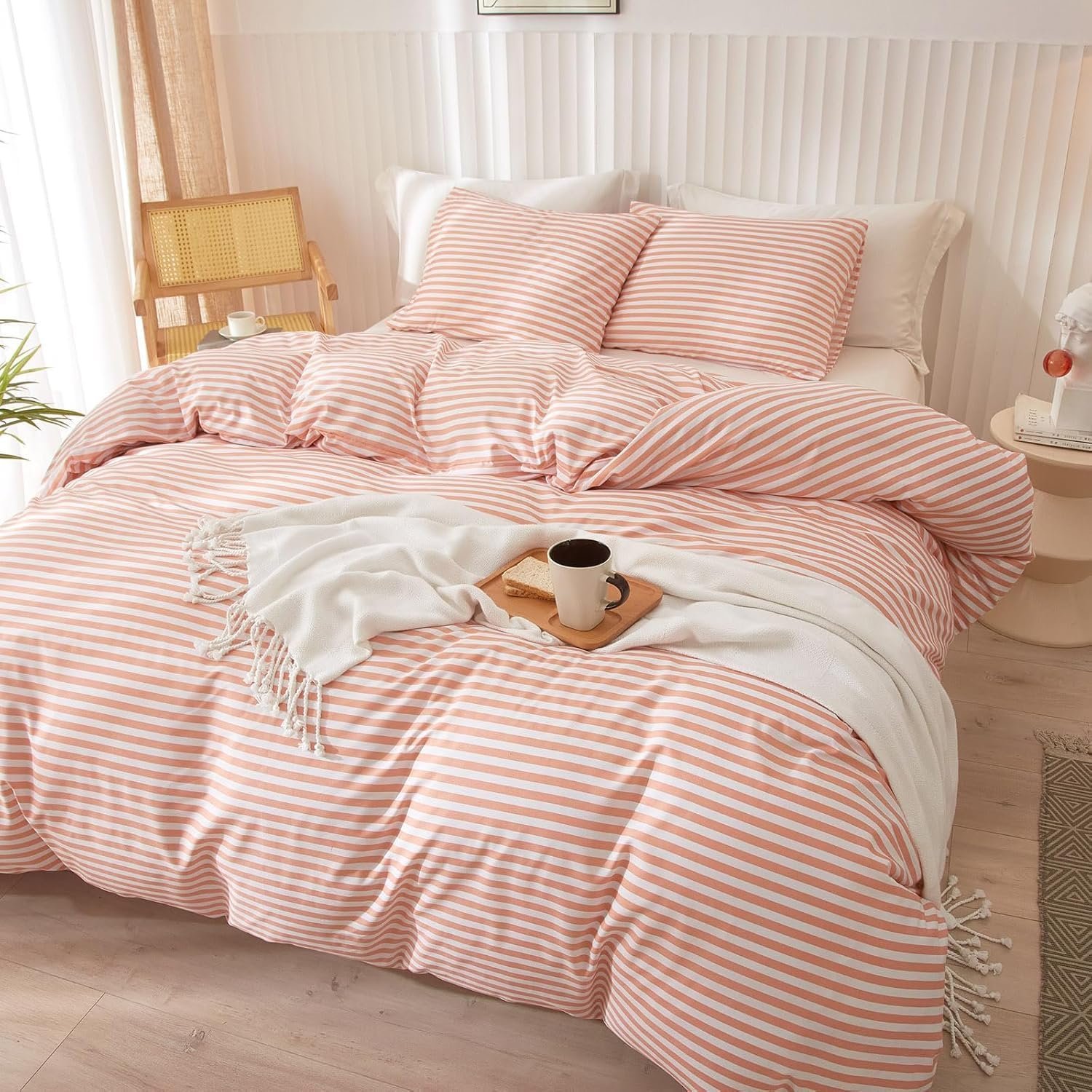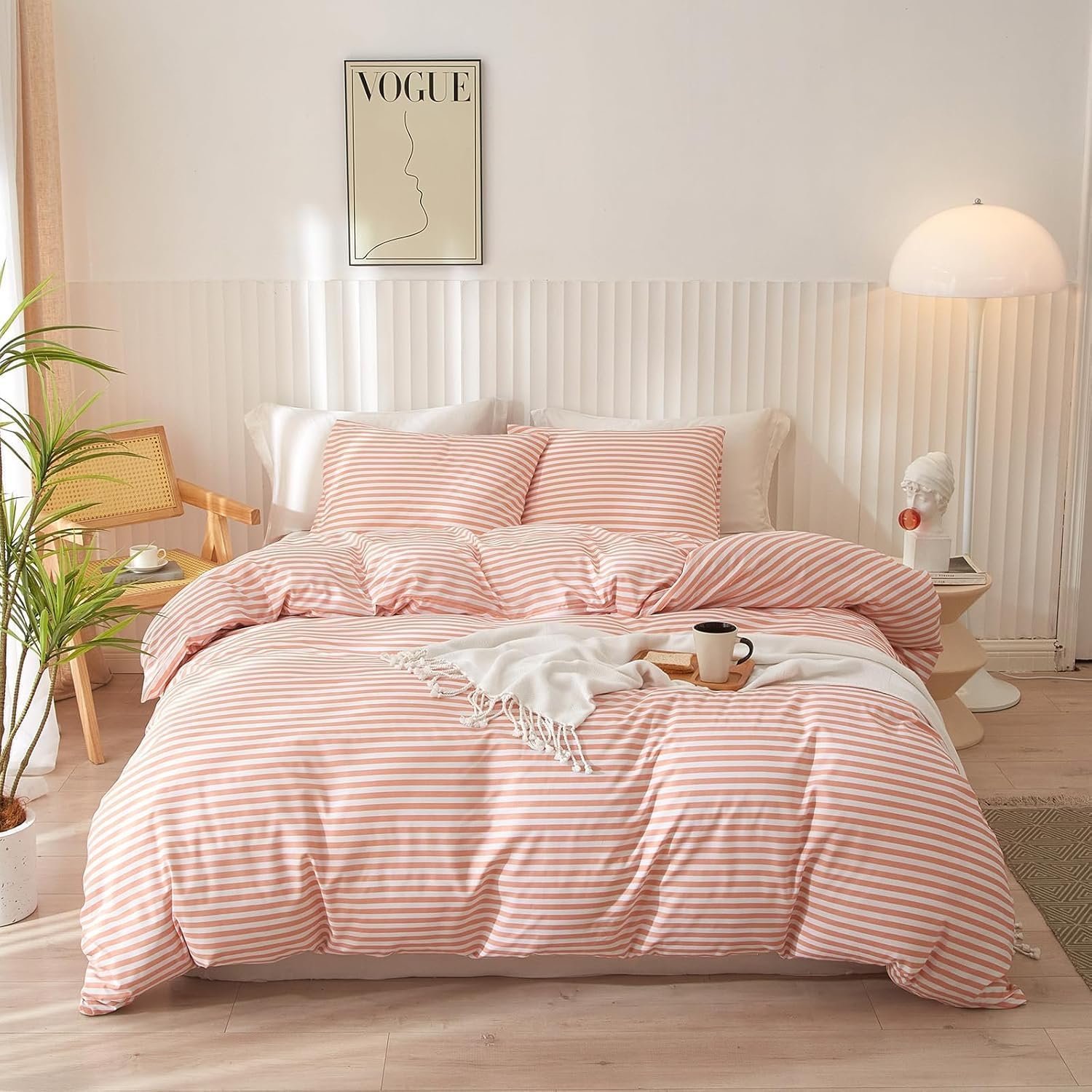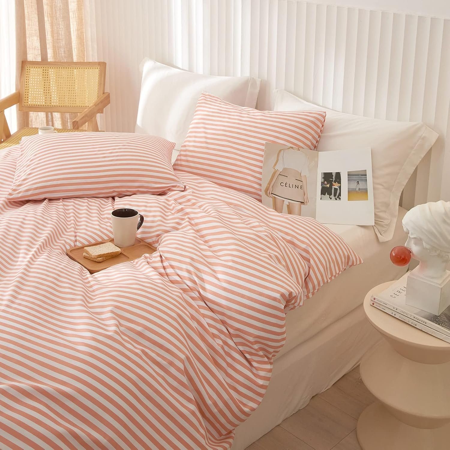 Conjunto de edredom completo, com estampa de listras rosa e brancas, estilo moderno, com 2 fronhas, leve, 3 peças, boêmio, conjunto de edredom listrado e fofo