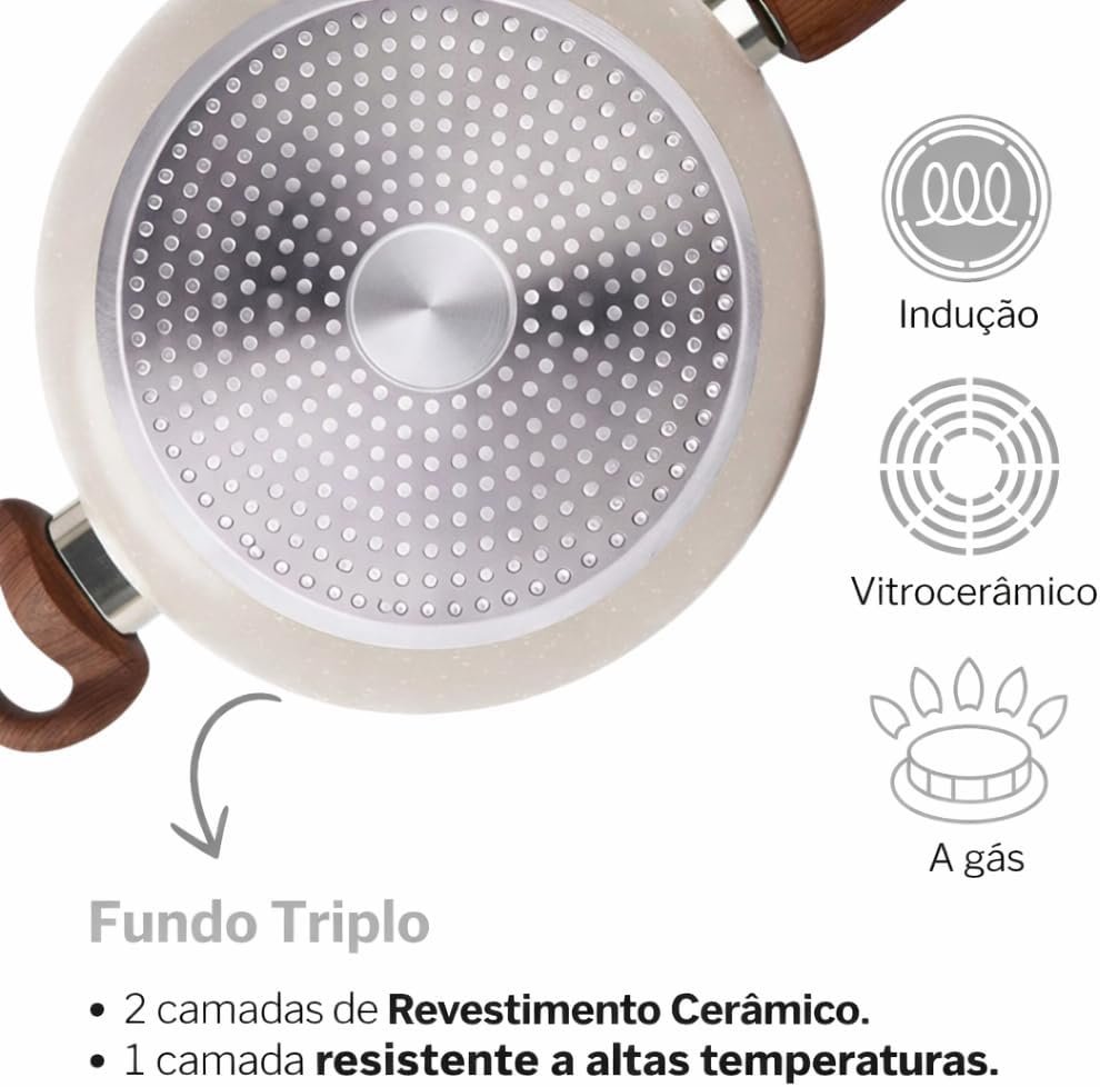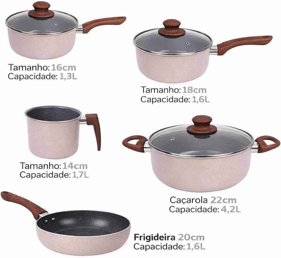 Conjunto Jogo de Panelas Antiaderente 5 Peças Com Tampa Revestimento Interno Antiaderente Bege e Cinza Inclui Frigideira Caçarola Panelas Leiteira Linha Gourmet