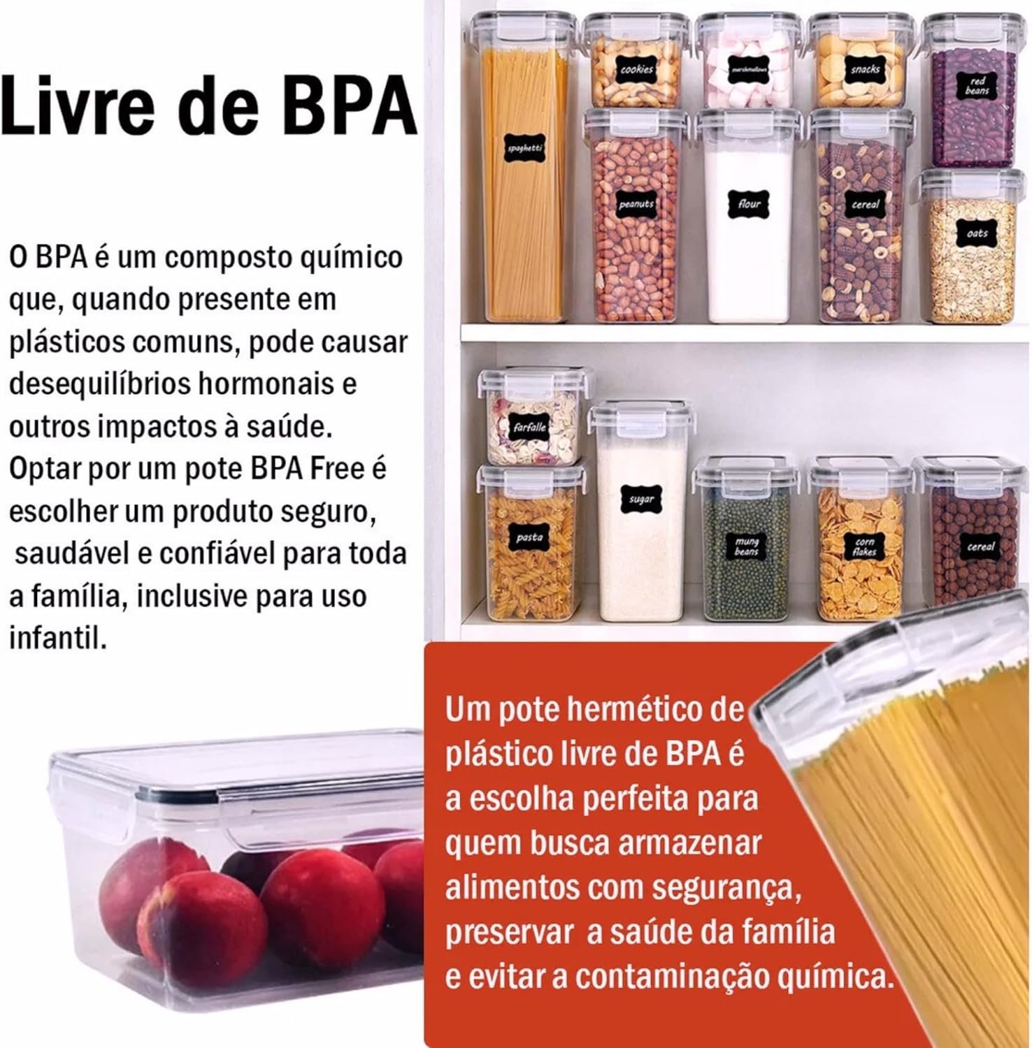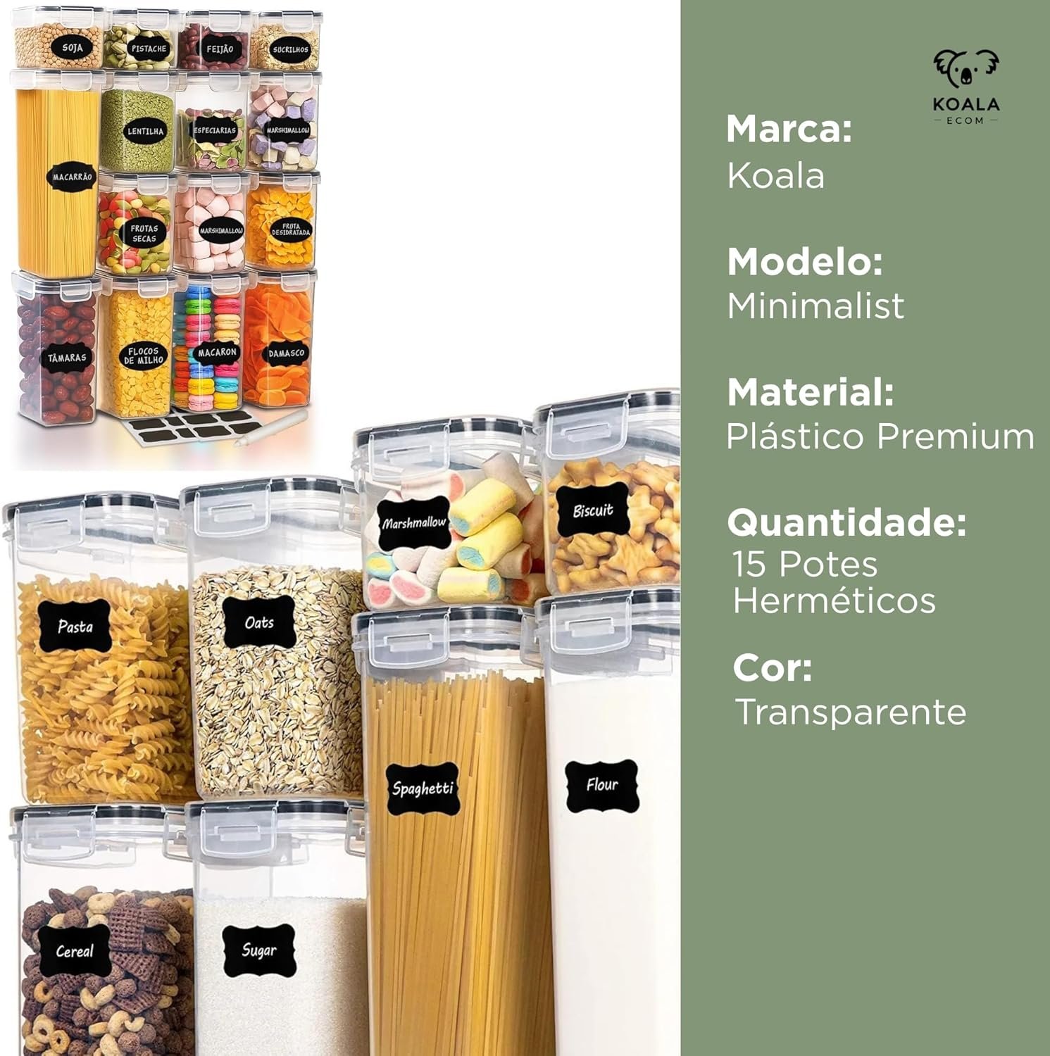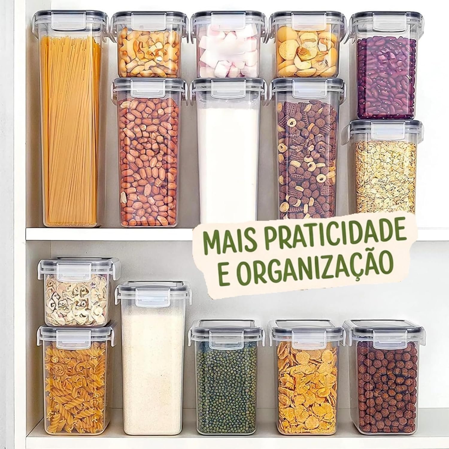 Conjunto Kit 15 Potes Mantimentos Herméticos para Cozinha e Despensa, Tampa com Vedação Silicone, Organizadores Tampa Com Trava Ideal para Armazenar Grãos, Cereais, Farinha e Massas