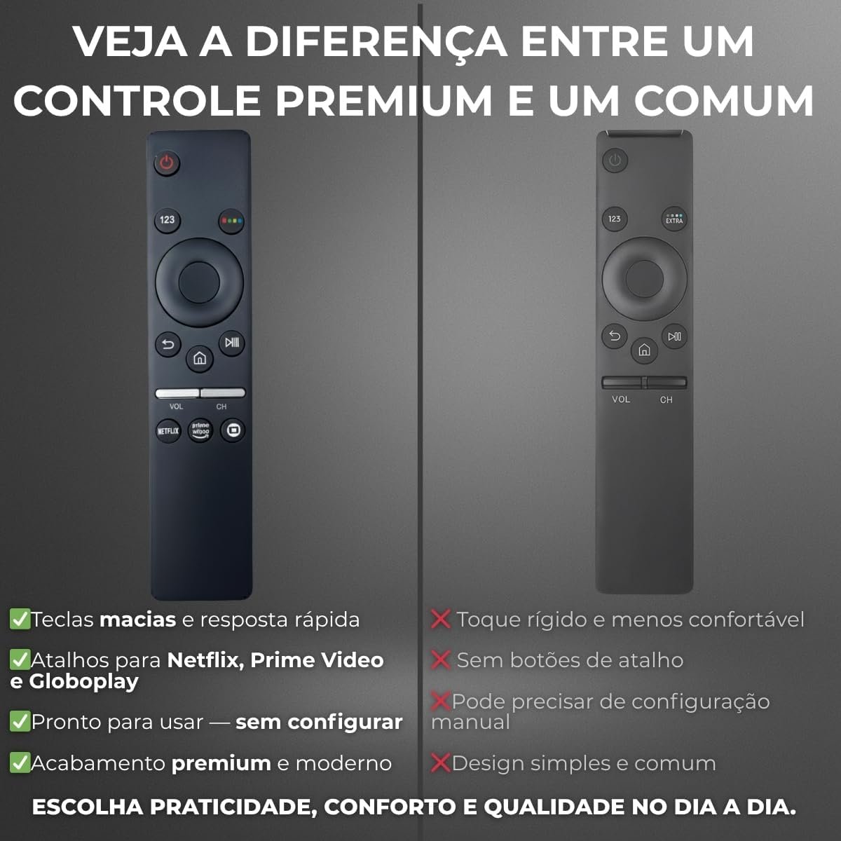 Transforme sua experiência de assistir TV com o Controle Remoto Compatível com Smart TV Samsung. Com botões dedicados para Netflix, Prime Video e Globoplay, você terá acesso rápido aos seus conteúdos favoritos. Funciona perfeitamente em modelos 4K, QLED, Crystal, Neo QLED e OLED, proporcionando conveniência e praticidade. E o melhor de tudo: não precisa de configuração adicional. Aproveite ao máximo sua Smart TV Samsung com este controle remoto intuitivo e eficiente!