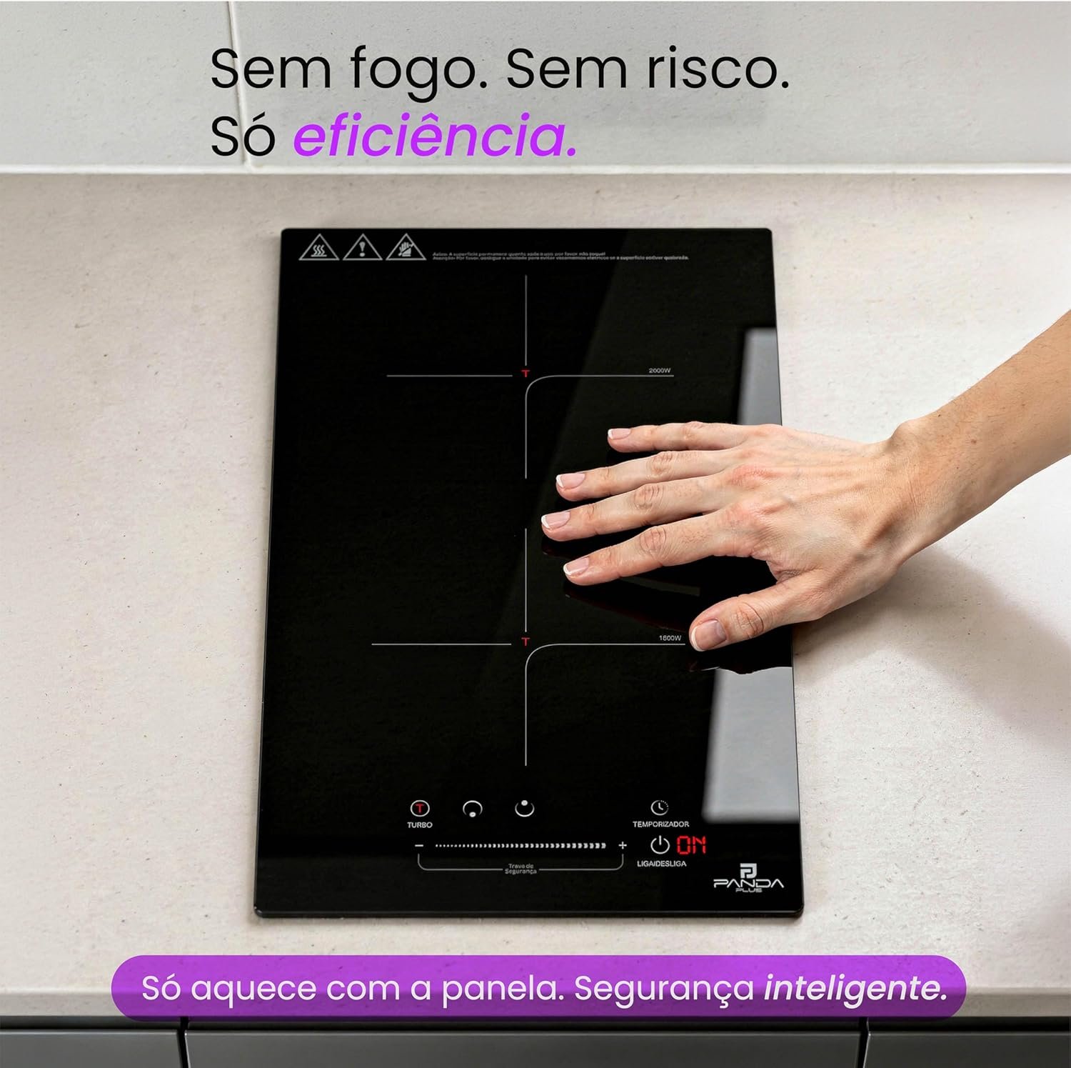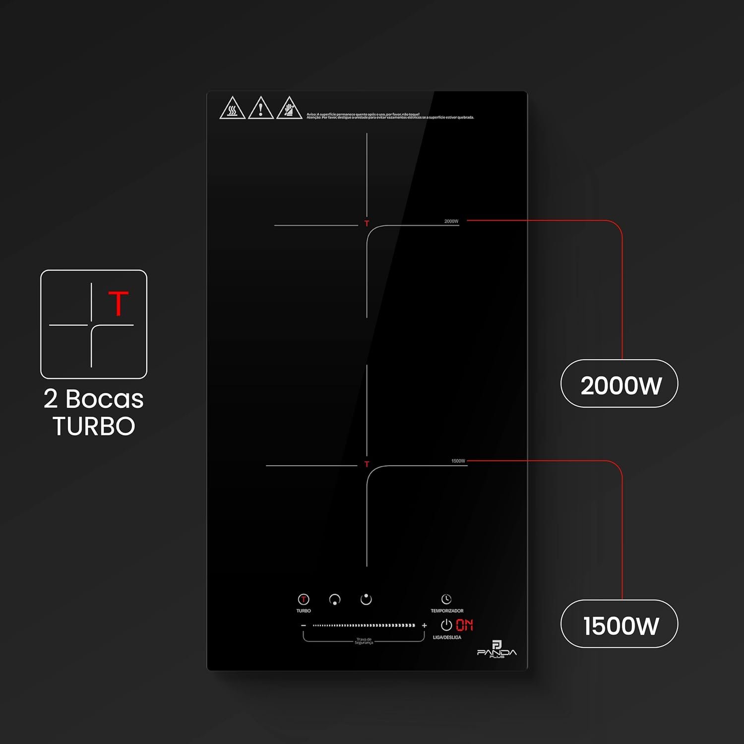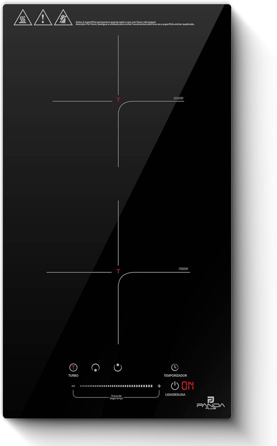 Cooktop Indução 2 Bocas PandaPlus 3500W Preto Turbo 220V Embutir Bancada Vitrocerâmico Touch Trava Segurança