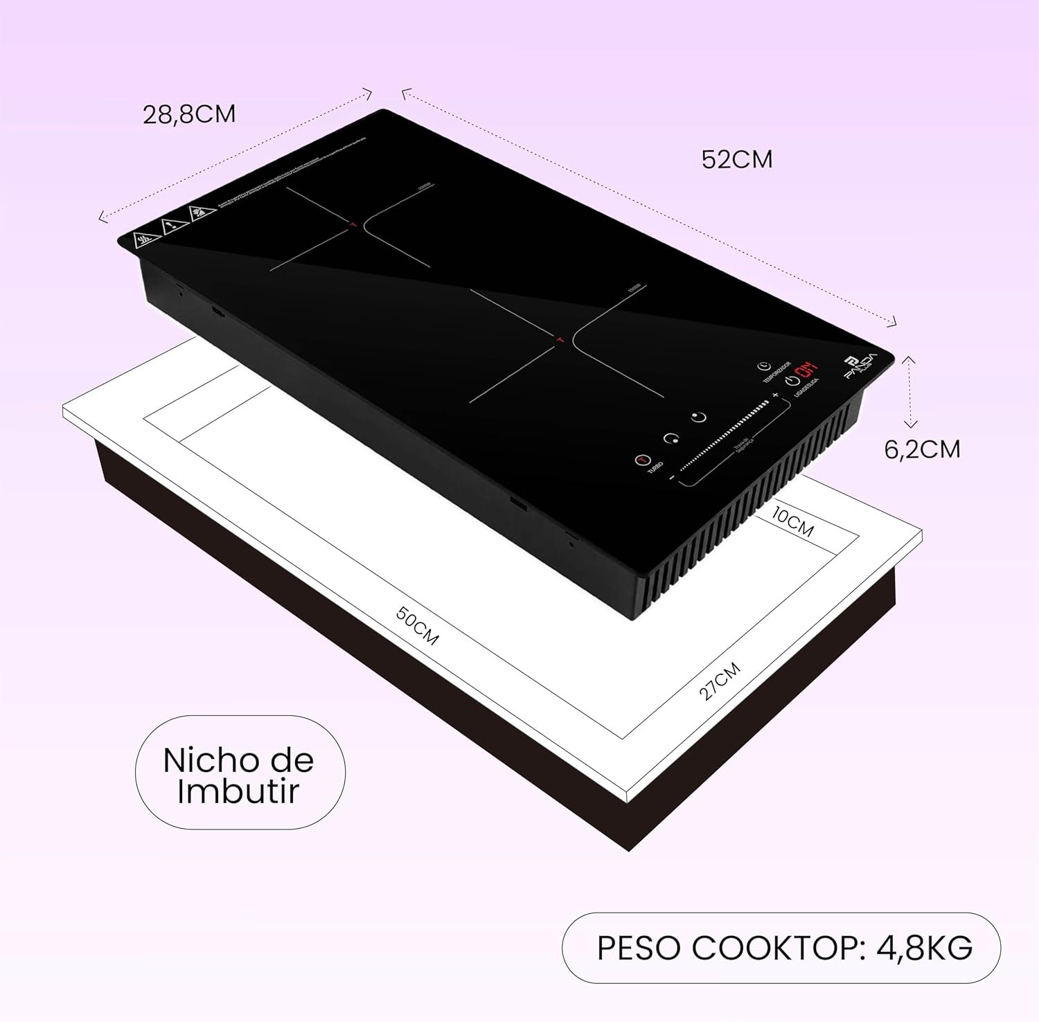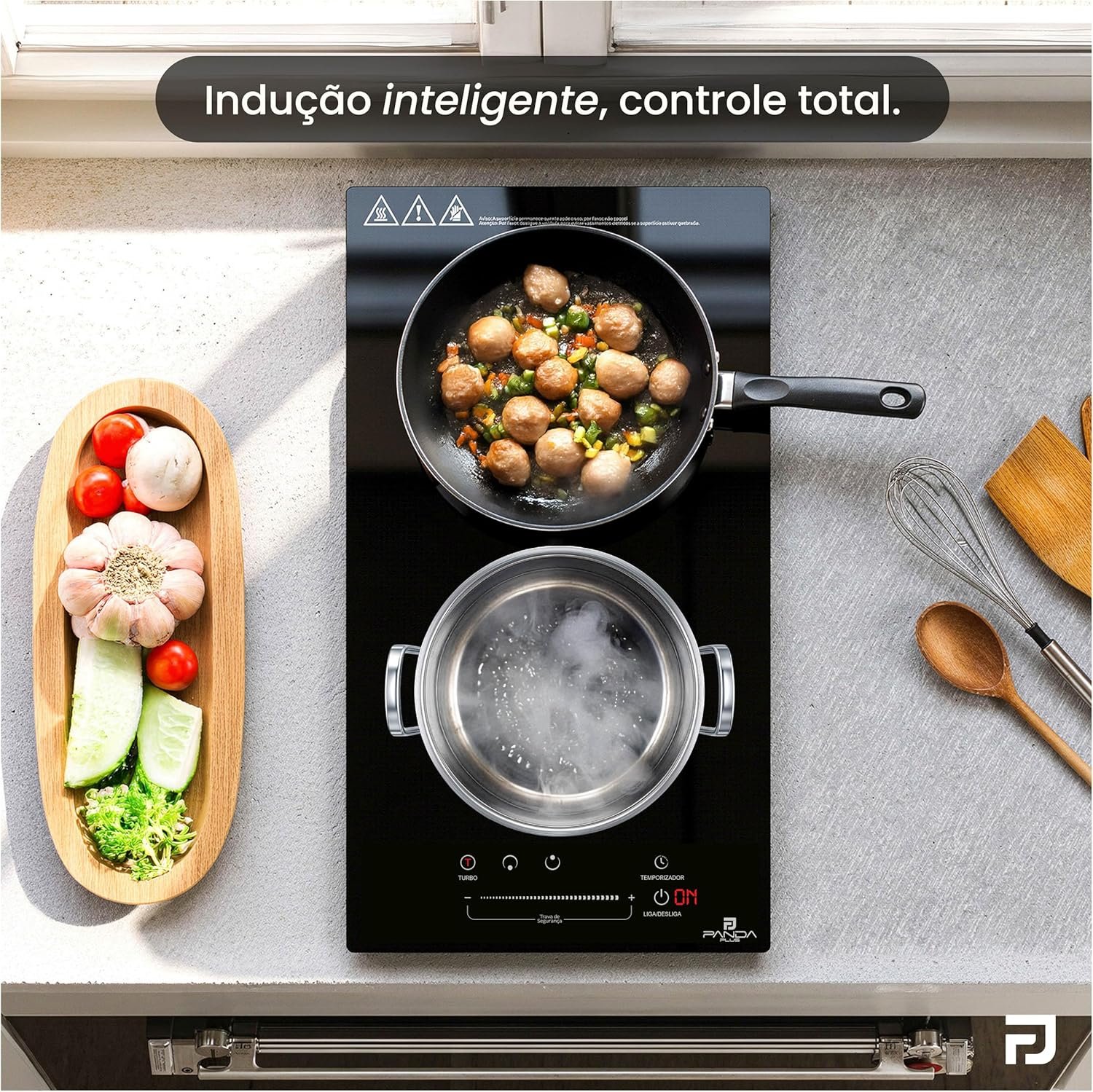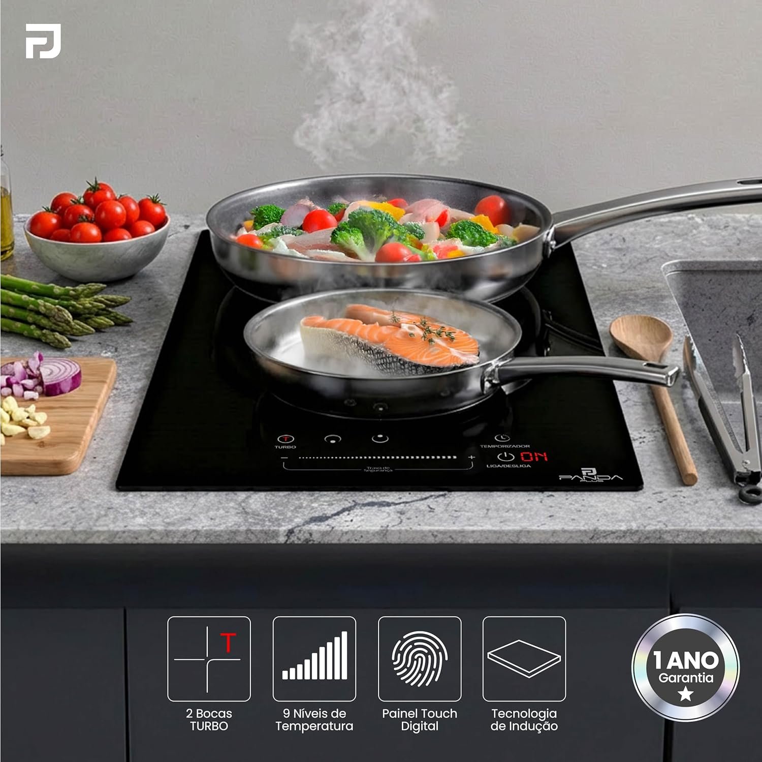Cooktop Indução 2 Bocas PandaPlus 3500W Preto Turbo 220V Embutir Bancada Vitrocerâmico Touch Trava Segurança