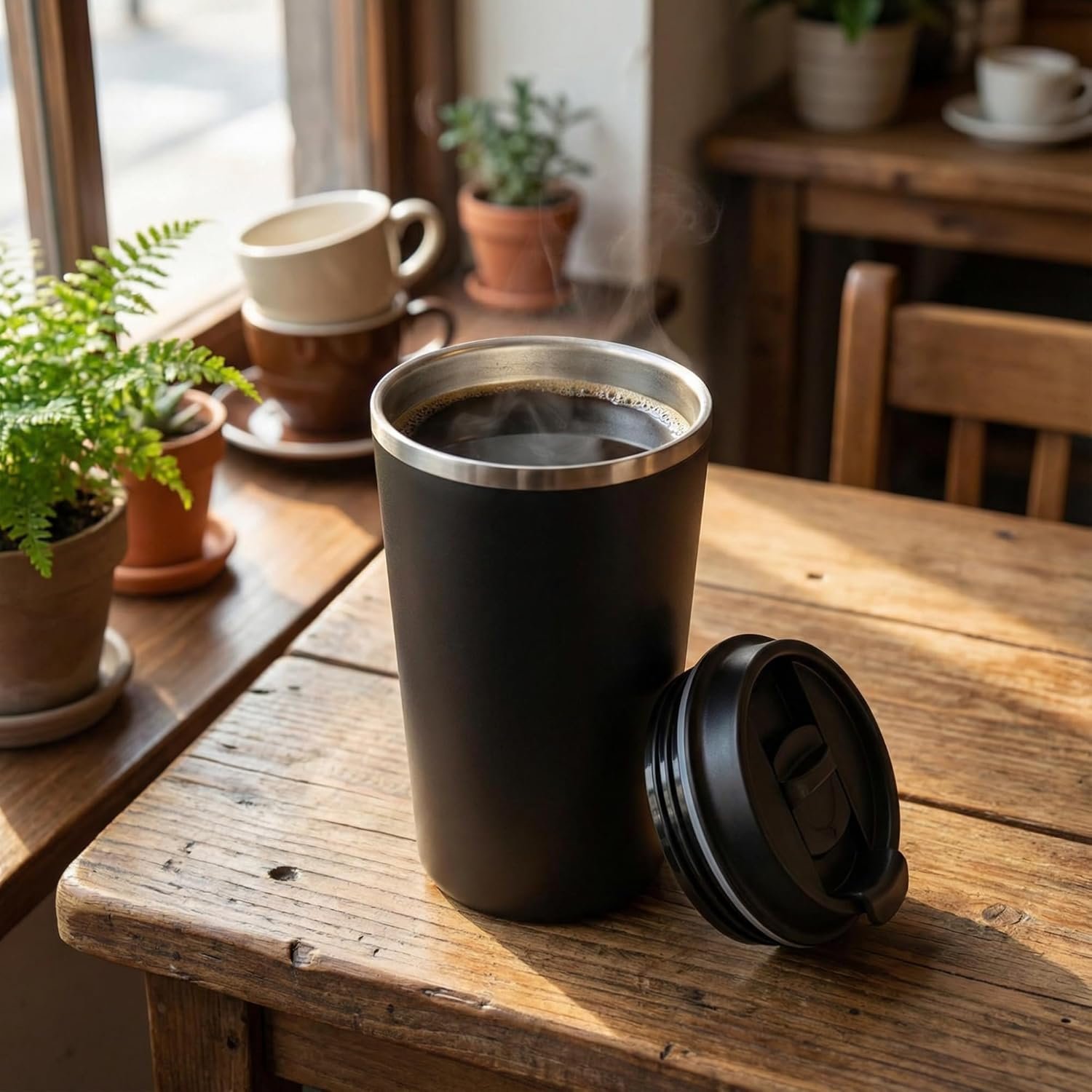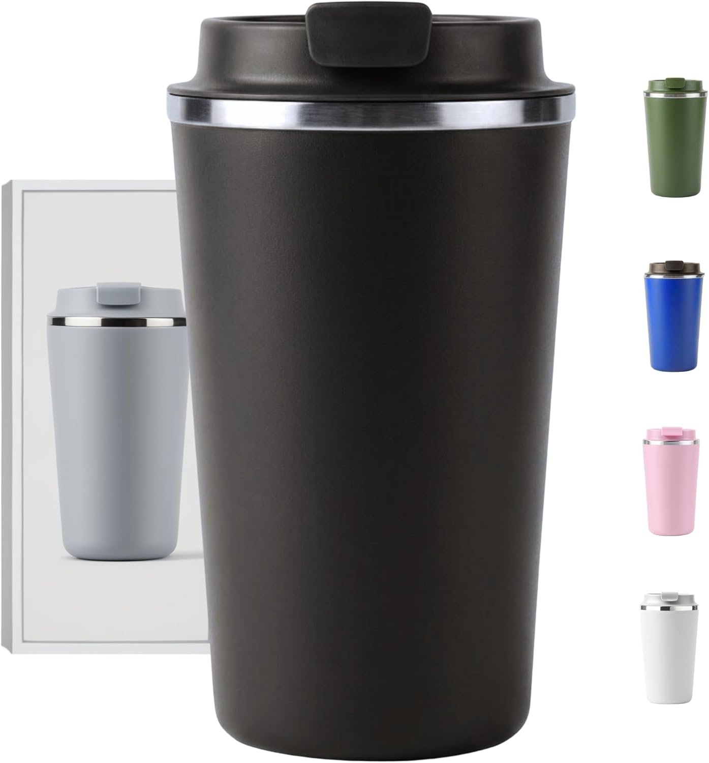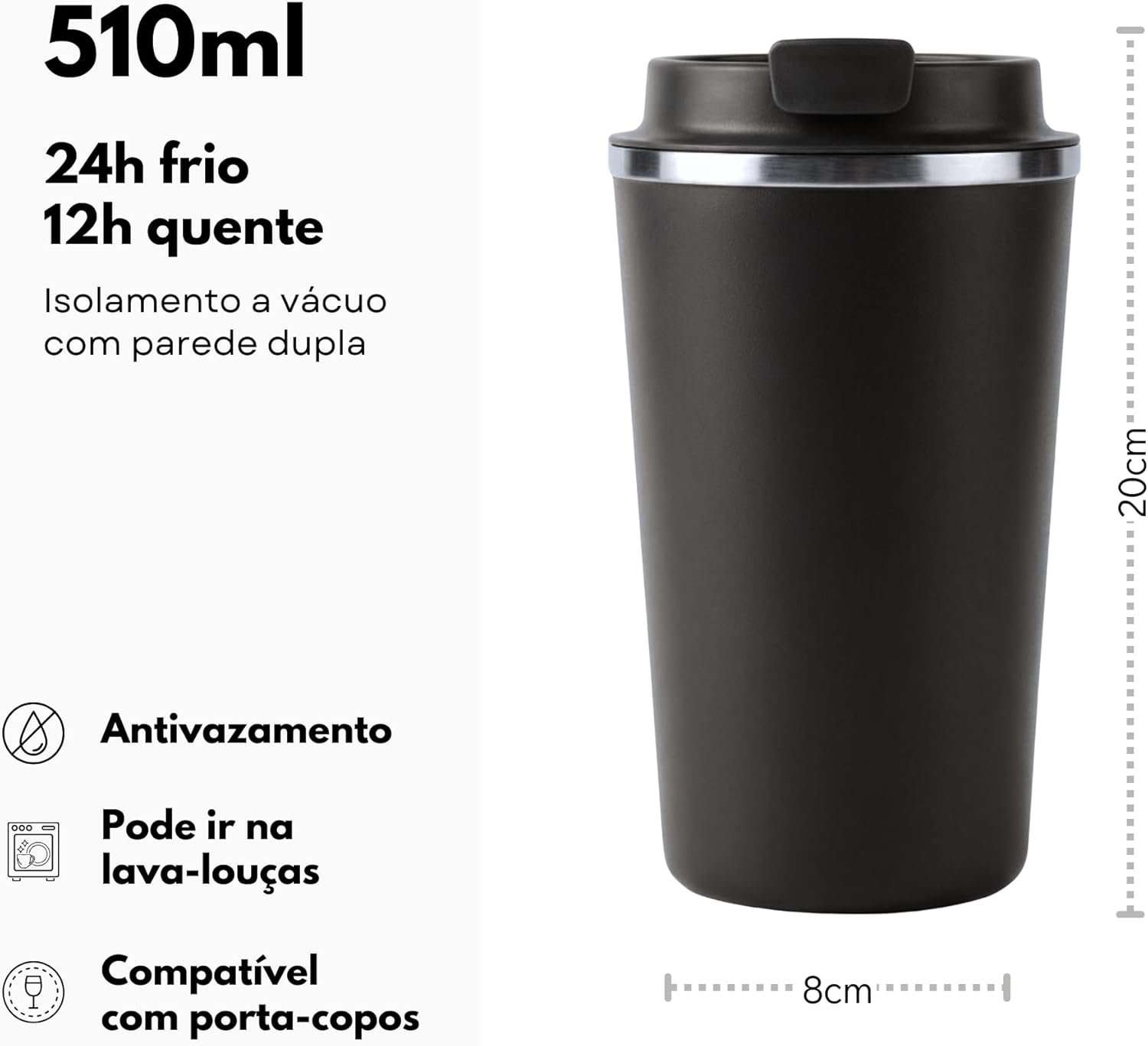 Copo Térmico Café – 510ml, Parede Dupla Isolamento Inox 304, Base Emborrachada, Quente 6 horas, Feito Para Viagem To Go (Preto)