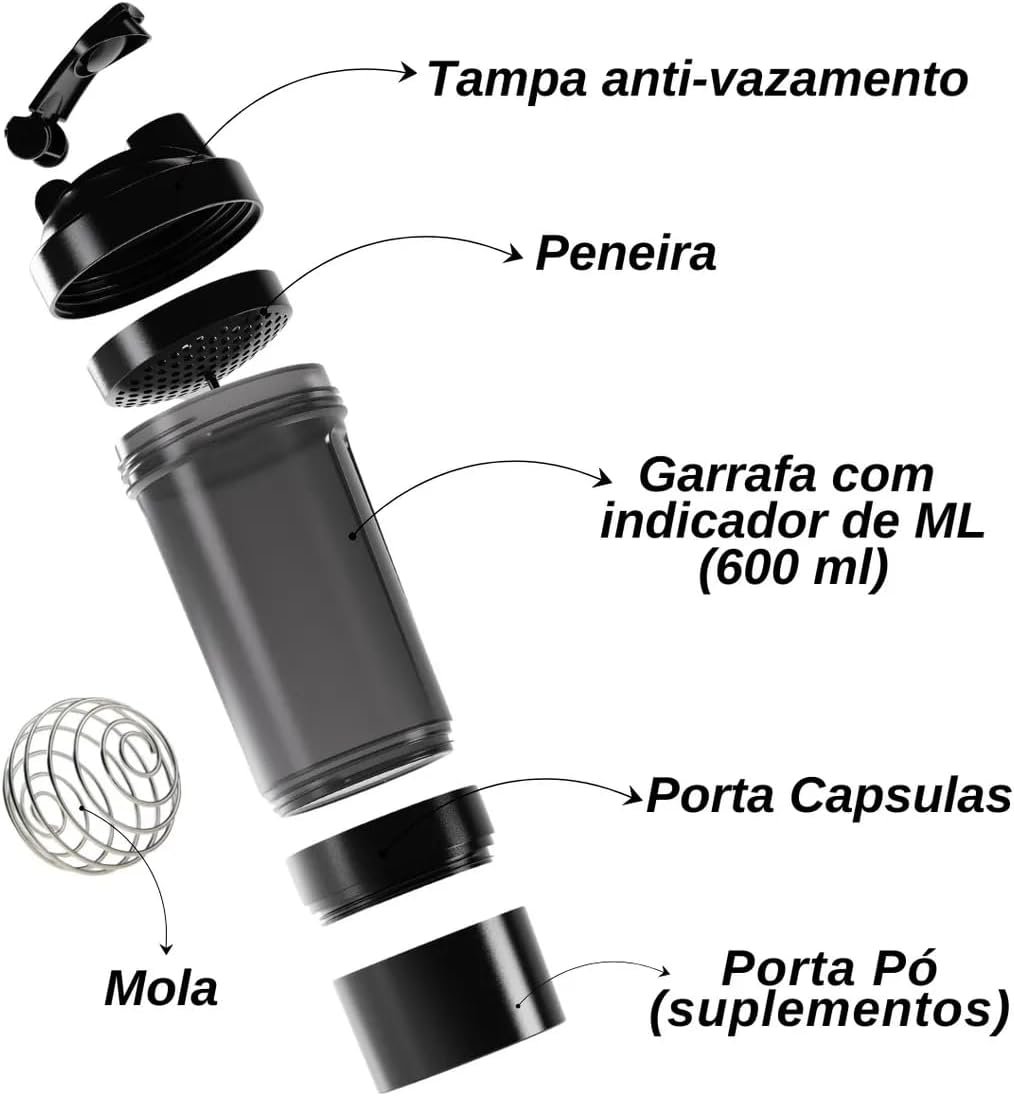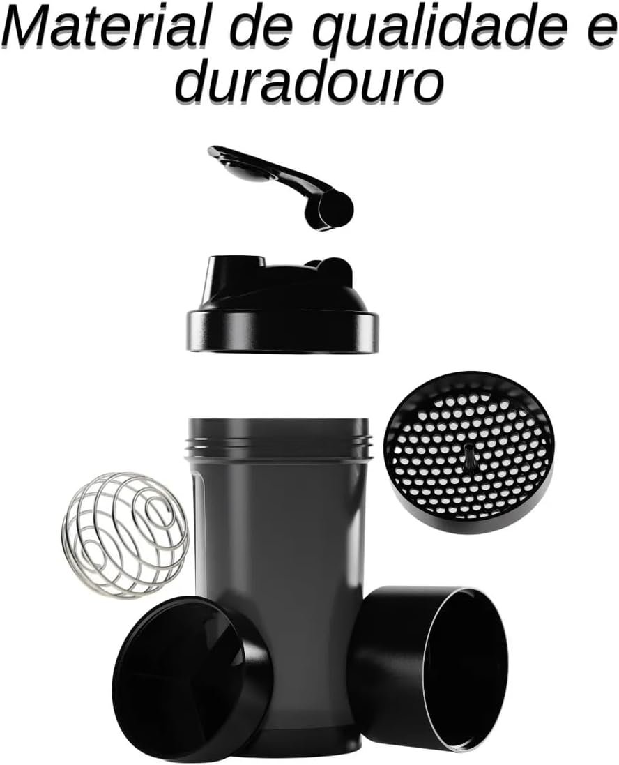 Coqueteleira Shaker Academia Compartimento Suplementos Divisórias 500ml (Preto)