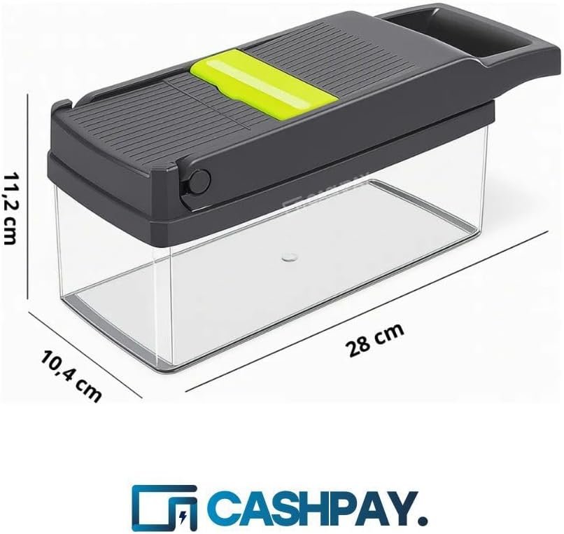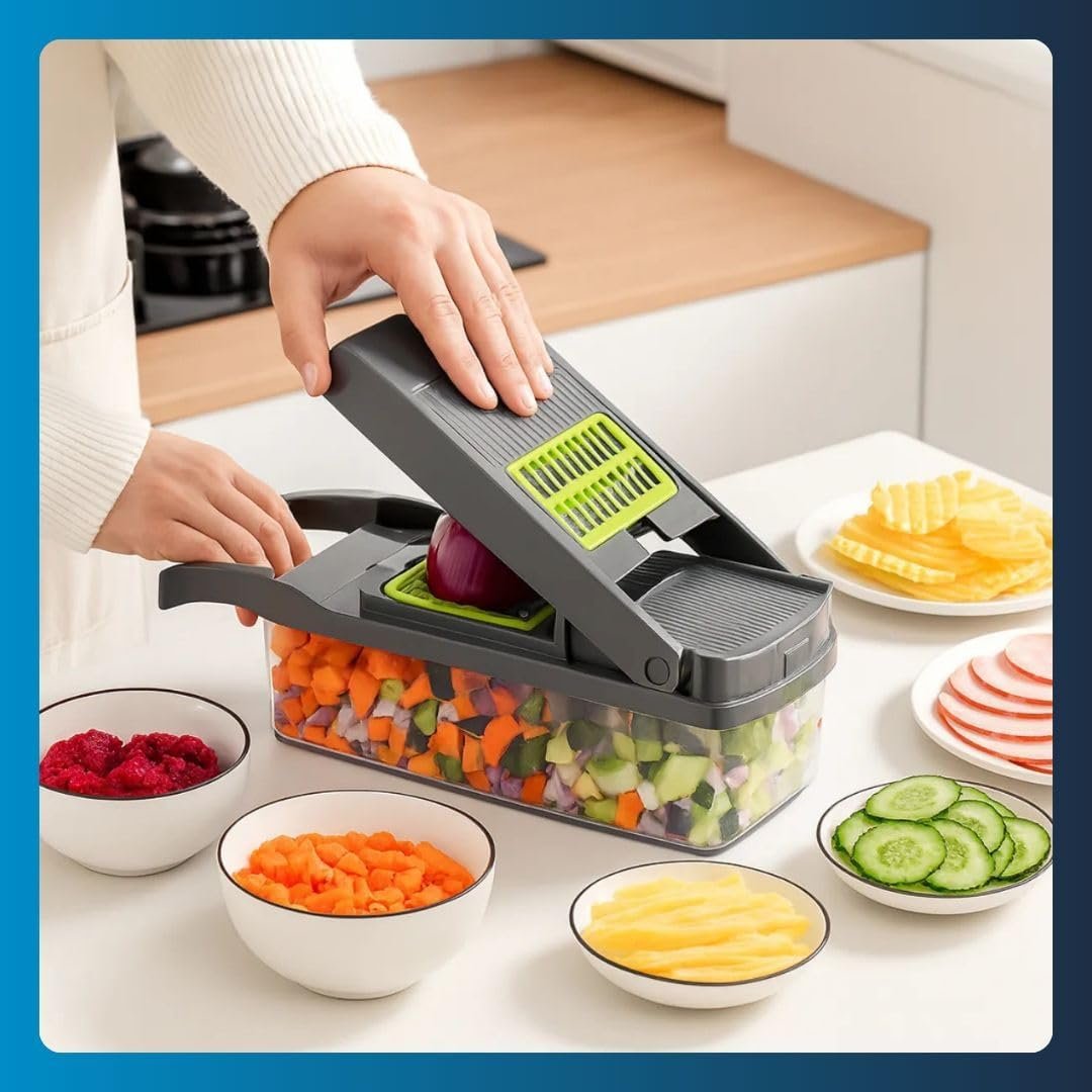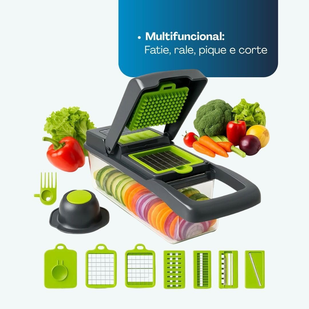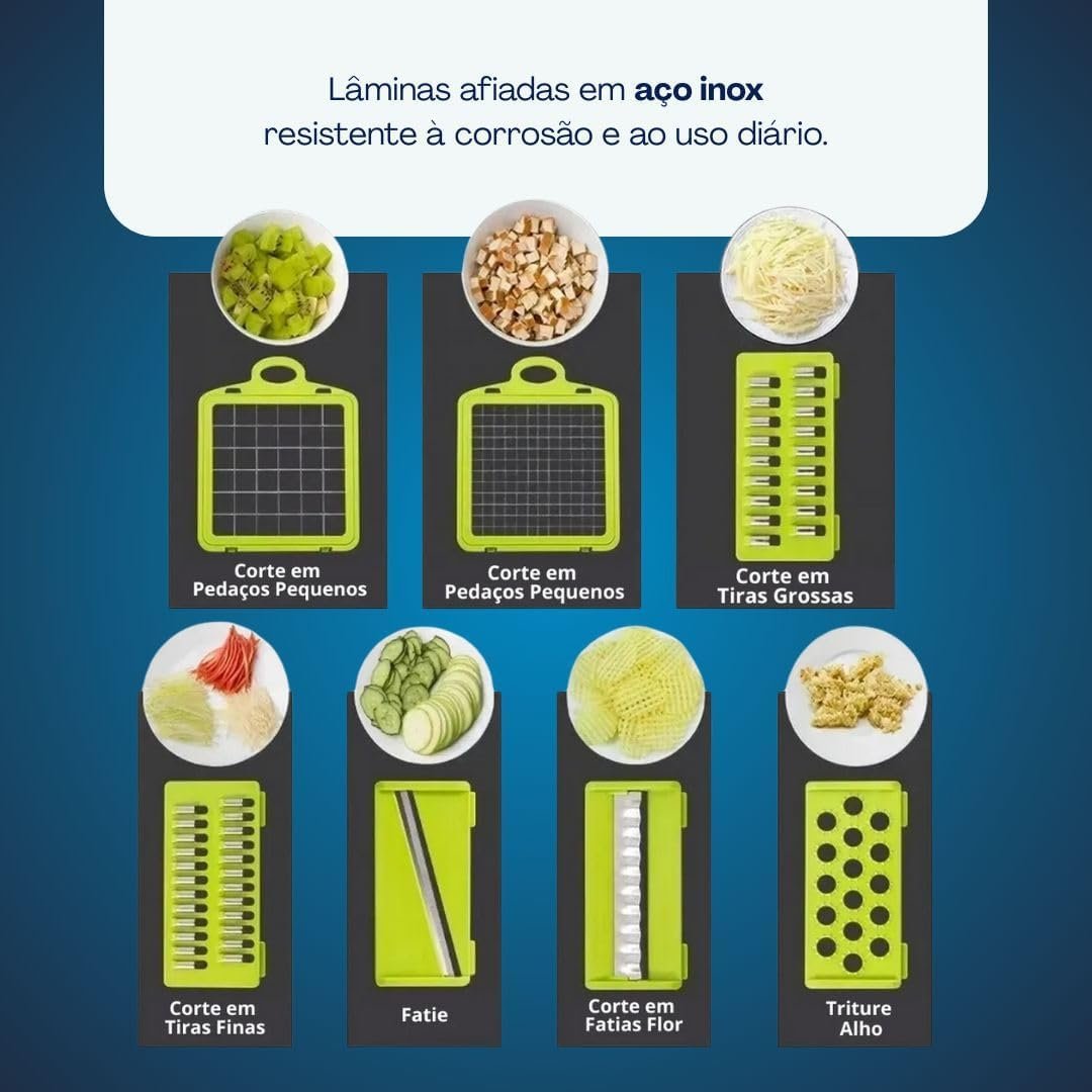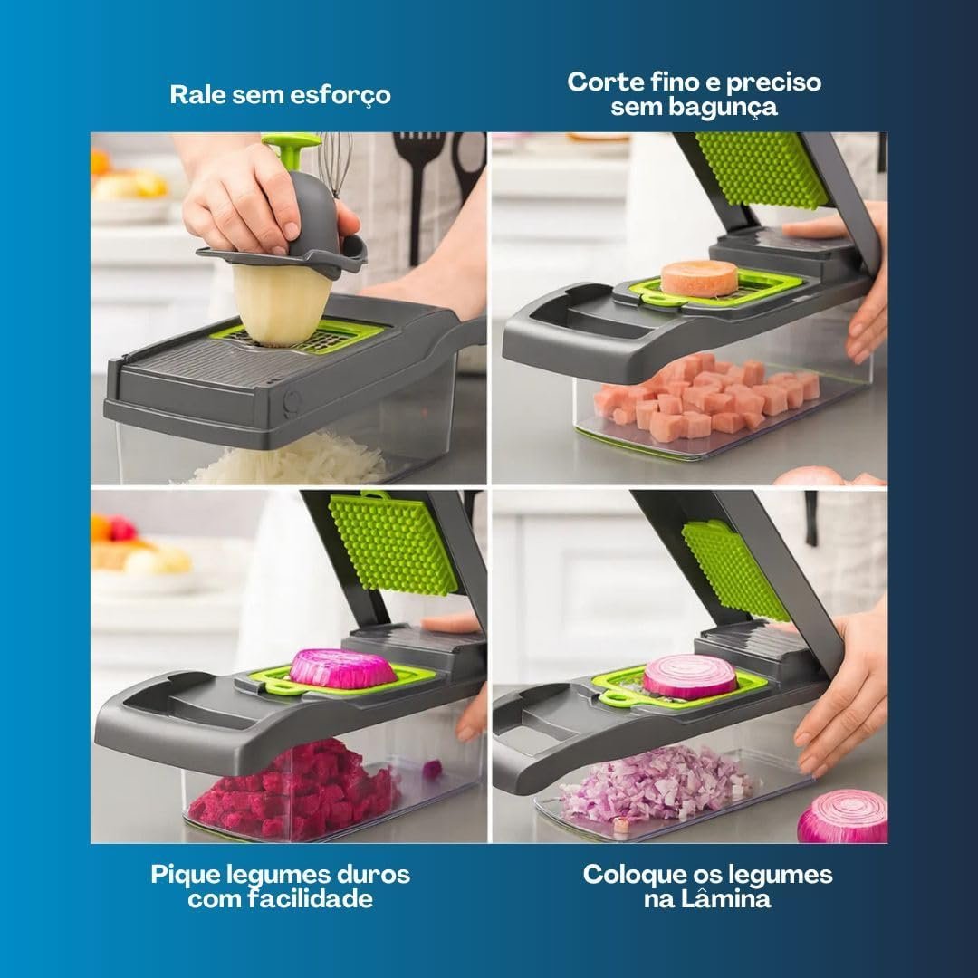 Cortador e Fatiador 16 em 1 Para Alimentos Frutas Legumes Cebola Alho Multifuncional com Lâminas de Aço Inox e Base Antiderrapante Premium