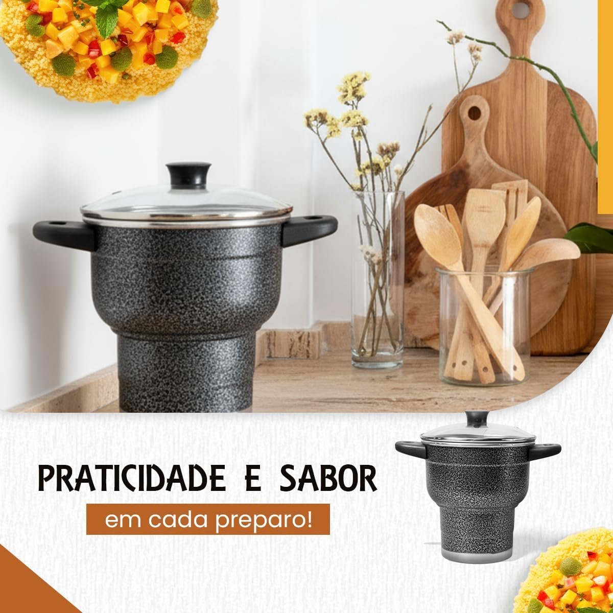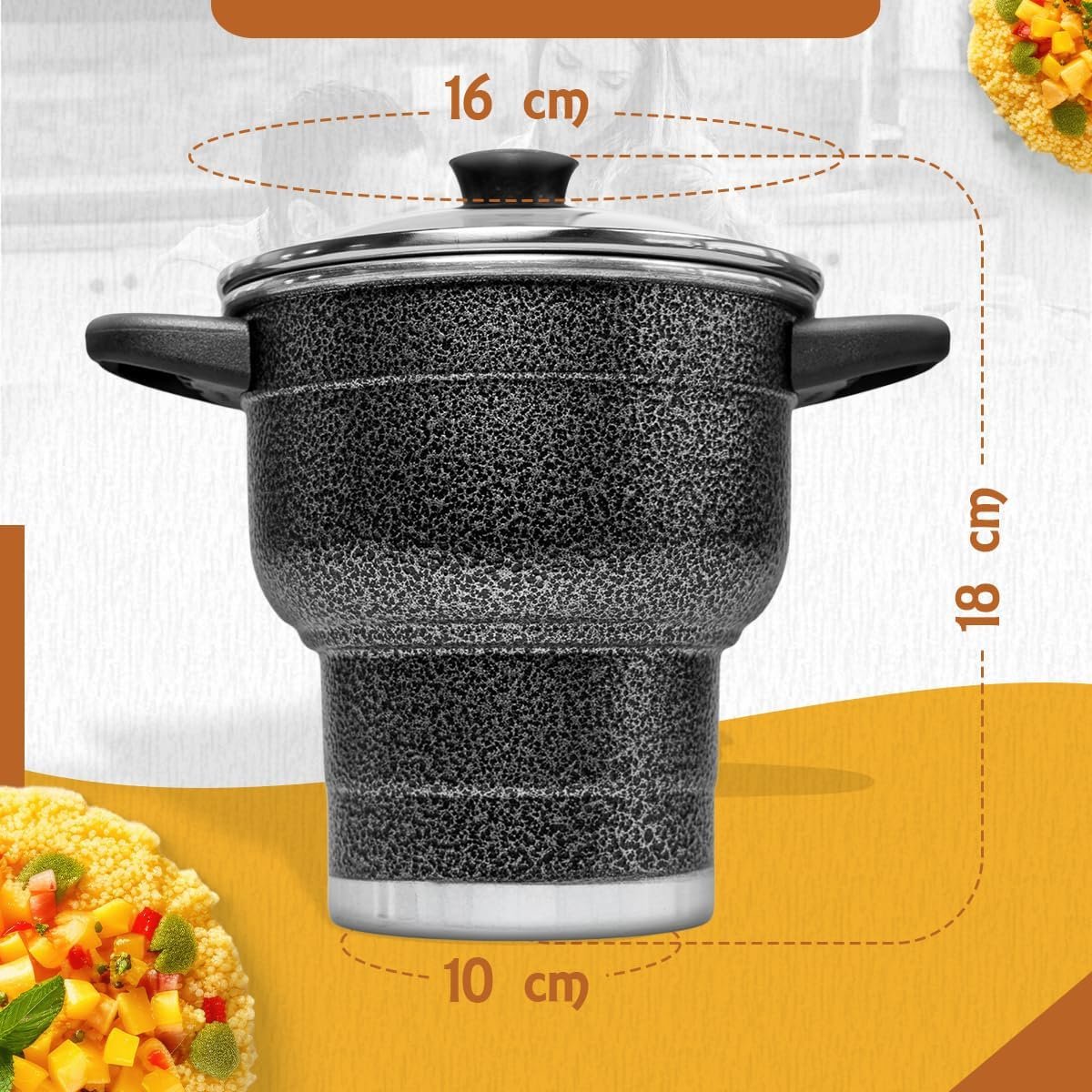 Cuscuzeira 16 Granitta Cuscuzeiro Craquelado Tampa de Vidro Com Válvula de Vapor Inox Resistente Revestimento Externo