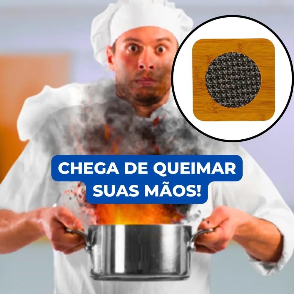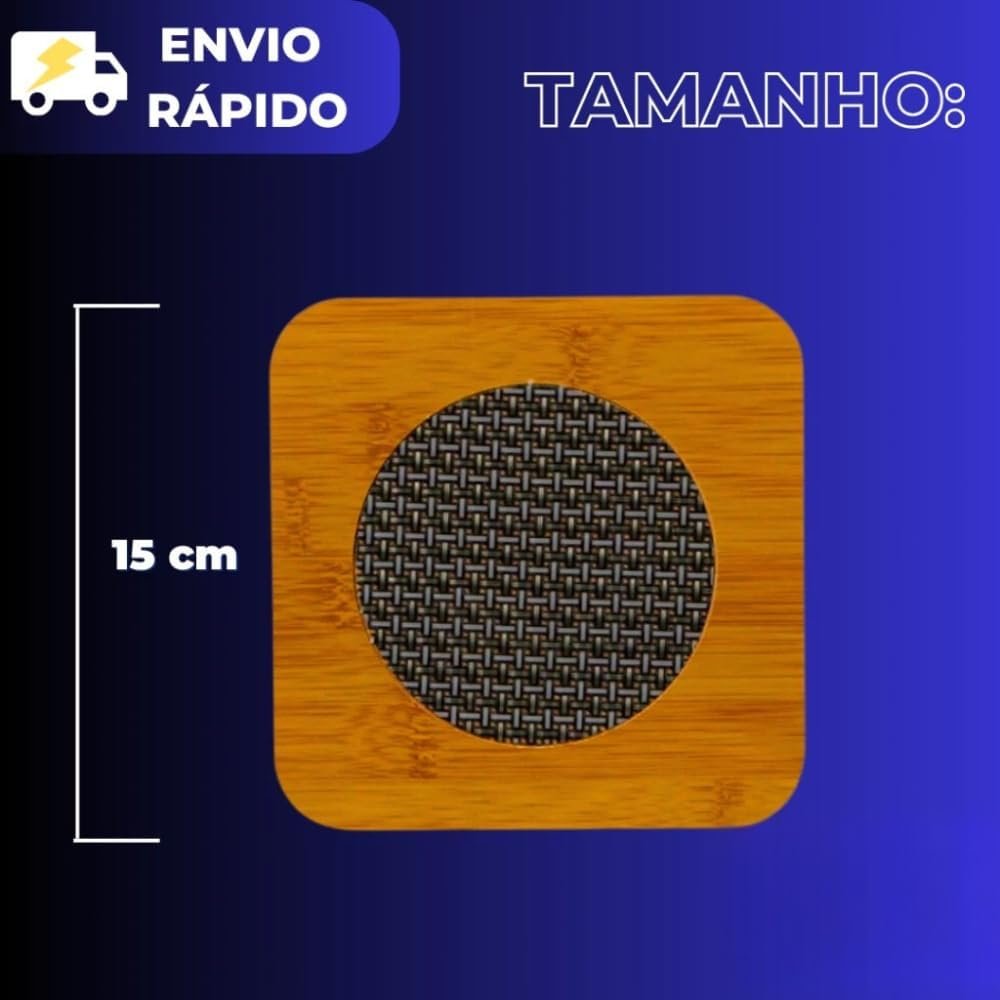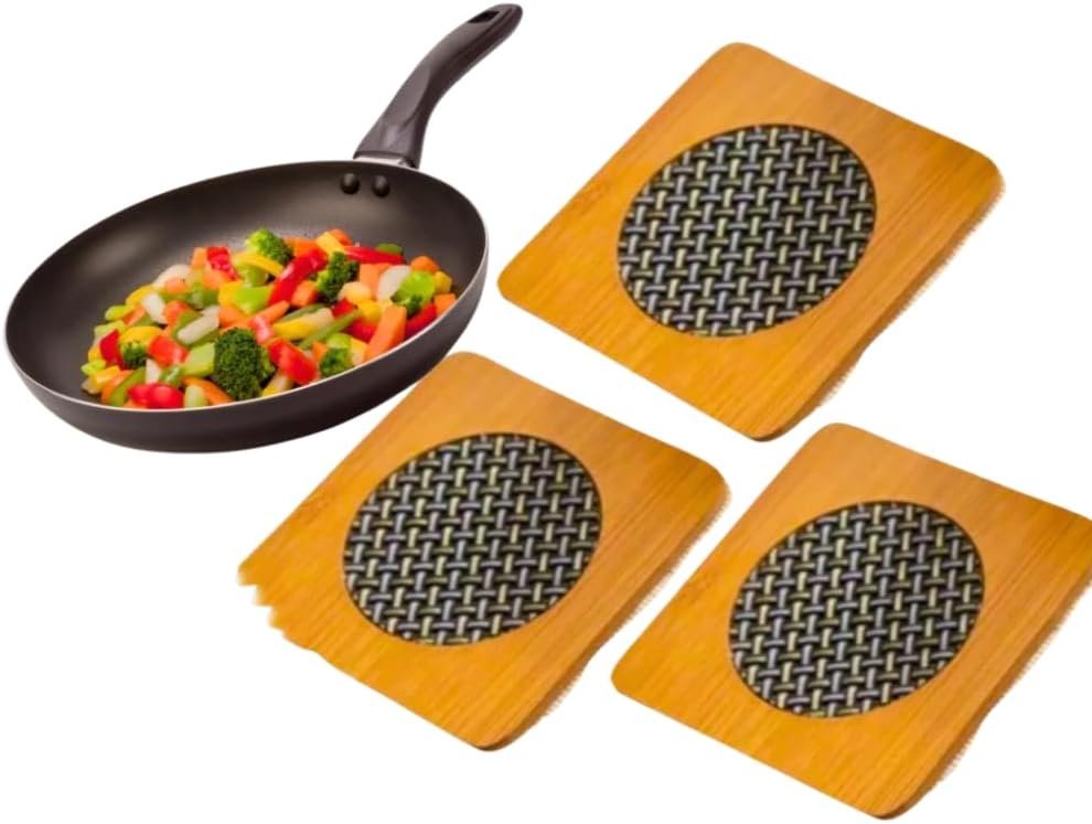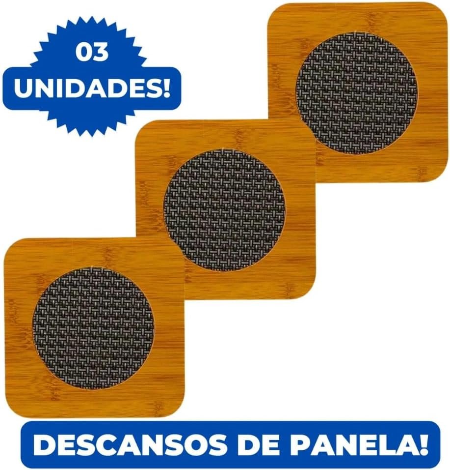 Descanso de Panela em Bambu com Centro Inox, Design Quadrado e Redondo, Kit com 3 Peças (Quadrado)