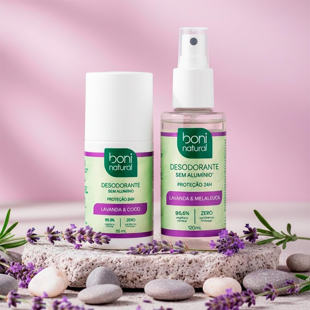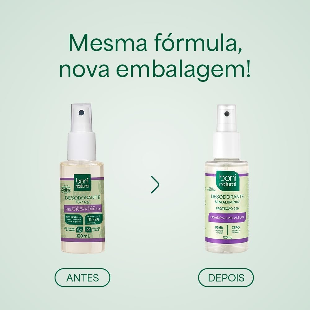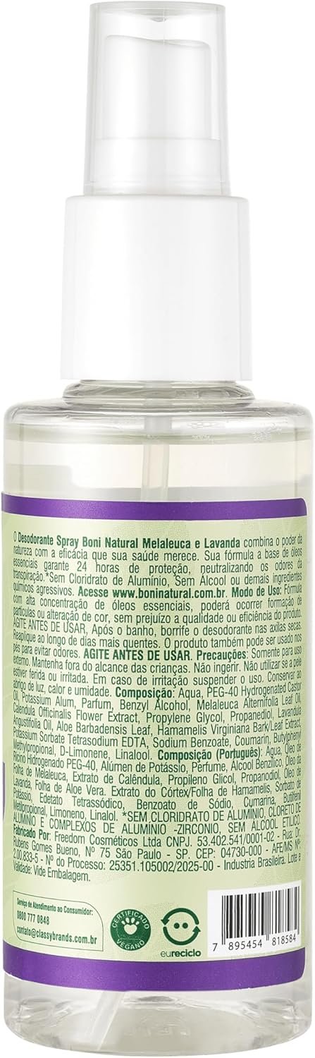 Desodorante Spray Natural e Vegano com Óleos Essenciais de Melaleuca e Lavanda, 24 horas de proteção, Sem Alumínio, Sem Parabenos, Sem Triclosan, Boni Natural, 120ml