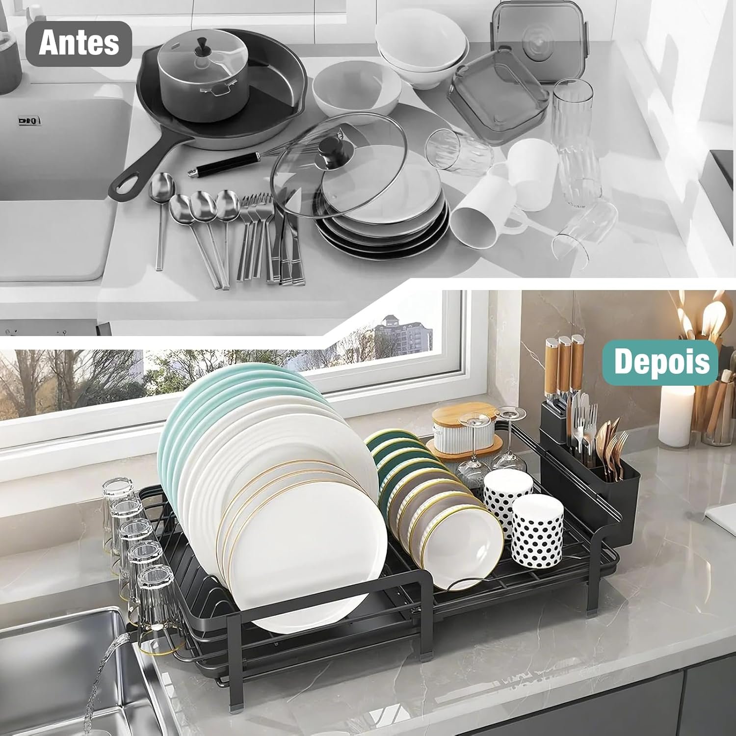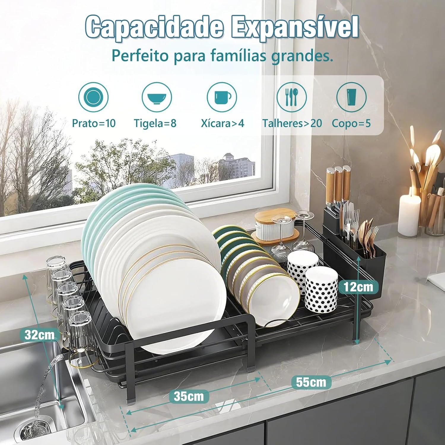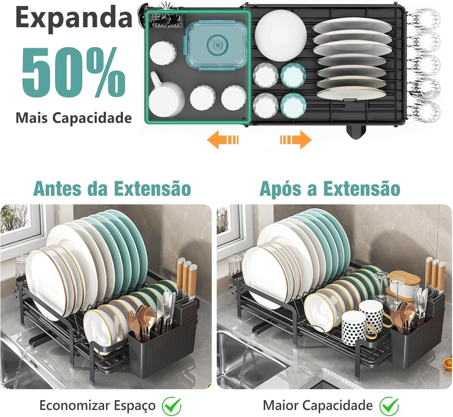 DF Escorredor de Louça Expansível (35-55 cm) para Bancada de Cozinha, Escorredor de Pratos com Suporte para Copos e Bandeja Coletora, Alta Capacidade, Preto